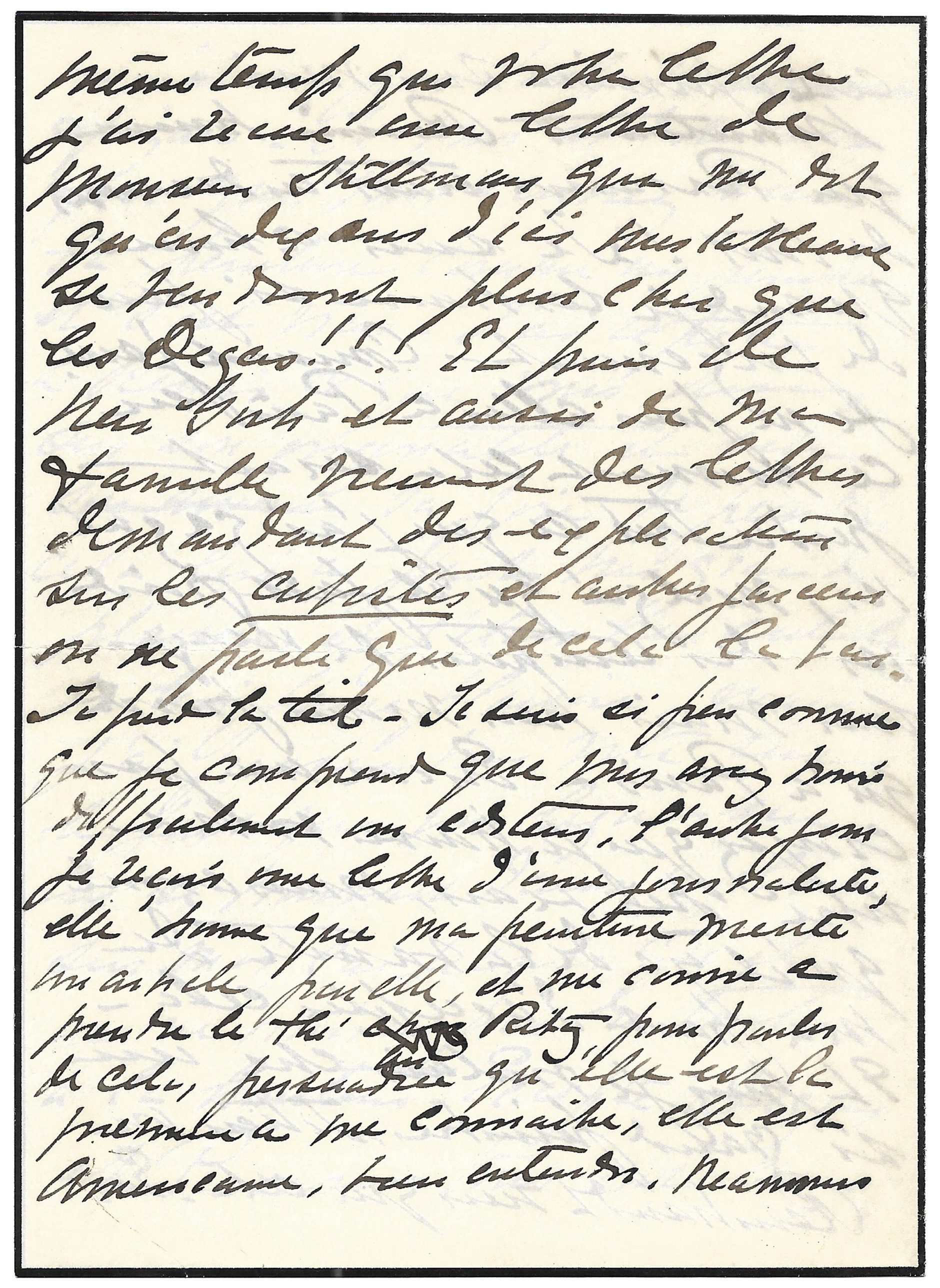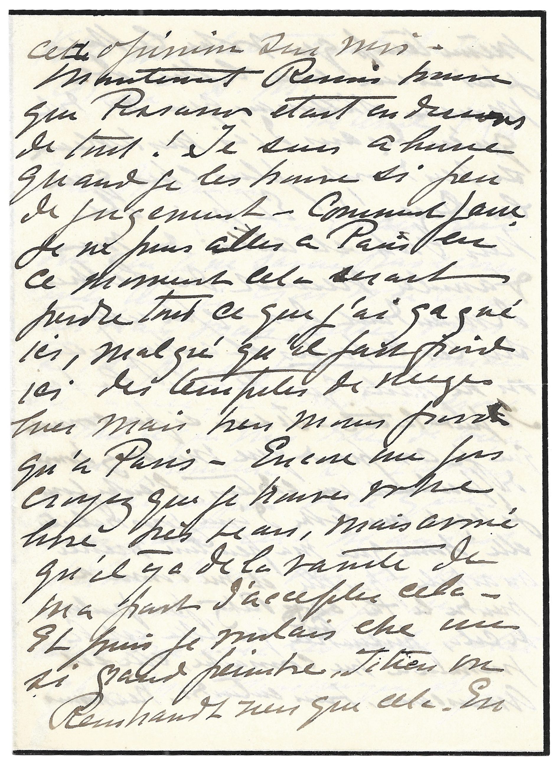 Excepté Degas et Pissarro, tous ont eu cette opinion sur moi. Maintenant, Renoir trouve que Pissarro était en-dessous de tout ! Je suis ahurie quand je les trouve [sic] si peu de jugement – Comment faire. Je ne puis plus aller à Paris en ce moment cela serait perdre tout ce que j’ai gagné ici, malgré qu’il fait froid ici des tempêtes de neiges hier, mais bien moins froid qu’à Paris – Encore une fois, croyez que je trouve votre livre très beau, mais avoué [sic] qu’il y a de la vanité de ma part d’accepter cela. Et puis je voulais être un si grand peintre, Titien ou Rembrandt, rien que cela.