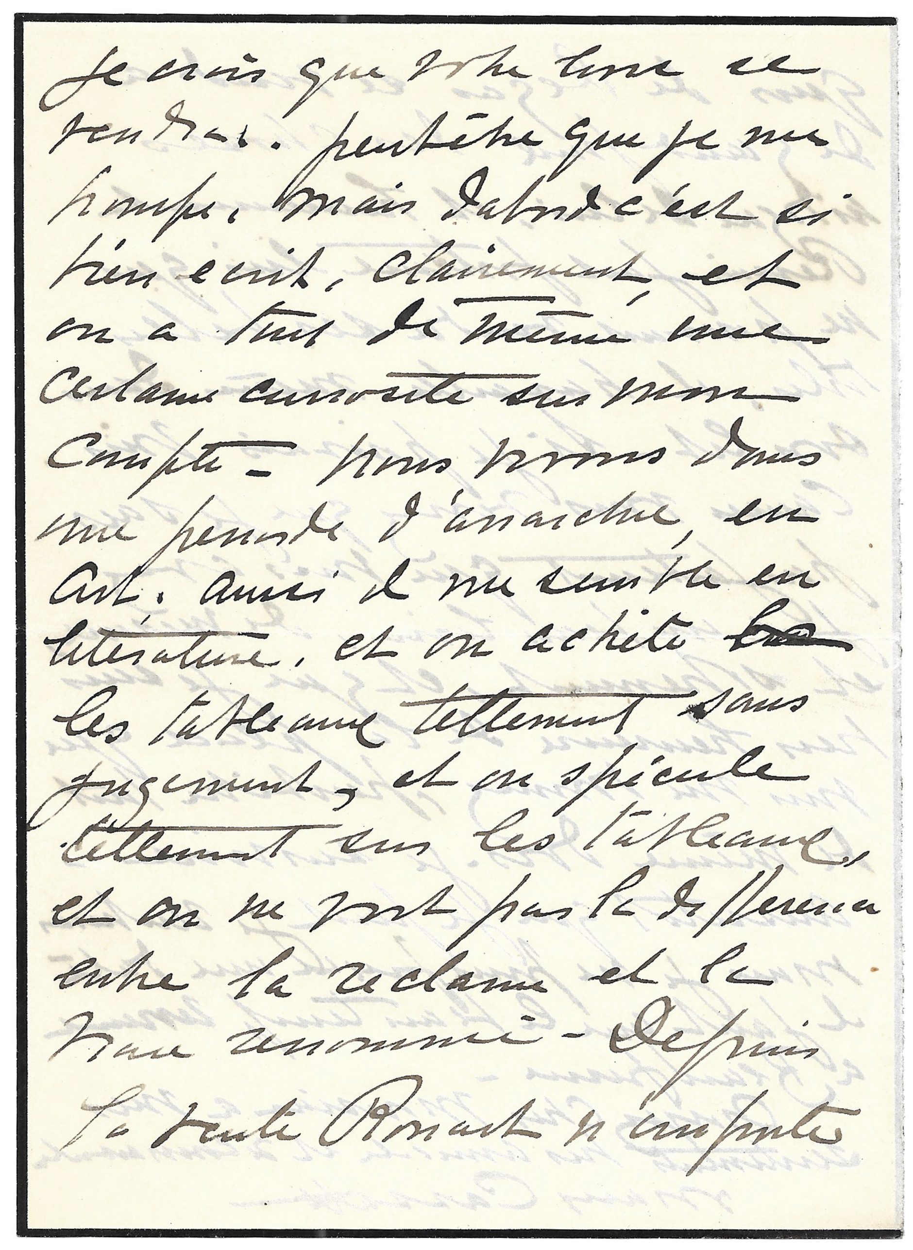 Néanmoins, je crois que votre livre se vendra. Peut-être que je me trompe, mais d’abord c’est si bien écrit, clairement, et on a tout de même une certaine curiosité sur mon compte. Nous vivons dans une période d’anarchie, en art ; aussi, il me semble en littérature, et on achète les tableaux tellement sans jugement, et on spécule tellement sur les tableaux, et on ne voit pas la différence entre la réclame et la vraie renommée – Depuis la vente Rouart**** n’importe quoi de Degas se vend à de grands prix, des choses indignes de lui, et heureusement Renoir fait fortune, lui qui ne pouvait vendre ses belles toiles, il travaille même dans son lit.