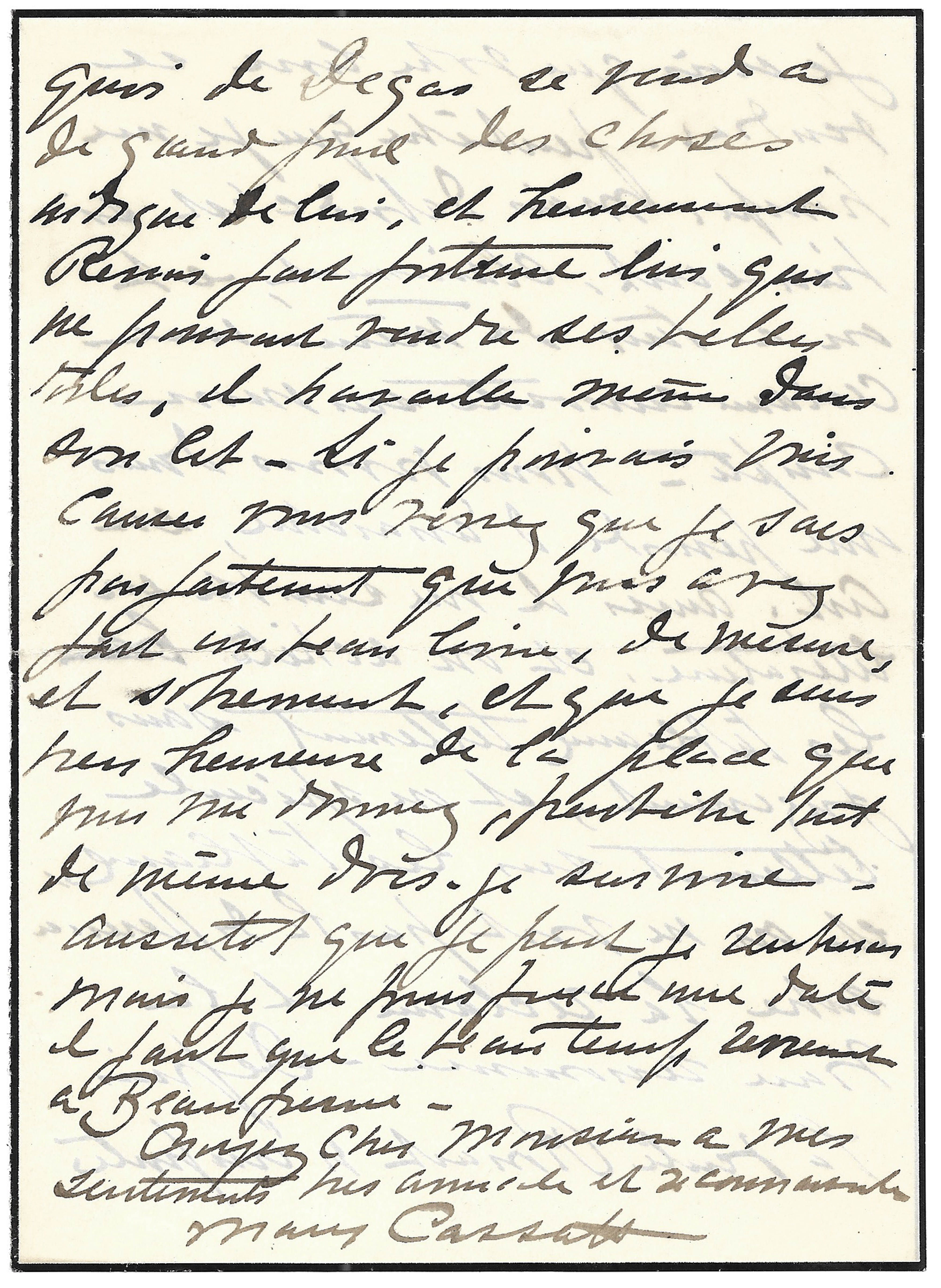 Si je pouvais vous causer, vous verrez que je sais parfaitement que vous avez fait un beau livre, de mesure, et sobrement, et que je suis très heureuse de la place que vous me donnez, peut-être tout de même dois-je survivre – Aussitôt que je peux je rentrerais mais je ne puis fixer une date il faut que le beau temps revienne à Beaufresnes*****. Croyez cher Monsieur à mes sentiments très amicals [sic] et reconnaissants. Mary Cassatt. »