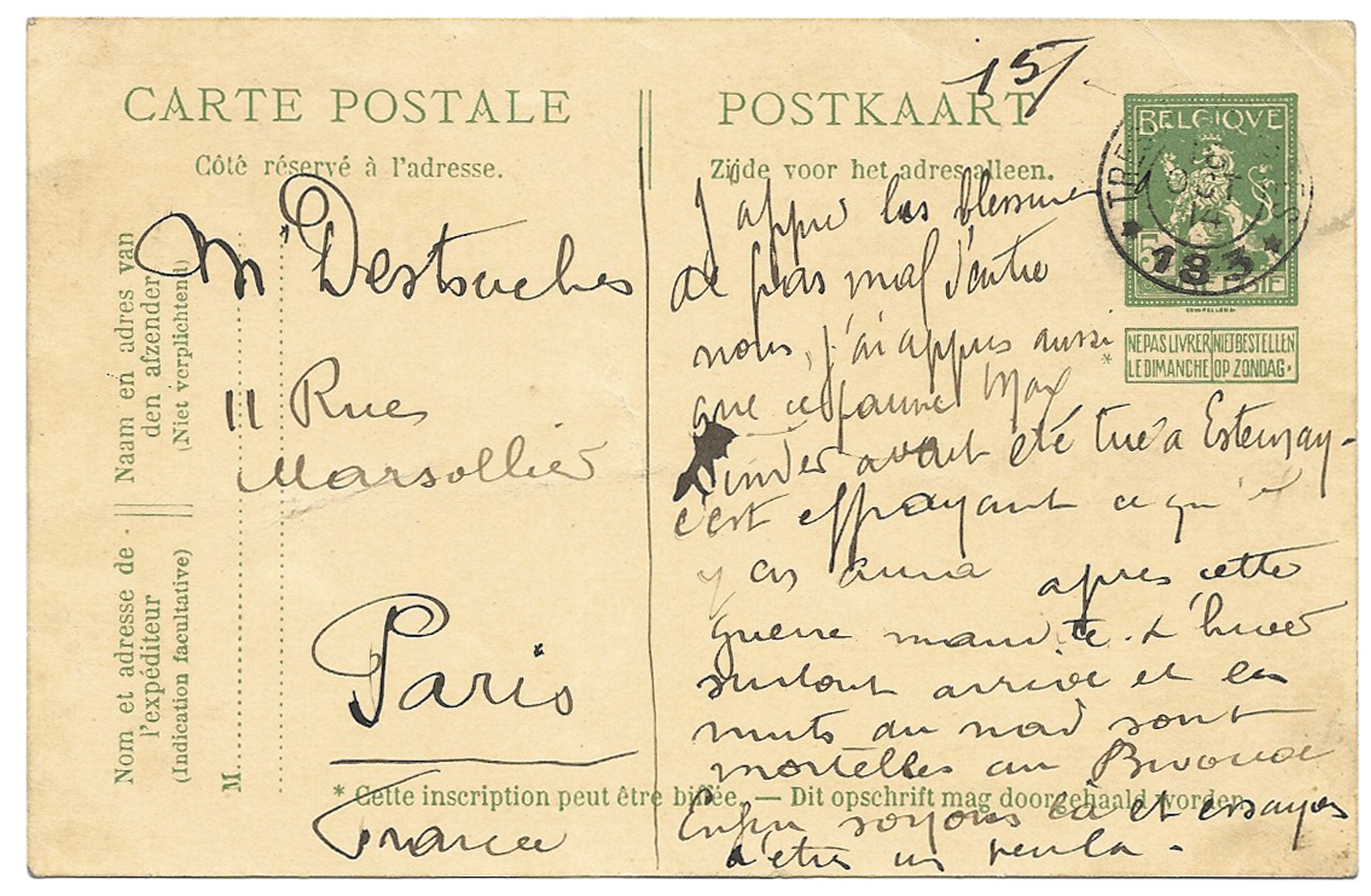 Céline, qui n’est encore que Louis Destouches, est nommé, en mai 1914, maréchal des logis après avoir rejoint deux ans plus tôt le 12e régiment de cuirassiers à Rambouillet, en qualité d’engagé. Le jeune soldat est mobilisé aux premières heures de la guerre, dès le 1er août. Il part pour la Woëvre, où il fait campagne jusqu’au 1er octobre 1914, date à laquelle il se rend en Flandres. Comme le témoigne sa carte, Destouches évoque les scènes de chaos dont il est le témoin direct. Ce sont ces visions d’horreur qui s’inscrivent au plus profond de son esprit, comme l’éclat d’obus qui s’inscrira bientôt dans sa chair. Cette époque charnière de sa vie formera en lui « mille pages de cauchemars en réserve », comme il le confiera à Joseph Garcin au moment où il commencera à écrire Voyage au bout de la nuit : « Celui de la guerre tient naturellement la tête. Des semaines de 14 sous les averses visqueuses, dans cette boue atroce et ce sang et cette merde et cette connerie des hommes, je ne m’en remettrai pas » (Lettres, Pléiade n°30-6).