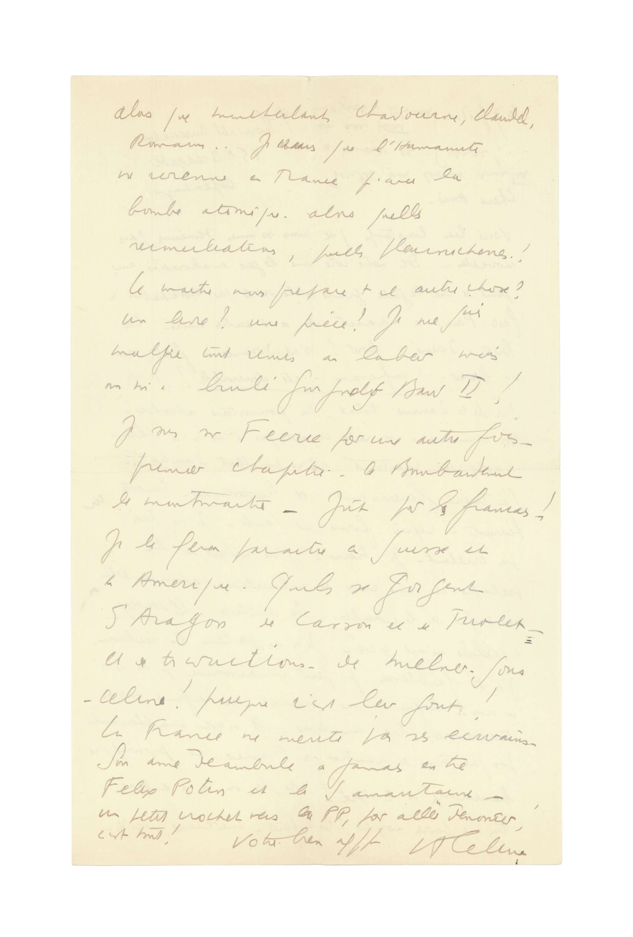 « Chers amis, Voici bien longtemps que nous sommes demeurés sans nouvelles. De notre côté une légère amélioration au point de vue légal grâce à la visite que Mikkelsen a faite à Paris à Naud et à d’autres amis. La Butte a donné à fond ! s’est donné à fond en ma faveur. L’impression a été admirable ! Je ne suis plus le damné total, la pourriture absolue. On commence à se rendre compte que l’on m’a bien martyrisé injustement alors que tant d’autres… s’en tirent glorieusement et fructueusement. Lucette heureusement a repris forme et santé. Je ne suis pas brillant. Je traîne. J’ai refait de la pellagre et une crise de rhumatisme abominable en dépit de la chaleur. La cellule, les hivers en cellule m’ont crevé. Je n’ai pas tenu la réclusion. J’ai des faiblesses, je perds connaissance pour un oui, un non. Enfin on me promet un régime moins tracassier, bien amélioré. Il n’est malheureusement pas question de rentrer en France, et je souffre beaucoup de l’exil. De plus, on m’a enlevé tous mes pauvres moyens d’existence, médecine, livres… alors que Montherlant, Chadourne, Claudel, Romains… Je crains que l’Humanité ne revienne en France qu’avec la bombe atomique. Alors quelles réconciliations, quelles pleurnicheries ! Le maître nous prépare t- il autre chose ? un livre ? une pièce ? Je me suis malgré tout remis au labeur mais on m’a brulé Guignol’s Band II ! Je suis sur Féérie pour une autre fois, premier chapitre, le bombardement de Montmartre. Fait par les Français ! Je le ferai paraître en Suisse et en Amérique. Qu’ils se gorgent d’Aragon, de Cassou, et de Triolet, et de traductions de Miller sous-Céline ! puisque c’est leur goût ! La France ne mérite pas ses écrivains. Son âme déambule jamais entre Félix Potin et la Samaritaine. LF. Céline. Toutes mes bonnes amitiés à Max et Pierre ! et au petit Mozart Descaves »
