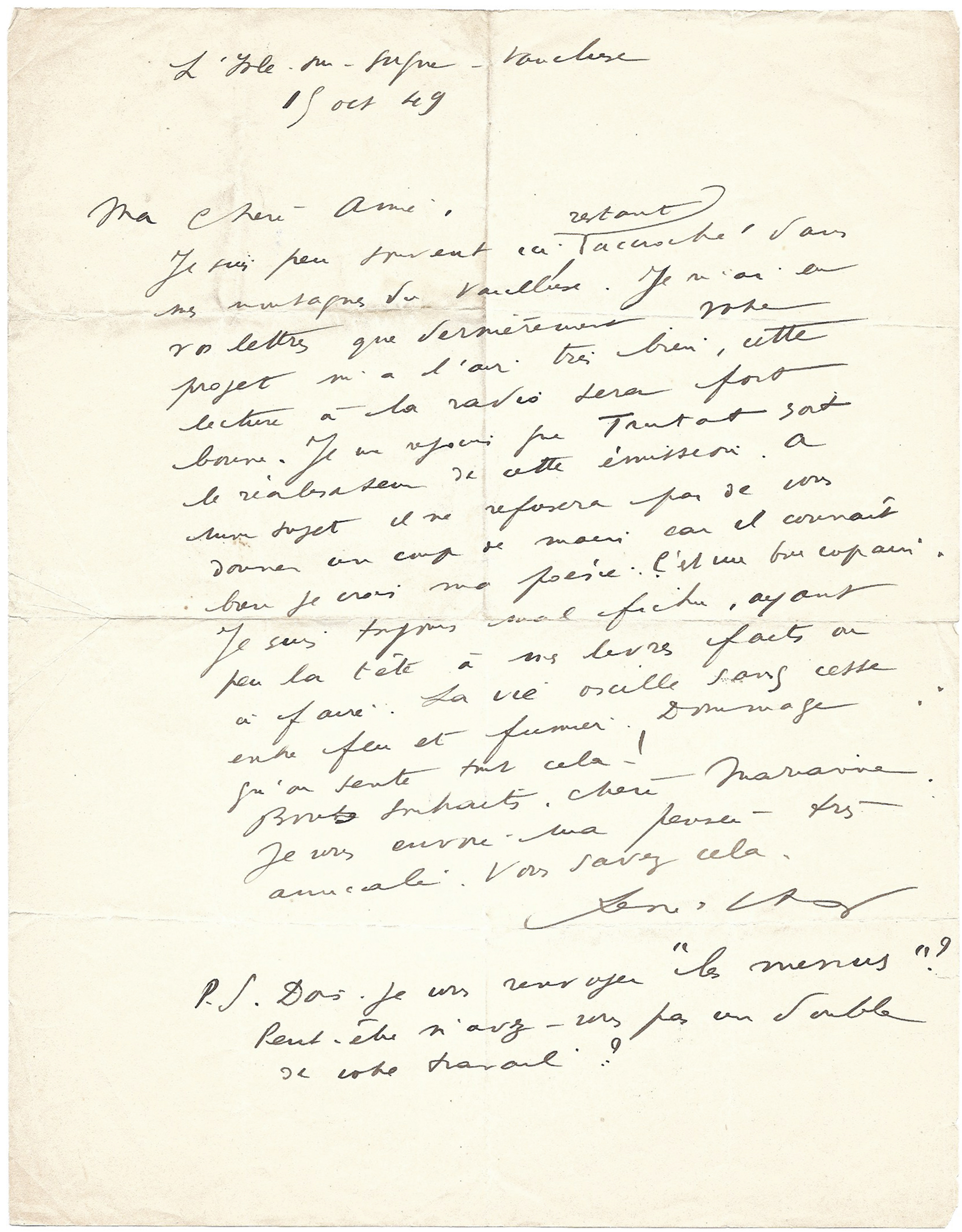L’Isle-sur-Sorgue, 15 oct[obre] [19]49, 1 p. in-4°