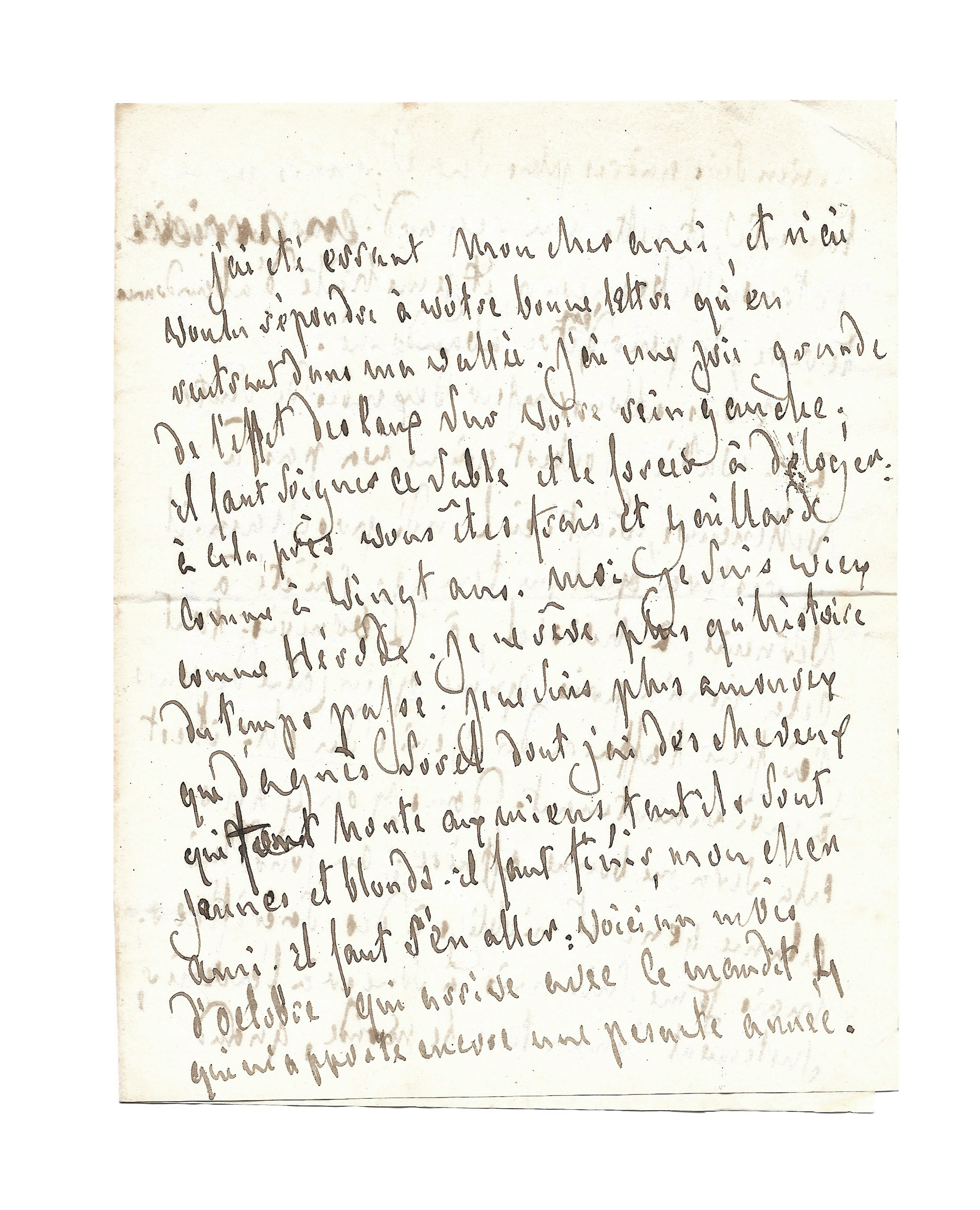 « J’ai été errant mon cher ami, et n’ai voulu répondre à votre bonne lettre qu’en rentrant dans ma vallée. […] Moi je suis vieux comme Hérode. Je ne rêve plus qu’histoire du temps passé. Je ne suis plus amoureux que d’Agnès Sorel dont j’ai des cheveux qui font honte aux miens tant ils sont jeunes et blonds. Il faut finir, mon cher ami. Il faut s’en aller : voici un mois d’octobre qui arrive avec ce maudit 4 [allusion à sa date d’anniversaire, Chateaubriand vient de fêter ses 44 ans] qui m’a apporté encore une pesante année.
