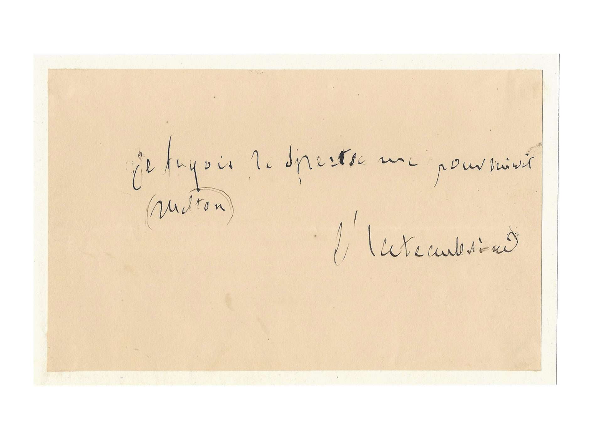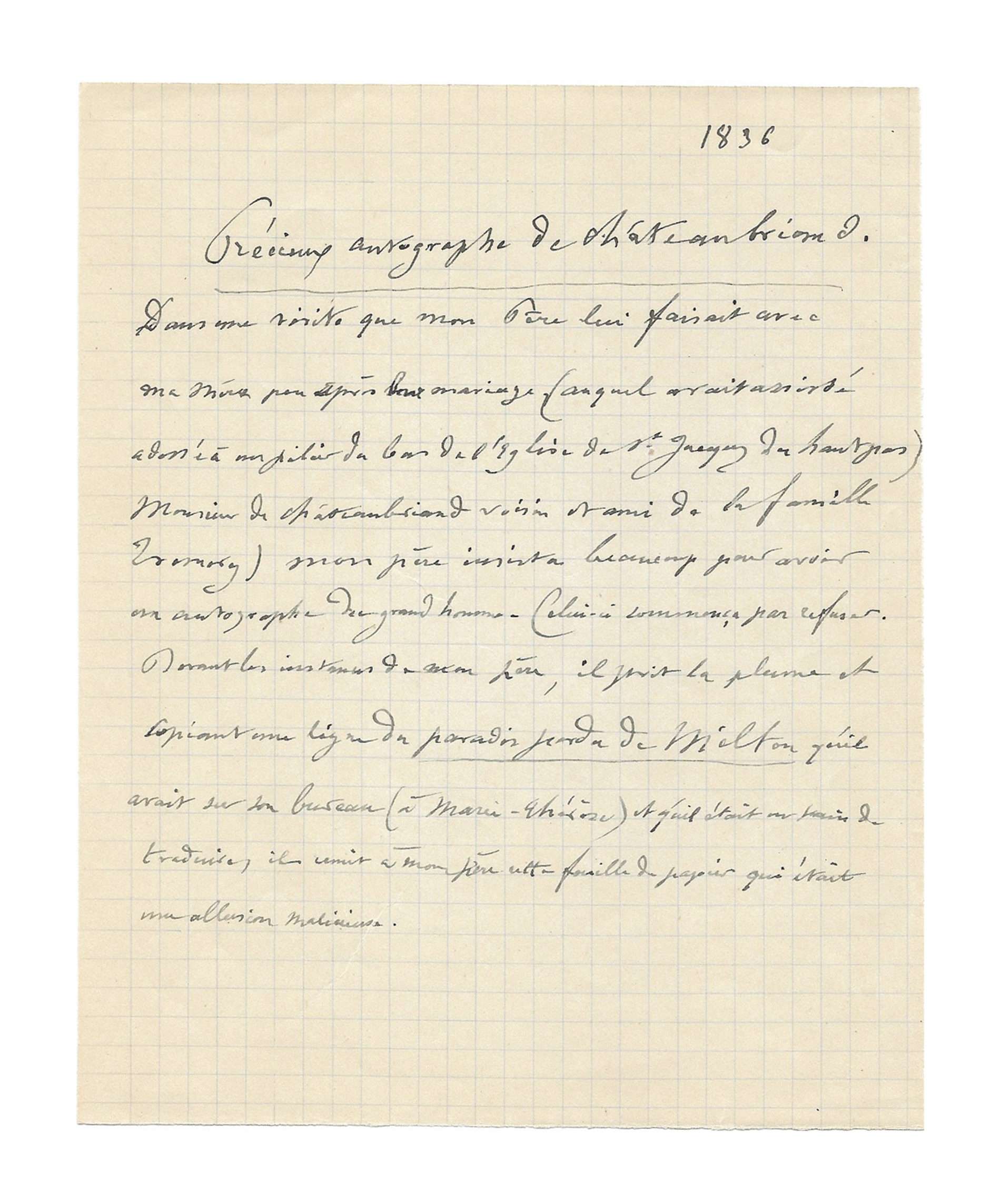 Dans une visite que mon père lui faisait […], mon père insista beaucoup pour avoir un autographe du grand homme (celui-ci commença par refuser). Devant les insistances de mon père, il prit la plume et copiant une ligne du Paradis perdu de Milton qu’il avait sur son bureau… et qu’il était en train de traduire, il remit à mon père cette feuille de papier qui était une allusion malicieuse. »
