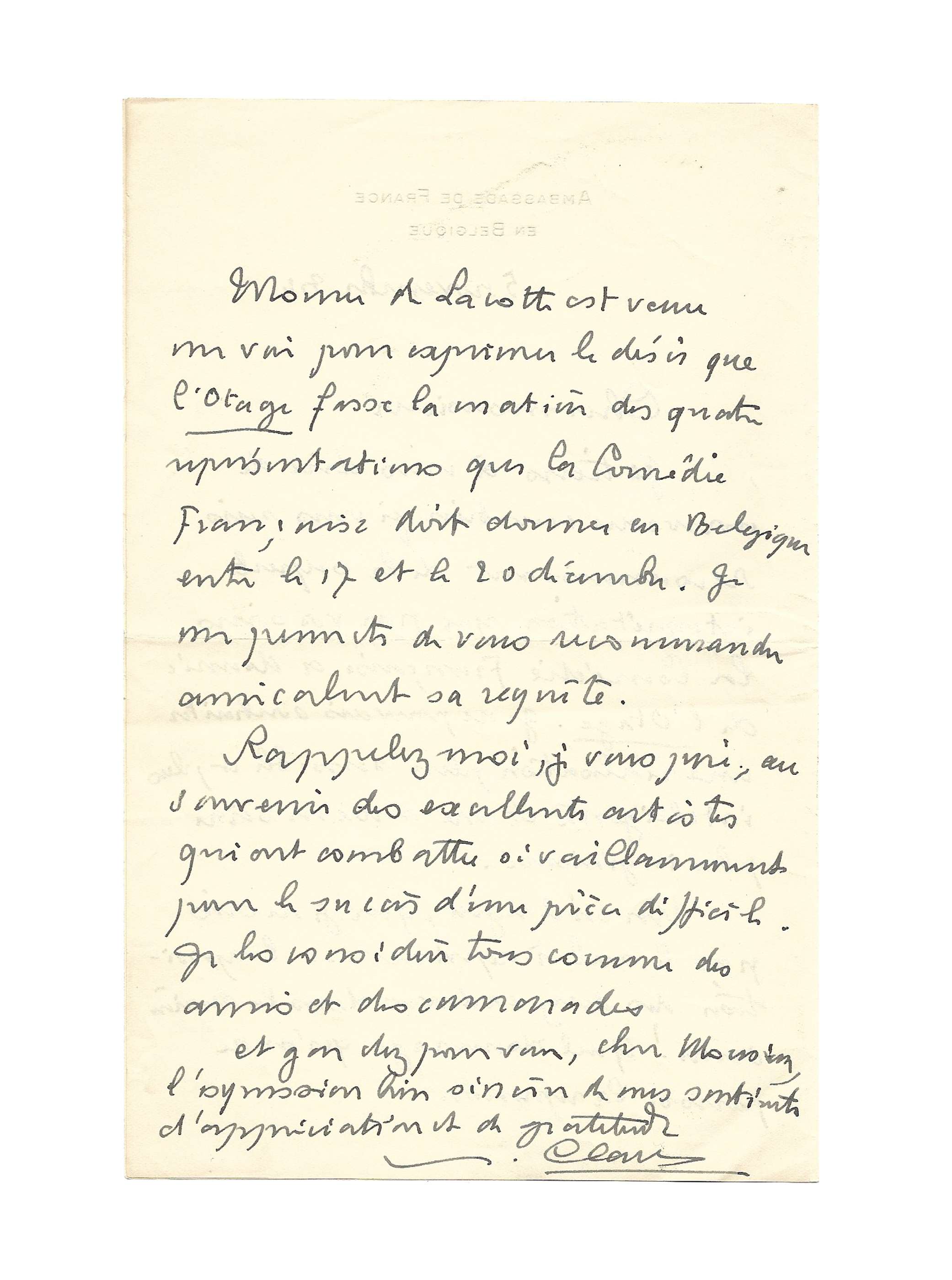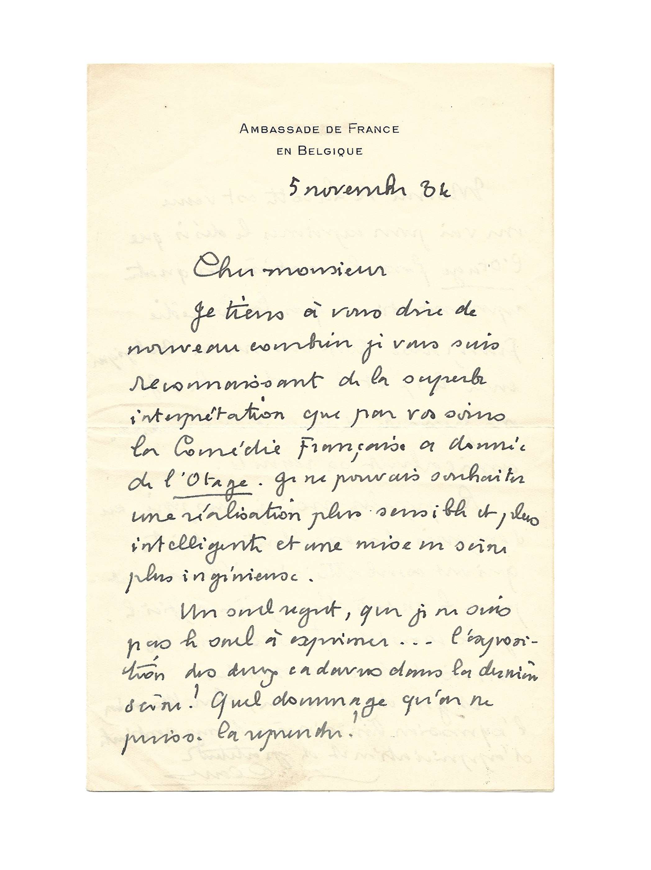 Je tiens à vous dire de nouveau combien je vous suis reconnaissant de la superbe interprétation que par vos soins la Comédie Française à donnée de l’Otage. Je ne pouvais souhaiter une réalisation plus sensible et plus intelligente et une mise en scène plus ingénieuse.