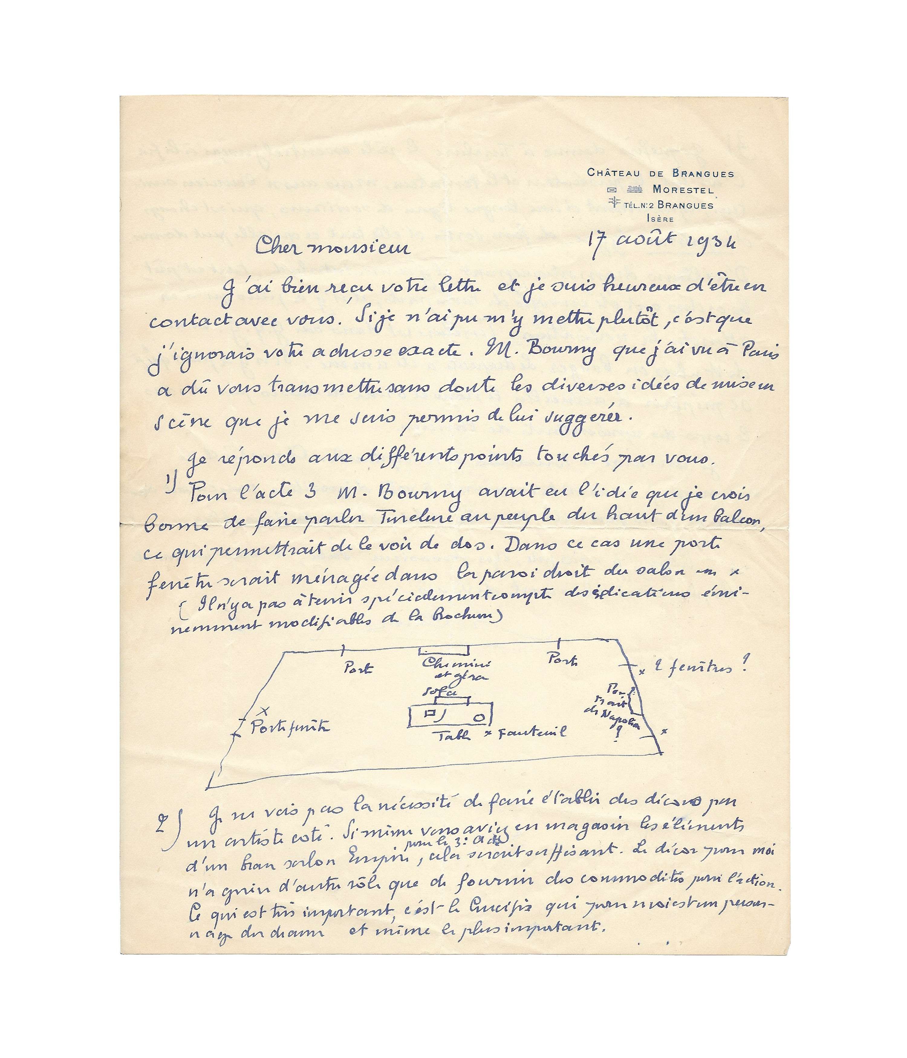 J’ai bien reçu votre lettre et je suis heureux d’être en contact avec vous. Si je n’ai pu m’y mettre plutôt [sic], c’est que j’ignorais votre adresse exacte. M. Bourny [régisseur général de la Comédie Française] que j’ai vu à Paris a dû vous transmettre sans doute les diverses idées de mise en scène que je me suis permis de lui suggérer.