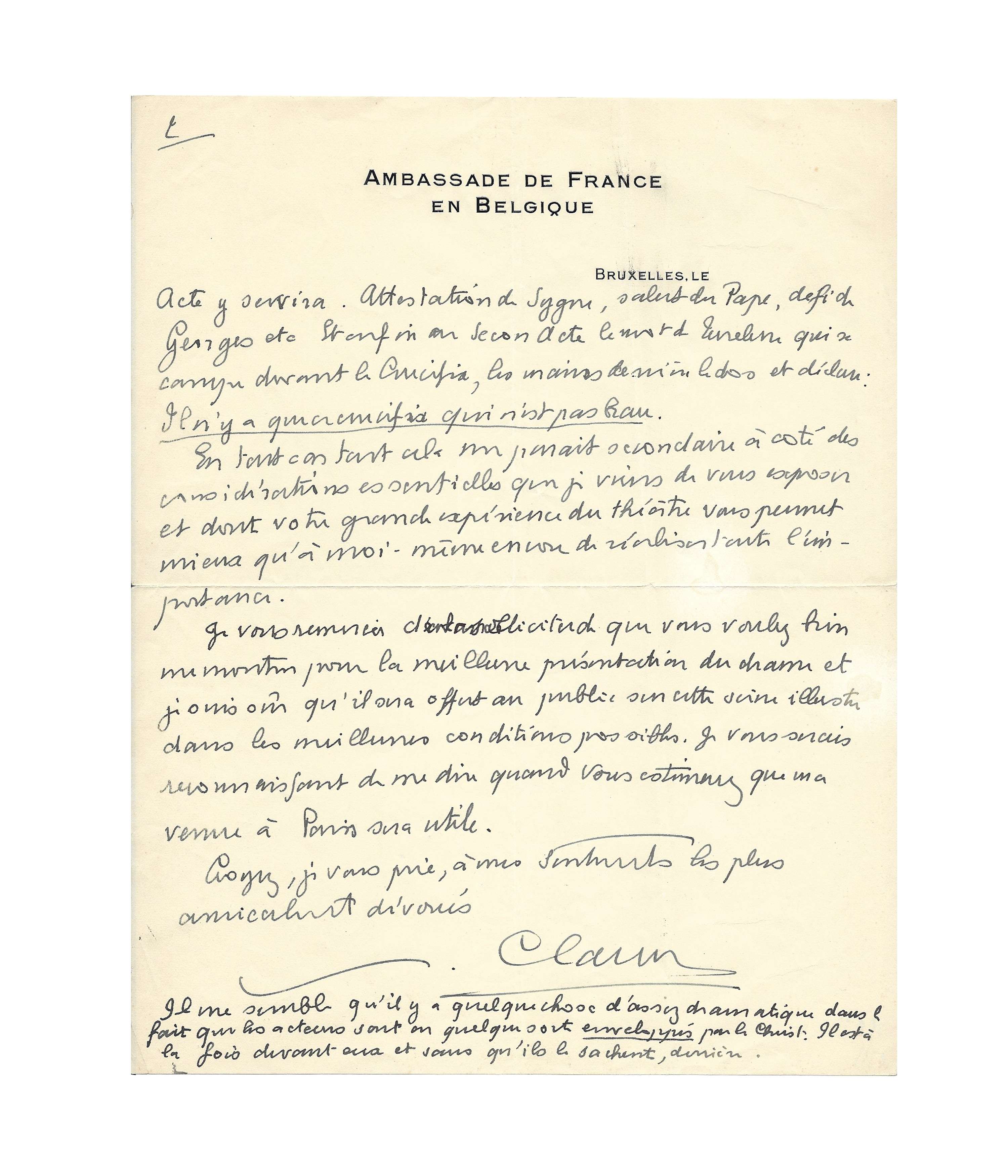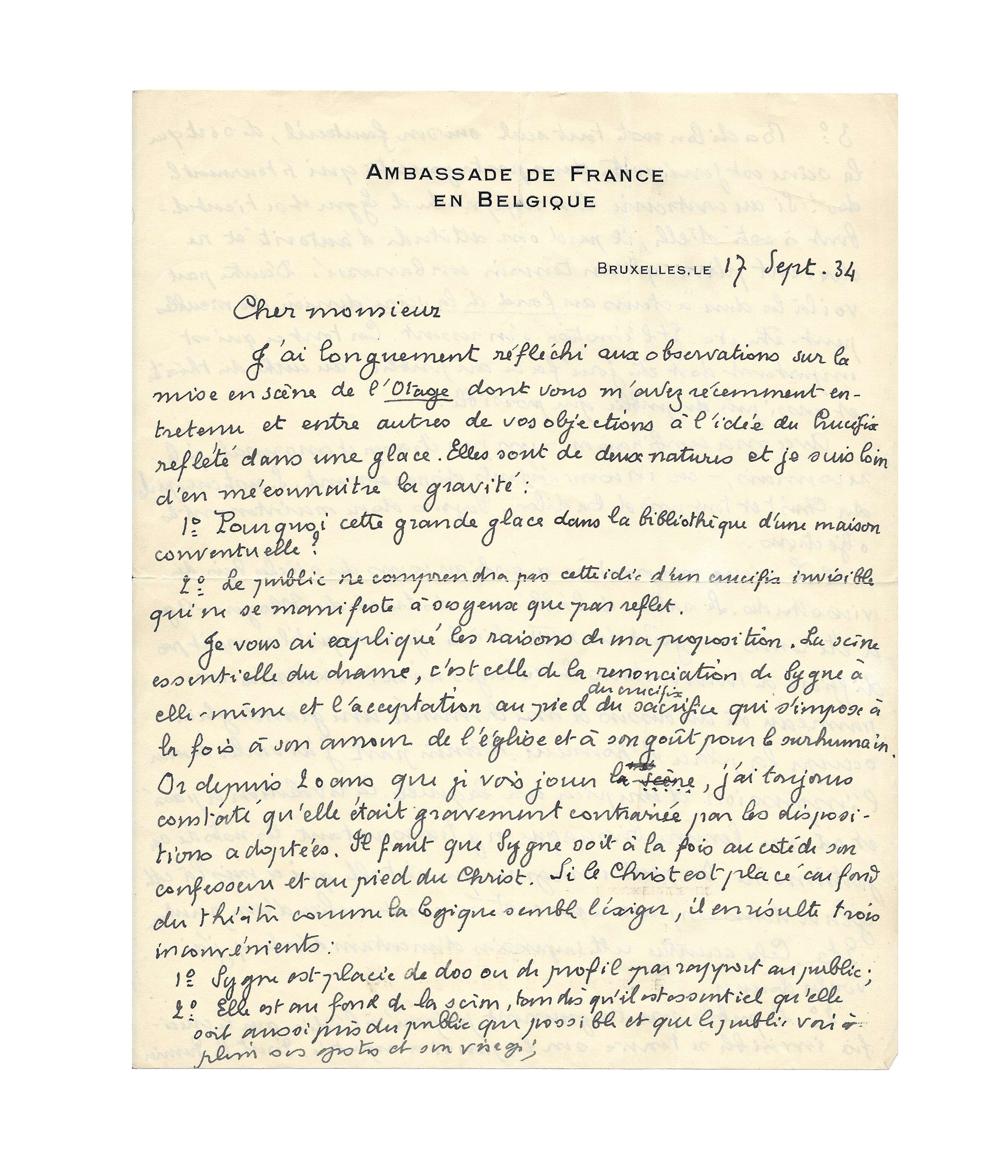 J’ai longuement réfléchi aux observations sur la mise en scène de l’Otage dont vous m’avez récemment entretenu et entre autres de vos objections à l’idée du crucifix reflété dans une glace. Elles sont de deux natures et je suis loin d’en méconnaître la gravité.