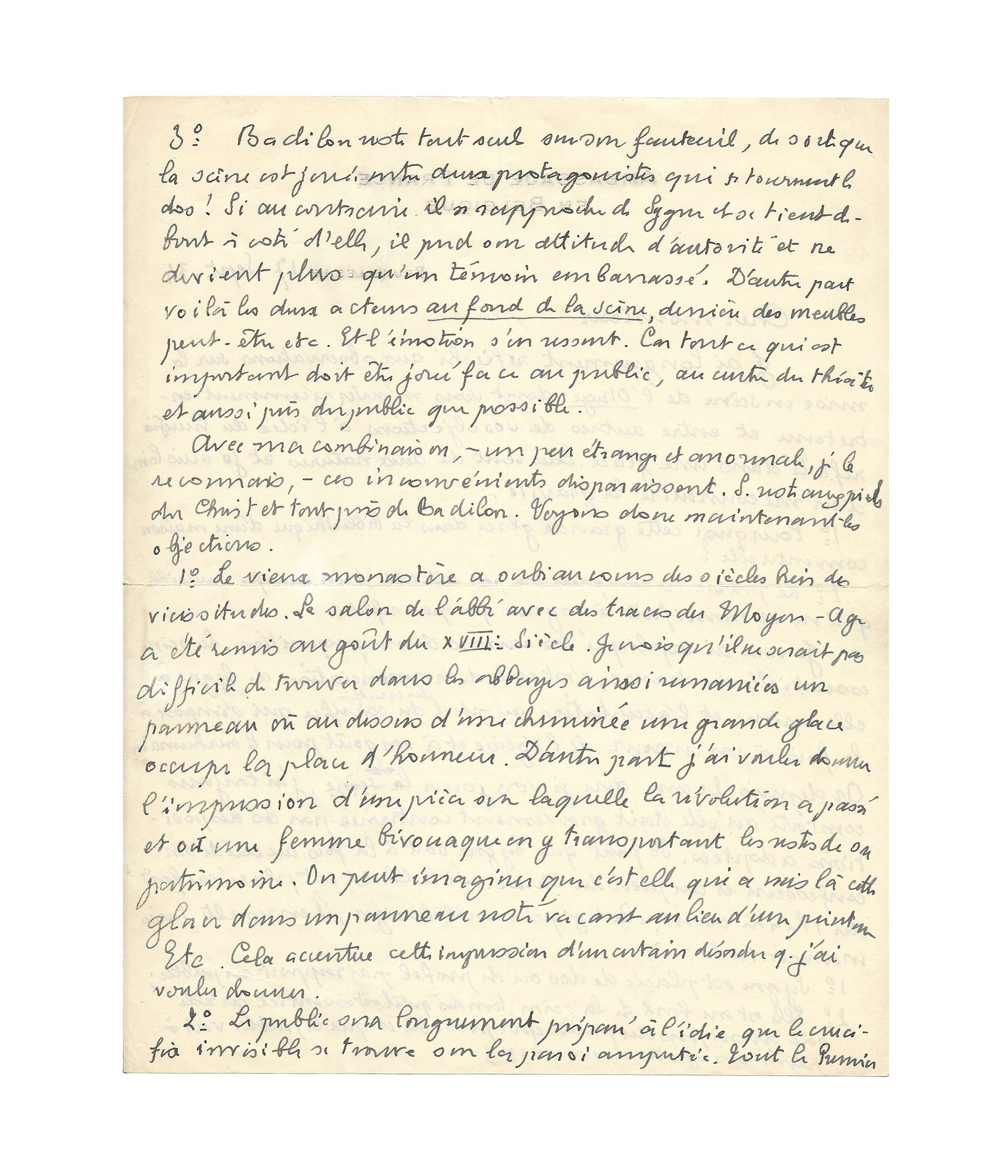 2/ Je ne vois pas la nécessité de faire établie des décors par un artiste c[ô]té. Si même vous aviez en magasin les éléments d’un beau salon Empire pour le 3e acte, cela serait suffisant. Le décor pour moi n’a aucun autre rôle que de fournir des commodités pour l’action.