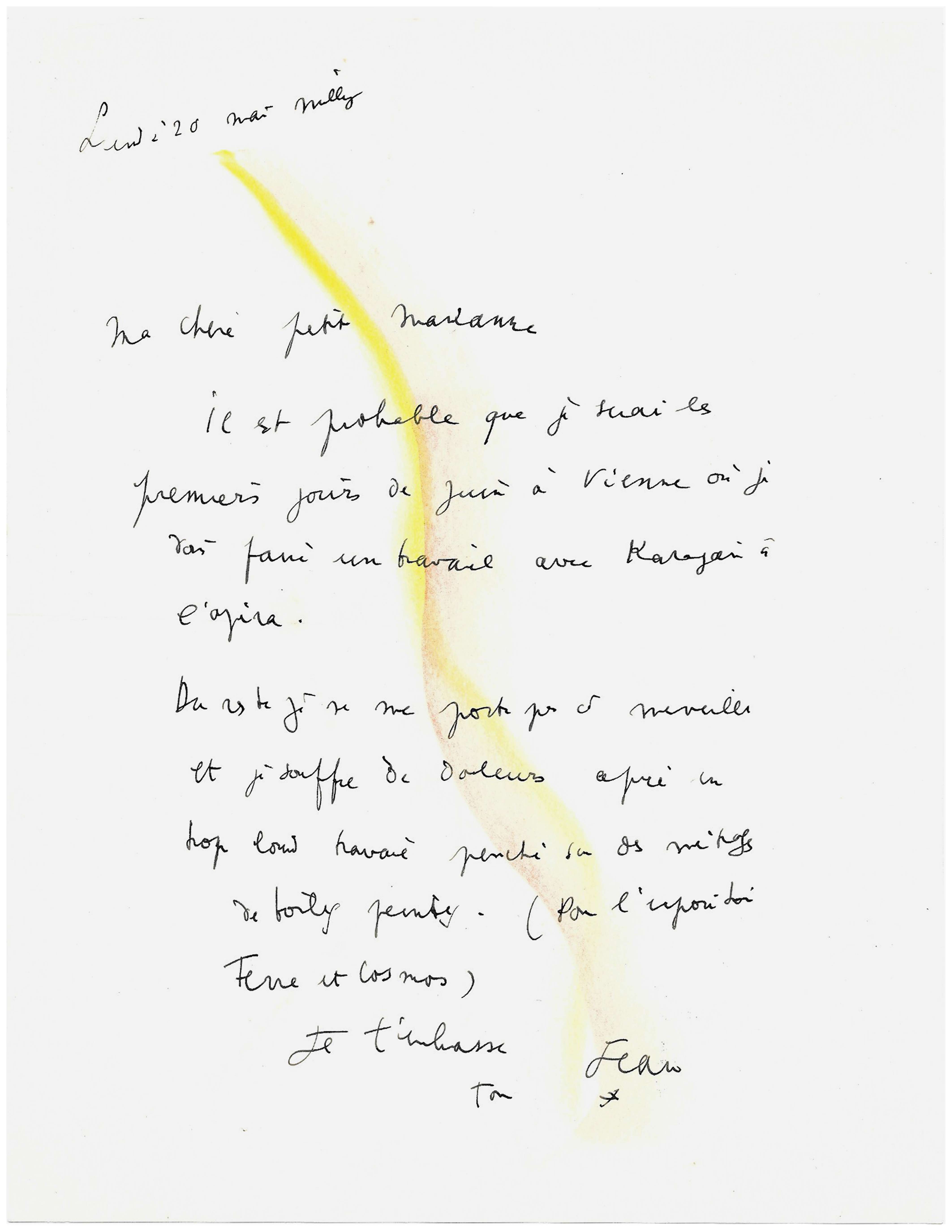 Belle lettre de Cocteau, ornée d’un dessin original au pastel, au sujet de sa collaboration artistique avec Karajan et son exposition Terre et Cosmos