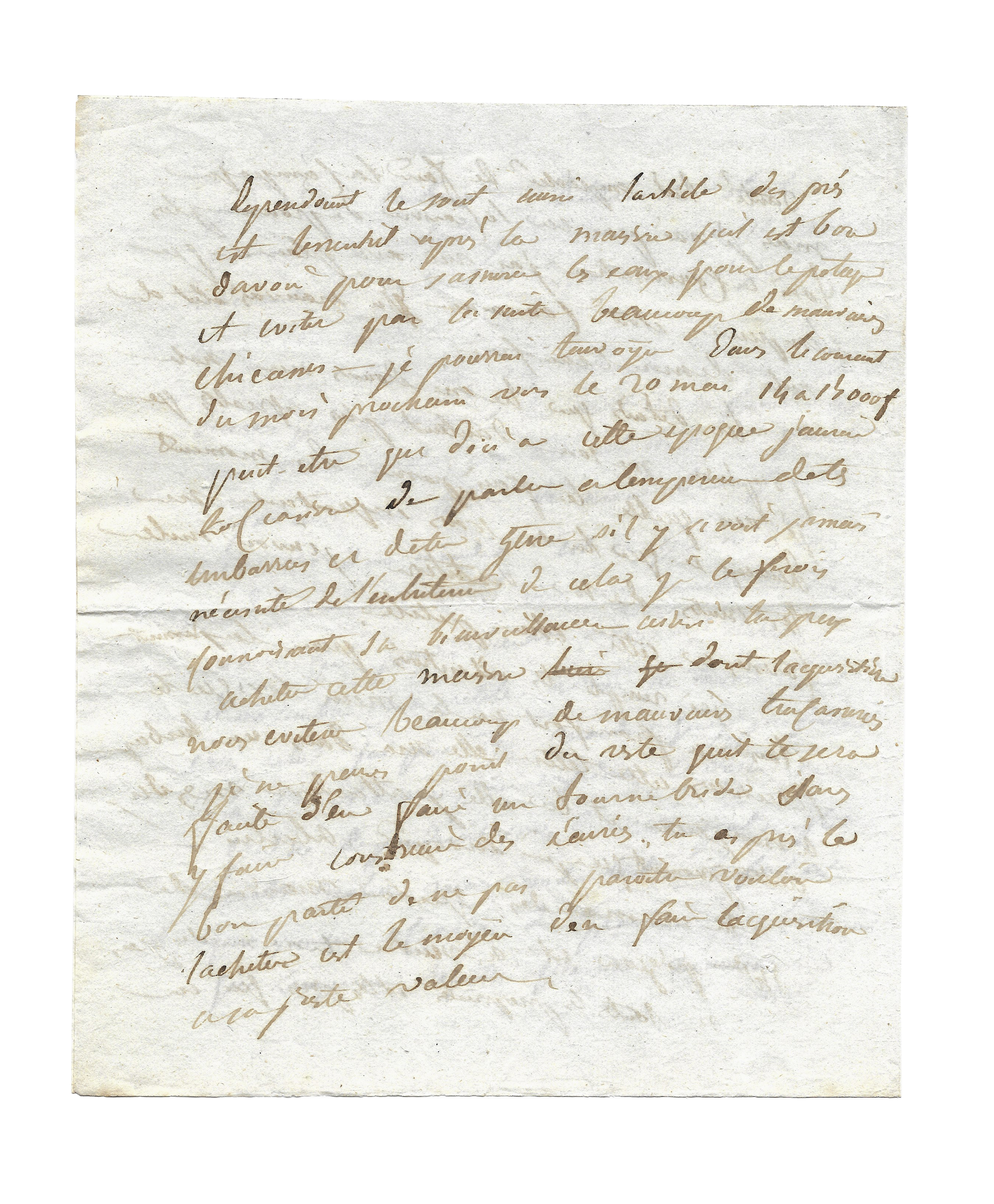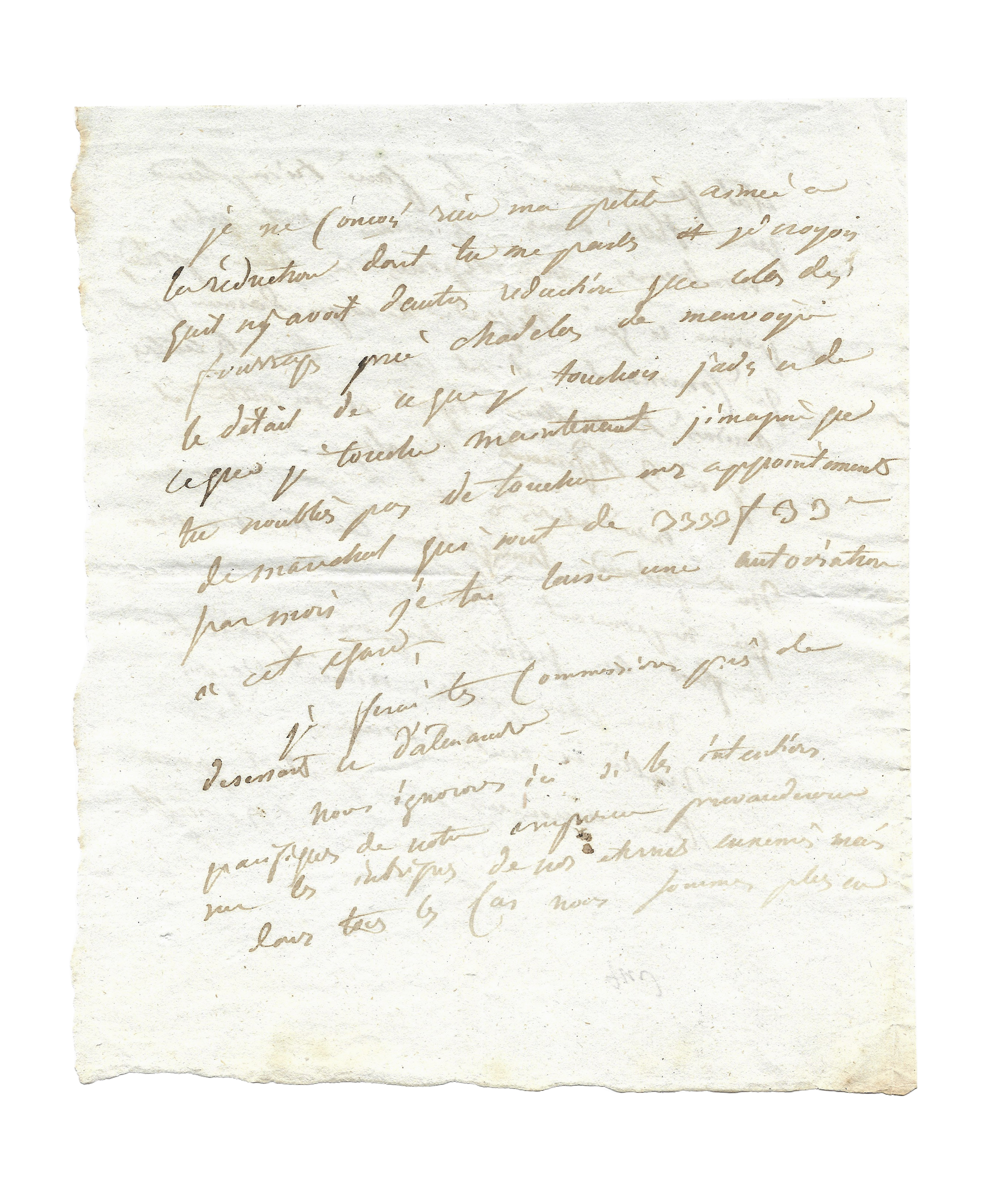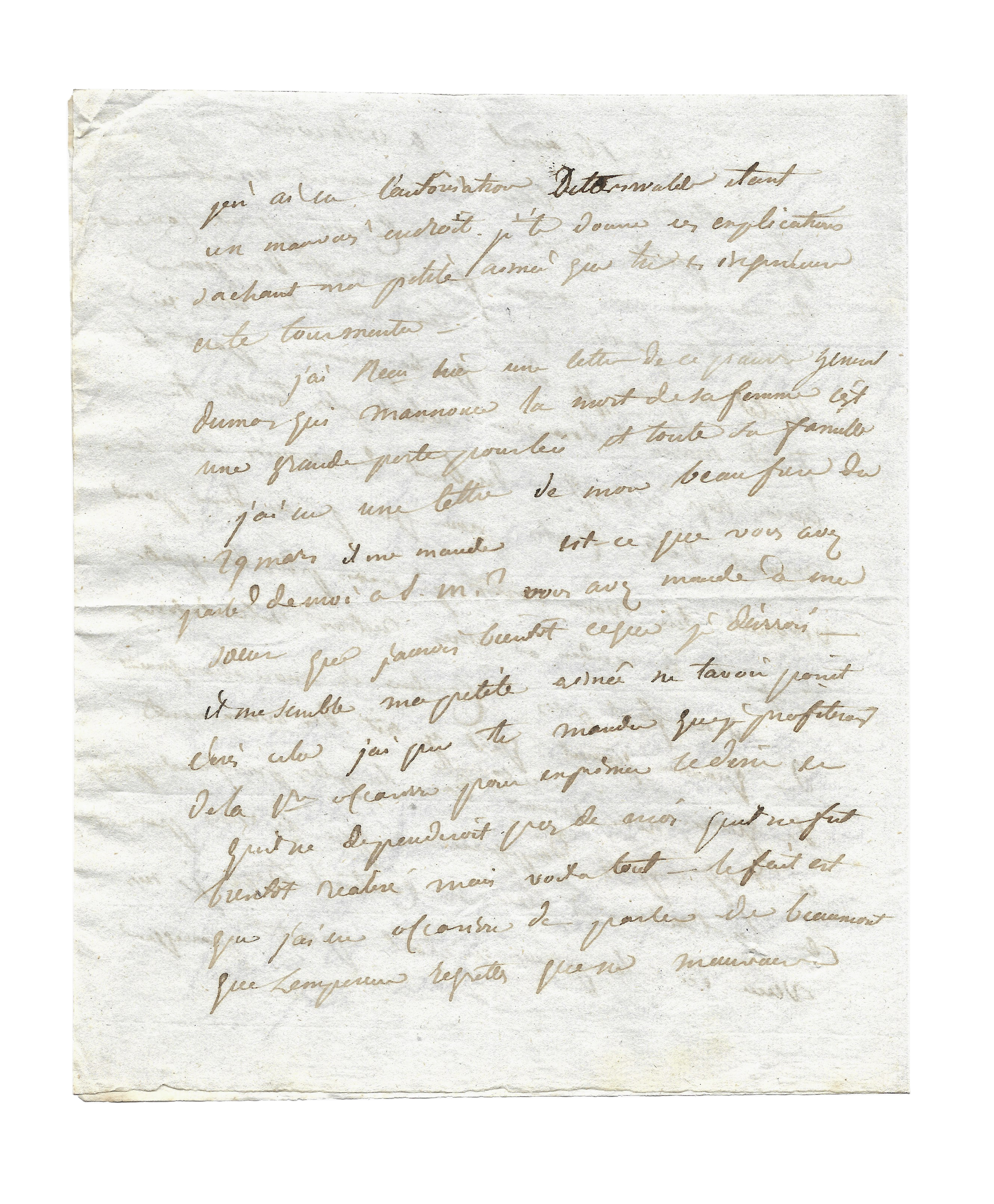 « Je reçois ta lettre du 3 avril, ma bien bonne petite Aimée. Je ne conçois point comment tu ne m’as pas encore fai[t] un mot de réponse sur la prière que je t’ai faite de louer un hôtel à Paris. Je désire que tu prennes ce parti-là. La petite maison de l’Orangerie [les Davout occupaient alors ce logement, aux Tuileries] n’étant plus tenable, tu aurois trop à souffrir du bruit des ouvriers dans le moment de tes couches pour que je ne désir[asse] point vivement t’en voir sortir. Je serois plus tranquille si tu te rendois à mes réitérées sollicitations. Il ne faut pas conclure de mon changement de quartier général qu’il y ait des événements de guerre, nous sommes ici comme dans la plus profonde paix et il n’y a plus d’apparence que les Ru[s]ses pense à la troubler : il leur en couteroit trop. Je suis venu ici, l’empereur en étant parti, parce que j’en ai eu l’autorisation, Ditterswald étant un mauvais endroit [le maréchal Davout était auparavant cantonné à Dietrichswald, actuellement Gietrzwald en Pologne, près d’Olsztyn]. Je te donne ces explications sachant, ma petite Aimée, que tu es ingénieuse à te tourmenter. J’ai reçu hier une lettre de ce pauvre général Dumas qui m’annonce la mort de sa femme [Mathieu Dumas venait de perdre son épouse Adélaïde Julie Delarue]. C’est une grande perte pour lui et toute sa famille. J’ai eu une lettre de mon beau-frère [le frère de la maréchale Davout, le général Nicolas-Marin Leclerc Des Essarts, chef de l’état-major de la division Friant dans le 3e corps de la Grande Armée] du 29 mars, il me mande : « Est-ce que vous avez parlé de moi à S[a] M[ajesté] ? Vous avez mandé à ma sœur que j’aurois bientôt ce que je désirois ». Il me semble, ma petite Aimée, ne t’avoir point écri[t] cela , j’ai pu te mander que je profiterois de la 1re occasion pour exprimer ce désir et qu’il ne dépenderoit pas de moi qu’il ne fût bientôt réalisé, mais voilà tout – le fait est que j’ai eu occasion de parler de Beaumont, que l’empereur regrette que sa mauvaise santé l’ait empêché de faire la campagne, mais je n’ai pas eu l’occasion de pousser plus loin la conversation. J’ai vu avec plaisir que l’empereur étoit convaincu du mauvais état de santé de mon beau-frère. Les détails que tu me donnes sur notre Joséphine me sont d’autant plus agréables que je vois qu’elle te fai[t] passer des moments heureux et que tu es sans inquiétude sur les suites de sa dentition. J’envoie mille caresses à cette chère petite. J’ai rempli tes intentions pour la jument laissée à Francfort-sur-le-Mein Lorsque tu recevras cette lettre elle sera dans un herbage à Mayence et là elle y attendra mes deux autres juments que j’ai envoyées à Berlin. [Le maréchal Davout traite ensuite d’un projet d’acquisition de maison avec prés, et d’un possible envoi de fonds de sa part vers le 20 mai.] Peut-être que d’ici à cette époque j’aurai l’occasion de parler à l’empereur de tes embarras et de ta gêne. S’il y avoit jamais nécessité de l’entretenir de cela je le ferois, connoissant sa bienveillance, ainsi tu peux acheter cette maison… Tu as pris le bon parti de ne pas paroître vouloir l’acheter, c’est le moyen d’en faire l’acquisition à sa juste valeur… J’imagine que tu n’oublies pas de toucher mes appointements de maréchal qui sont de 3333 f. 33 c. par mois. Je t’ai laissé une autorisation à cet égard. Je ferai tes commissions près de Desessart. Nous ignorons ici si les intentions pacifiques de notre empereur prevaudrons sur les intrigues de nos éternels ennemis, mais dans tous les cas nous sommes plus en état que jamais de les faire triompher par nos armes – les armées sont plus nombreuses, bien disposées et bien reposées, et pour ce qui regarde le corps d’armée que je commande, il est, comme tous les autres, animé… du meilleur esprit et en outre il y a 3 régiments de plus. Mille choses à ta bonne mère et à M[adam]e Friand. Tranquilise-la sur son mari qui, ne pouvant faire la guerre aux Russes, la fait au gibier du pays [le beau-frère de la maréchal Davout, le général Louis Friant, qui s’illustra à Eylau à la tête de l’avant-garde du 3e corps].