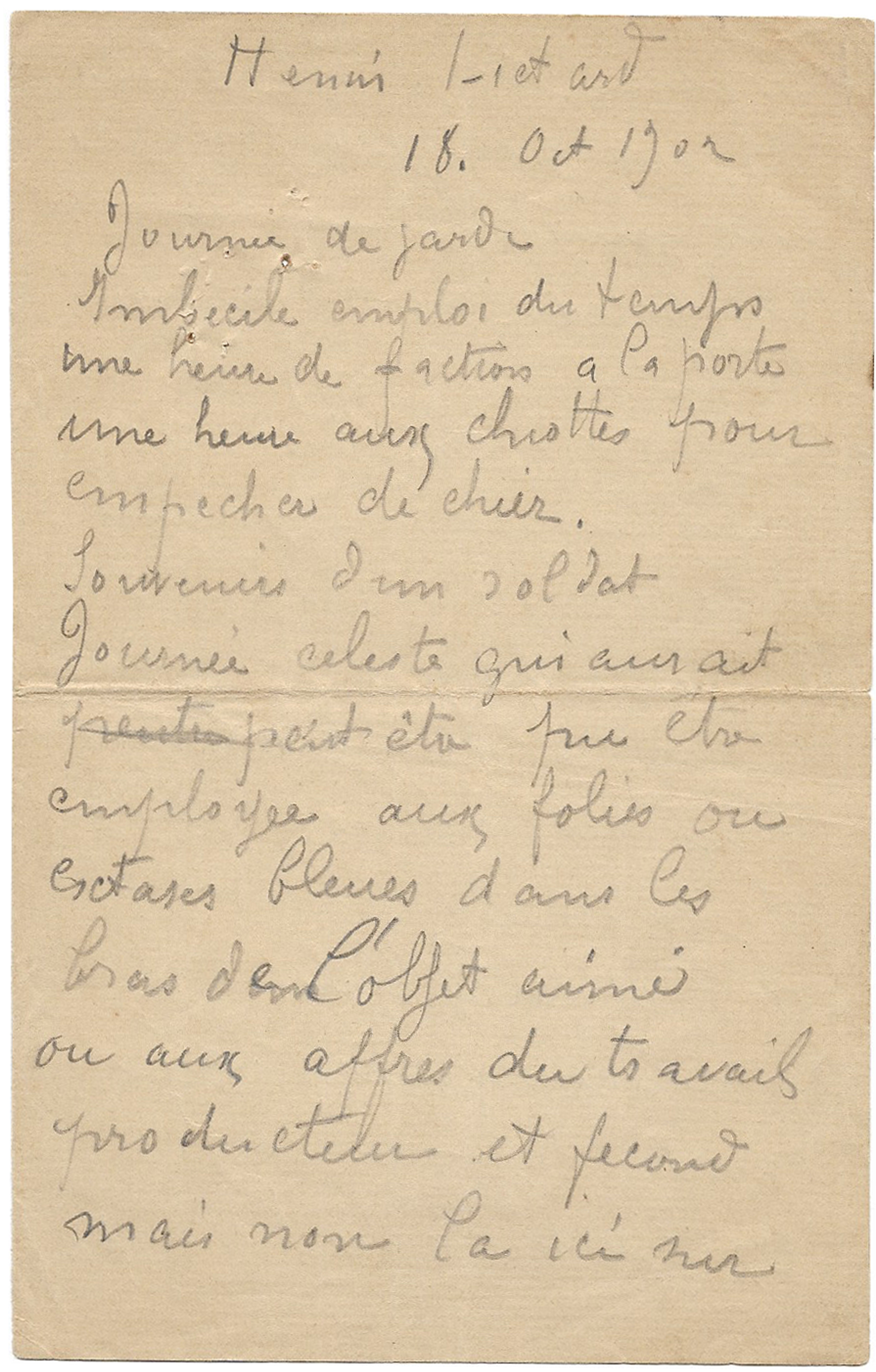 Souvenirs d’un soldat. Journée céleste qui aurait peutre peut être pu être employée aux folies ou extases bleues dans les bras de l’objet aimé ou aux affres du travail producteur et fécond mais non là ici sur le banc et [à] la table gras et poisseux à crayonner aux amis éloignés les rancœurs d’un ennemi stérile ;