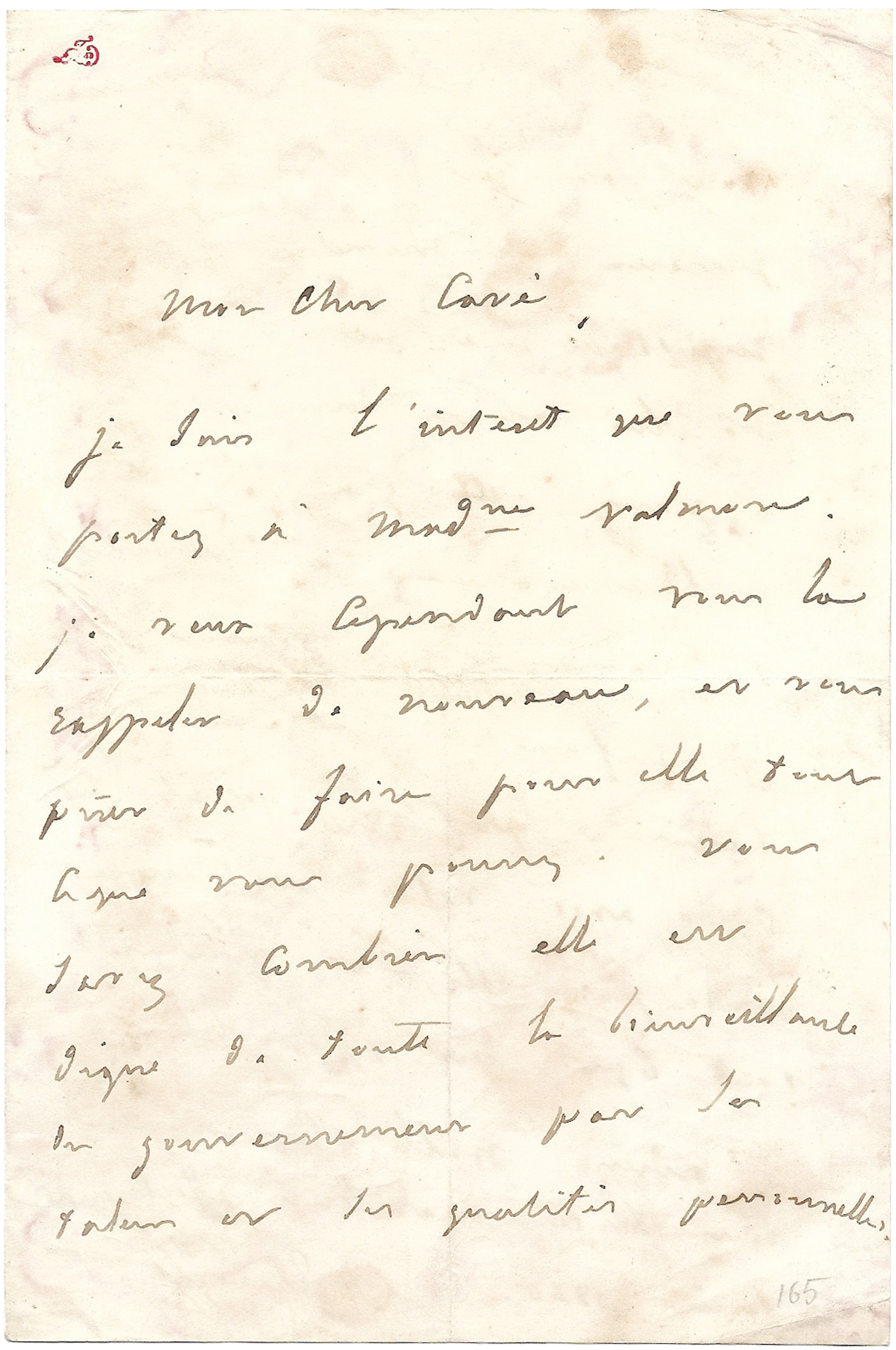 Je sais l’intérêt que vous portez à Madᵐᵉ Valmore. Je veux cependant vous le rappeler de nouveau, et vous prier de faire pour elle tout ce que vous pourrez. Vous savez combien elle est digne de toute la bienveillance du gouvernement par sa valeur et sa qualité personnelle. Vous savez que c’est la personne du monde la plus respectable, et que si on ne lui assure une position à Paris, elle ira vivre malheureusement en province sans pouvoir ni élever son enfant, ni mettre sa valeur à profit. Écoutez-la donc avec votre ancienne bonté pour elle, et faites tout ce qui sera possible.