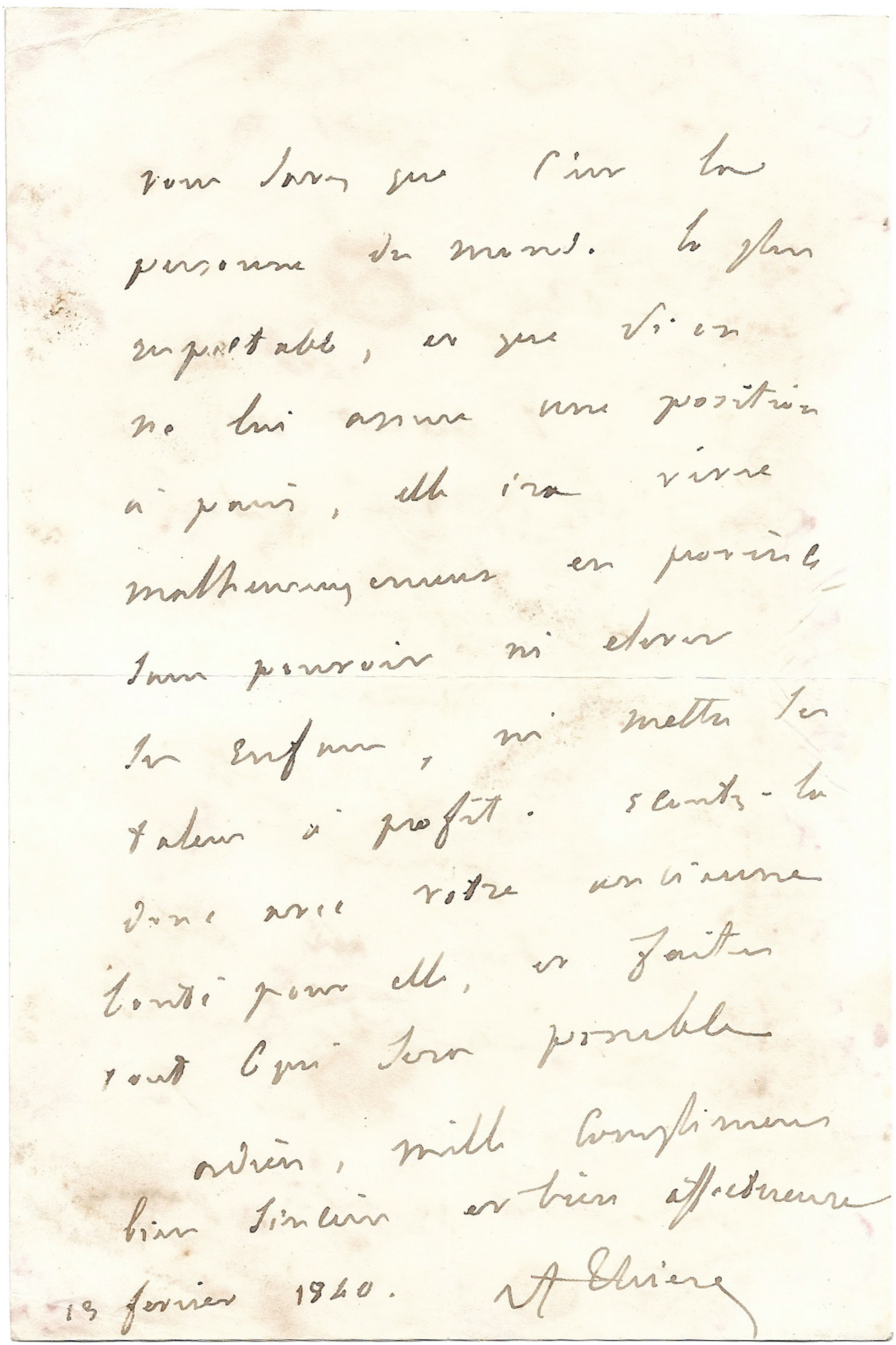 S.l., 13 fév. 1840, 2 p. in-8° sur bifeuillet, à l’encre noire