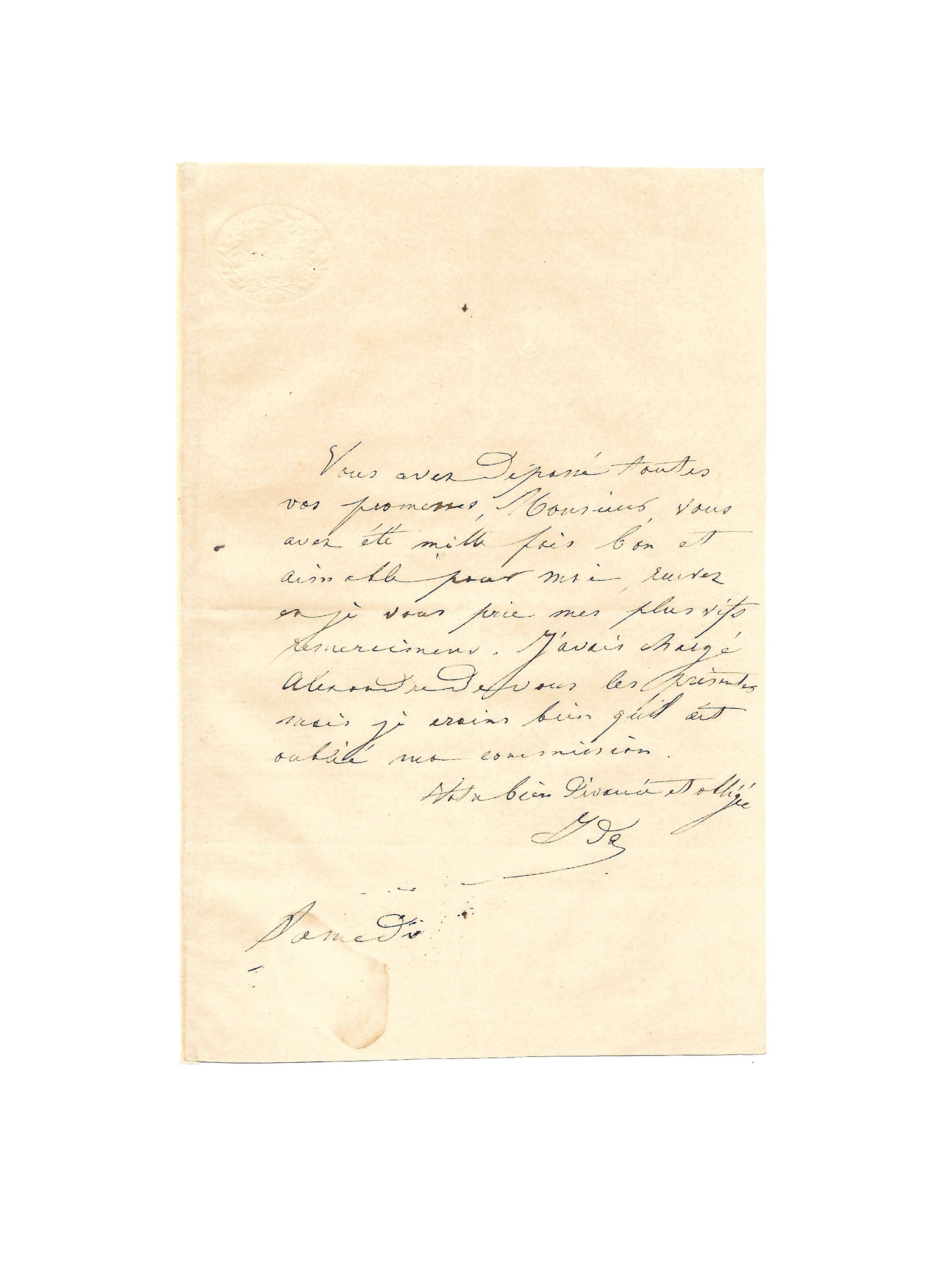 « Vous avez dépassé toutes vos promesses, Monsieur, vous avez été mille fois bon et aimable pour moi, recevez-en je vous prie mes plis vifs remerciements. J’avais chargé Alexandre [Dumas père] de vous les présenter mais je crois bien qu’il ait oublié ma commission.