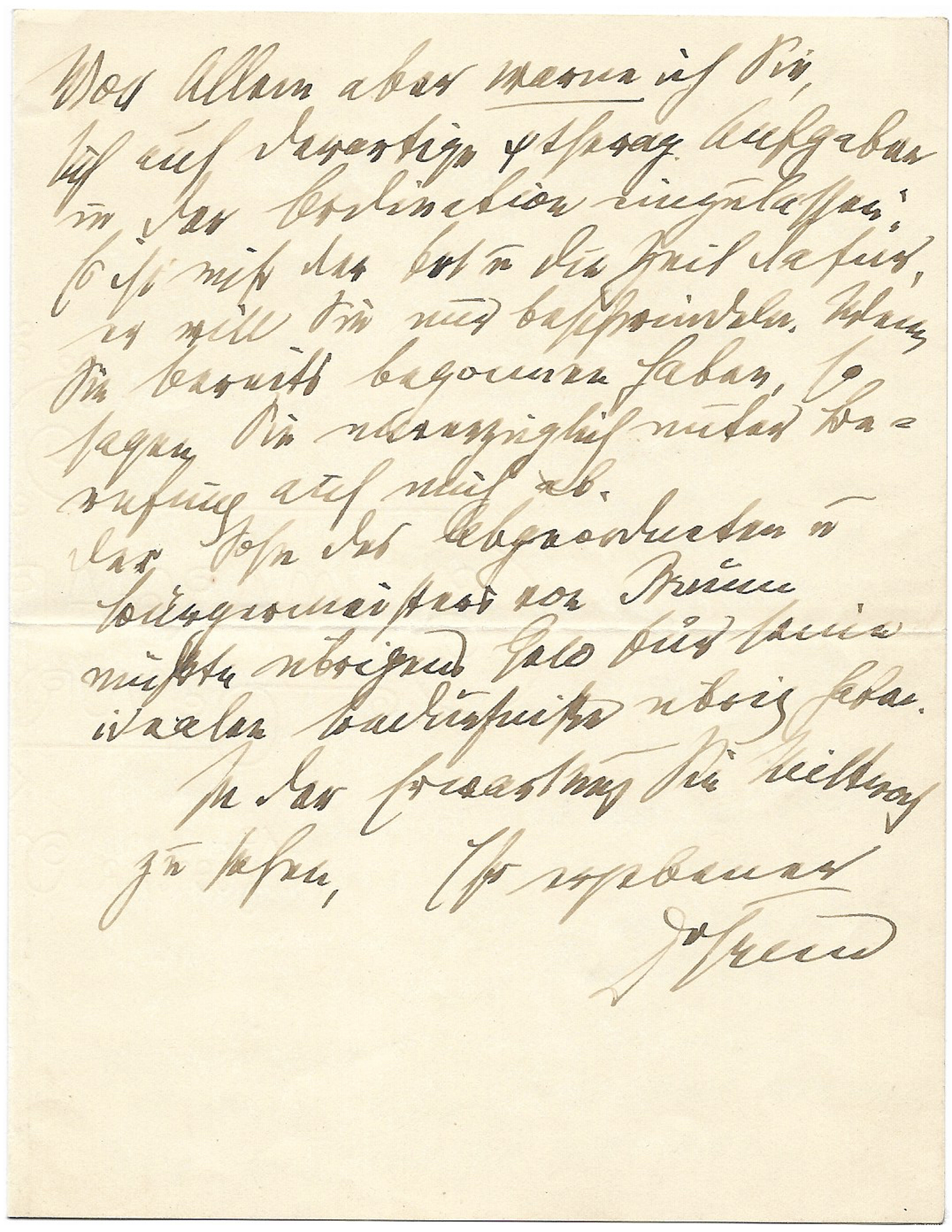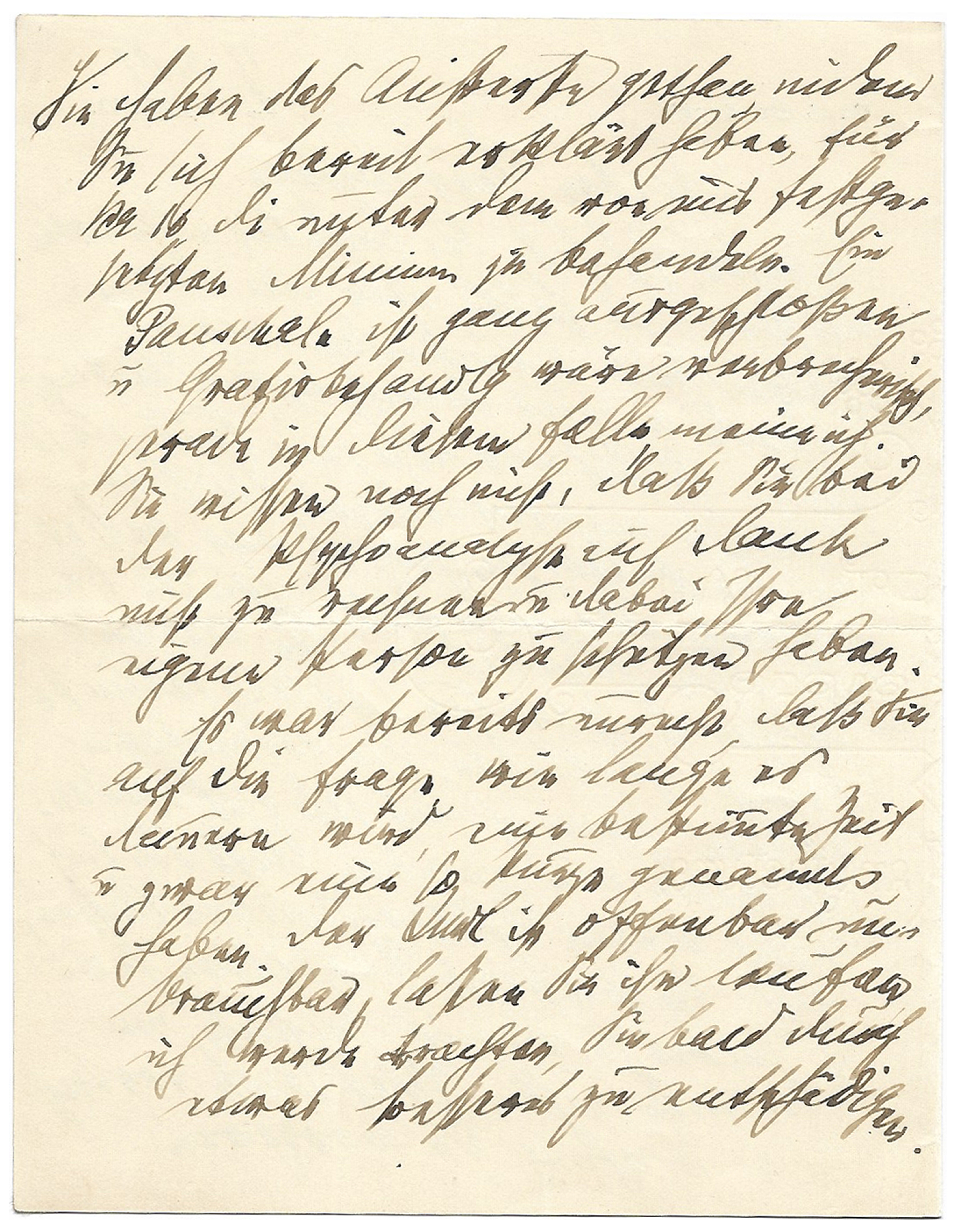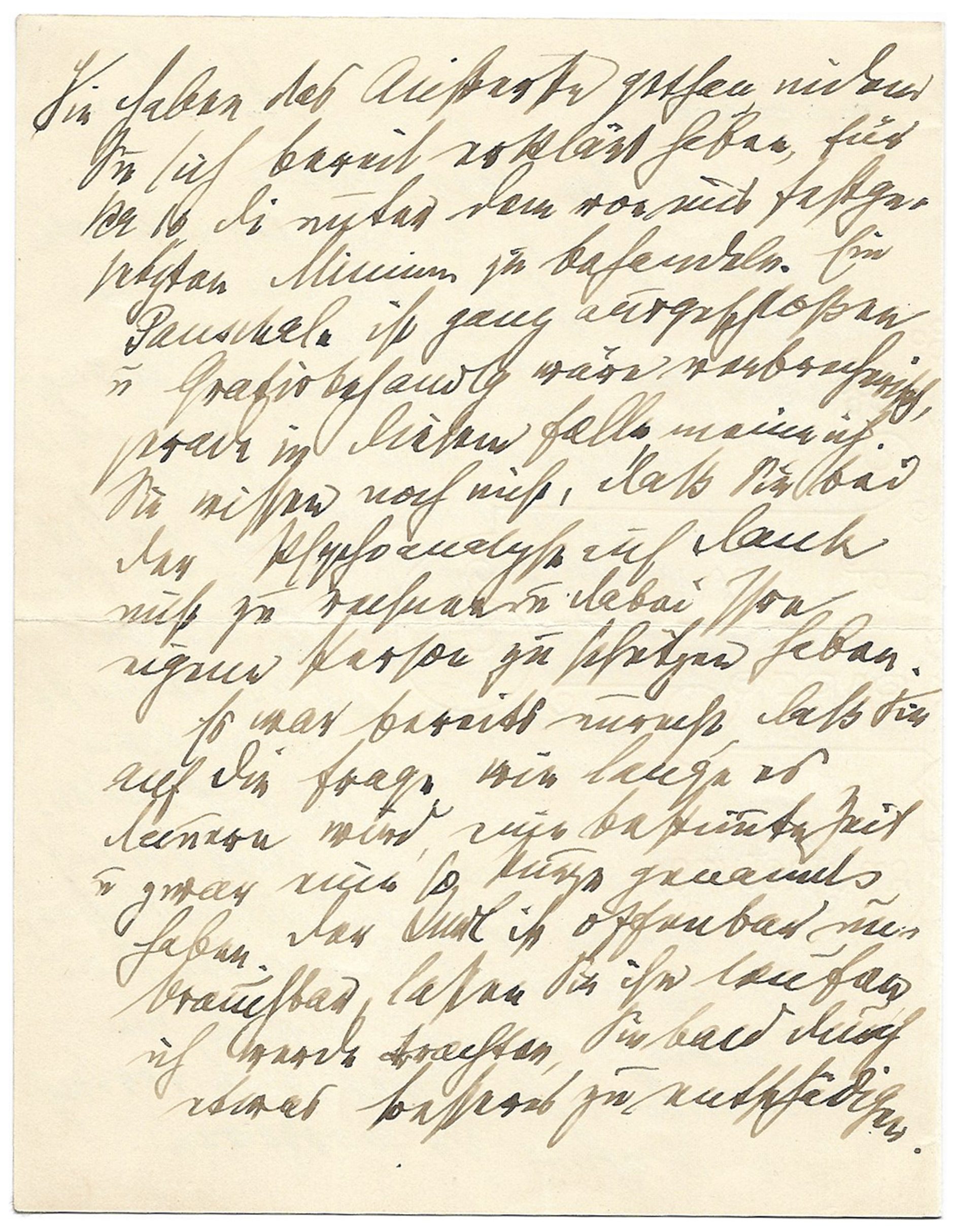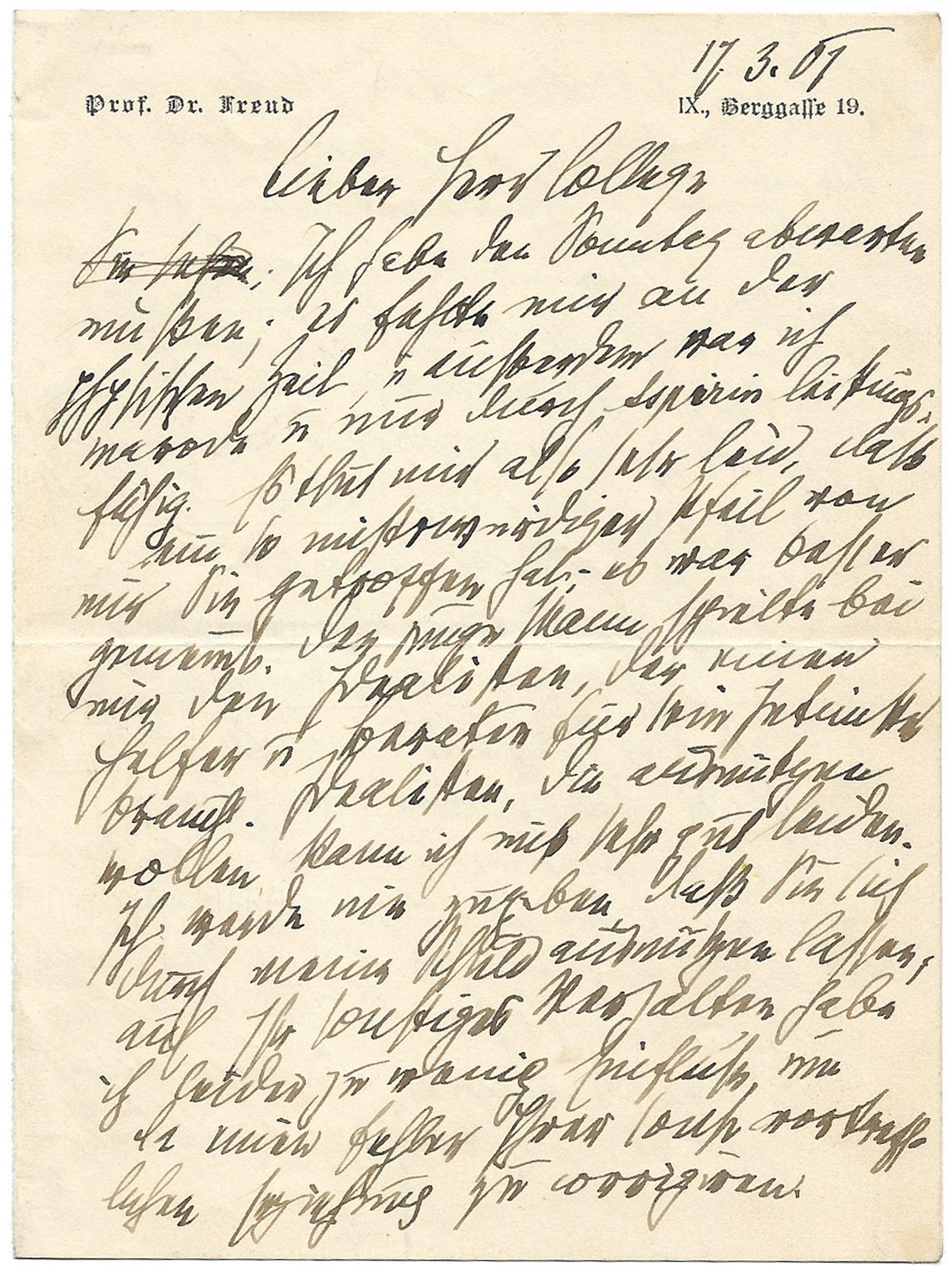« J’ai dû attendre jusqu’à tard dimanche, car je n’avais tout simplement pas de temps et, de plus, j’étais malade et ne pouvais travailler qu’en prenant de l’aspirine » Se référant à une communication précédente, il s’excuse que « vous ayez été atteint par la flèche de mon ton désapprobateur ». Puis Freud donne son avis au sujet d’un patient qui lui a manifestement été adressé par son correspondant : « Le jeune homme s’est présenté à moi comme un idéaliste ayant besoin d’aide et de conseils dans des affaires très intimes. Mais je ne supporte pas les idéalistes qui cherchent à tirer avantage de la situation. Et je n’admettrai jamais que ce soit ma faute si vous avez été exploité. J’ai trop peu d’influence sur vos actes pour pouvoir corriger de nouvelles erreurs dans une éducation par ailleurs excellente. » En ce qui concerne les honoraires de la psychanalyse, « un tarif forfaitaire est absolument hors de question et une réduction serait criminelle dans ce cas. Vous n’avez pas encore appris que l’on ne peut pas compter sur la gratitude de ses patients en psychanalyse ; vous devez vous protéger. Ce fut une erreur, en réponse à sa question sur la durée [de l’analyse], non seulement de donner une durée précise, mais encore une durée très courte. Le type [le patient] est inutile. Laissez-le partir et je me rattraperai en vous trouvant un meilleur sujet. Mais surtout, je dois vous mettre en garde contre le fait de vous laisser entraîner dans de telles situations. Ce n’est ni le lieu ni le moment. Il ne cherche qu’à vous duper ; si vous avez déjà commencé, vous devez alors immédiatement refuser à ma demande. » Pour conclure, Freud donne un indice utile quant à l’identité du patient anonyme : « D’ailleurs, le fils du délégué et maire de Brünn a très probablement assez d’argent pour ses besoins idéalistes, et plus encore… » [Le maire de Brünn à cette date était August Ritter von Weiser].