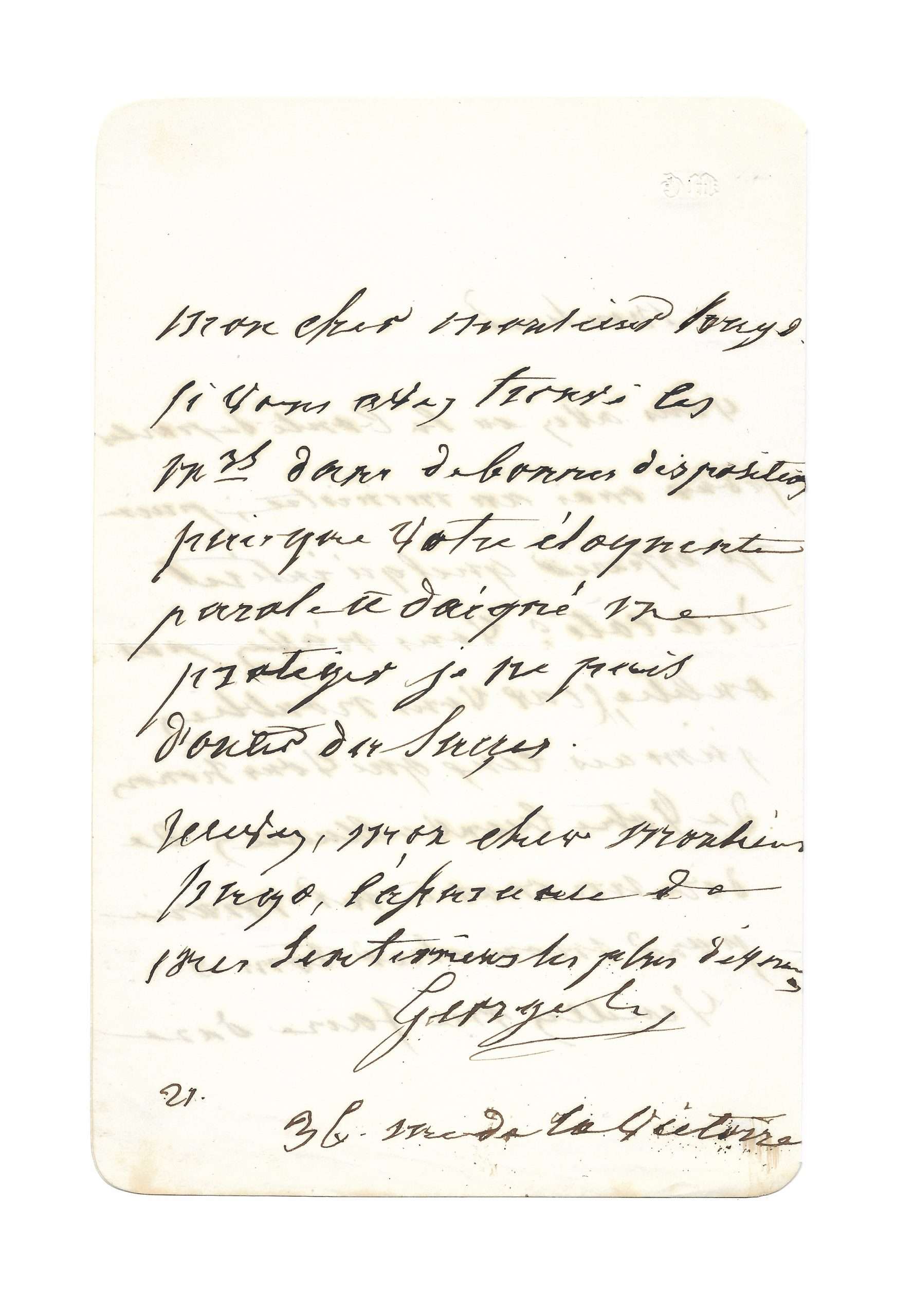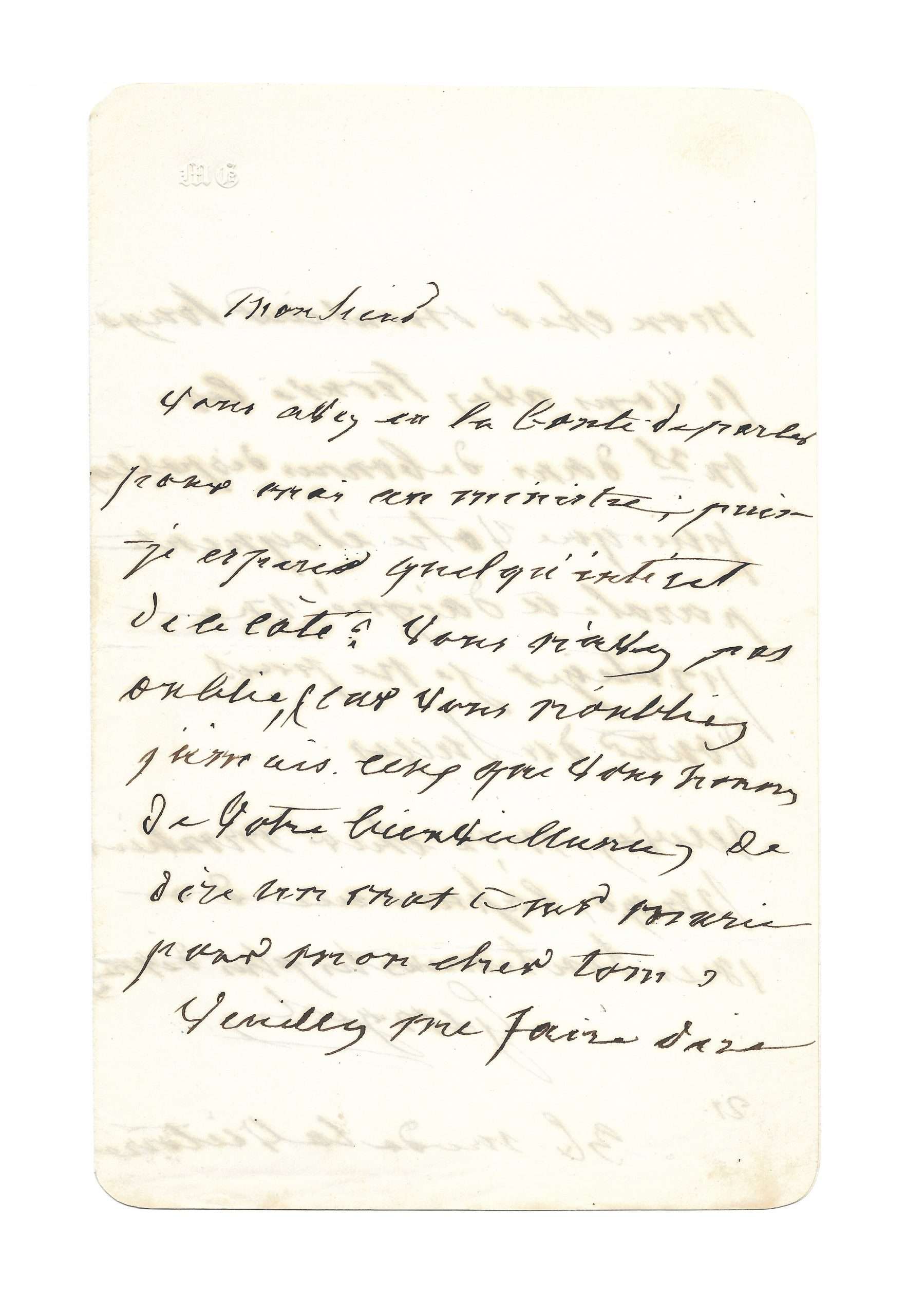 « Vous avez eu la bonté de parler pour moi au ministre ; puis-je espérer quelqu’intérêt de ce côté ? Vous n’avez pas oublié (car vous n’oubliez jamais ceux que vous honorez de votre bienveillance) de dire un mot à Mr Marie pour mon cher Tom. Veuillez me faire dire, mon cher Monsieur Hugo, si vous avez trouvé les Mrs dans de bonnes dispositions puisque votre éloquente parole a daigné me protéger je ne puis douter du succès.