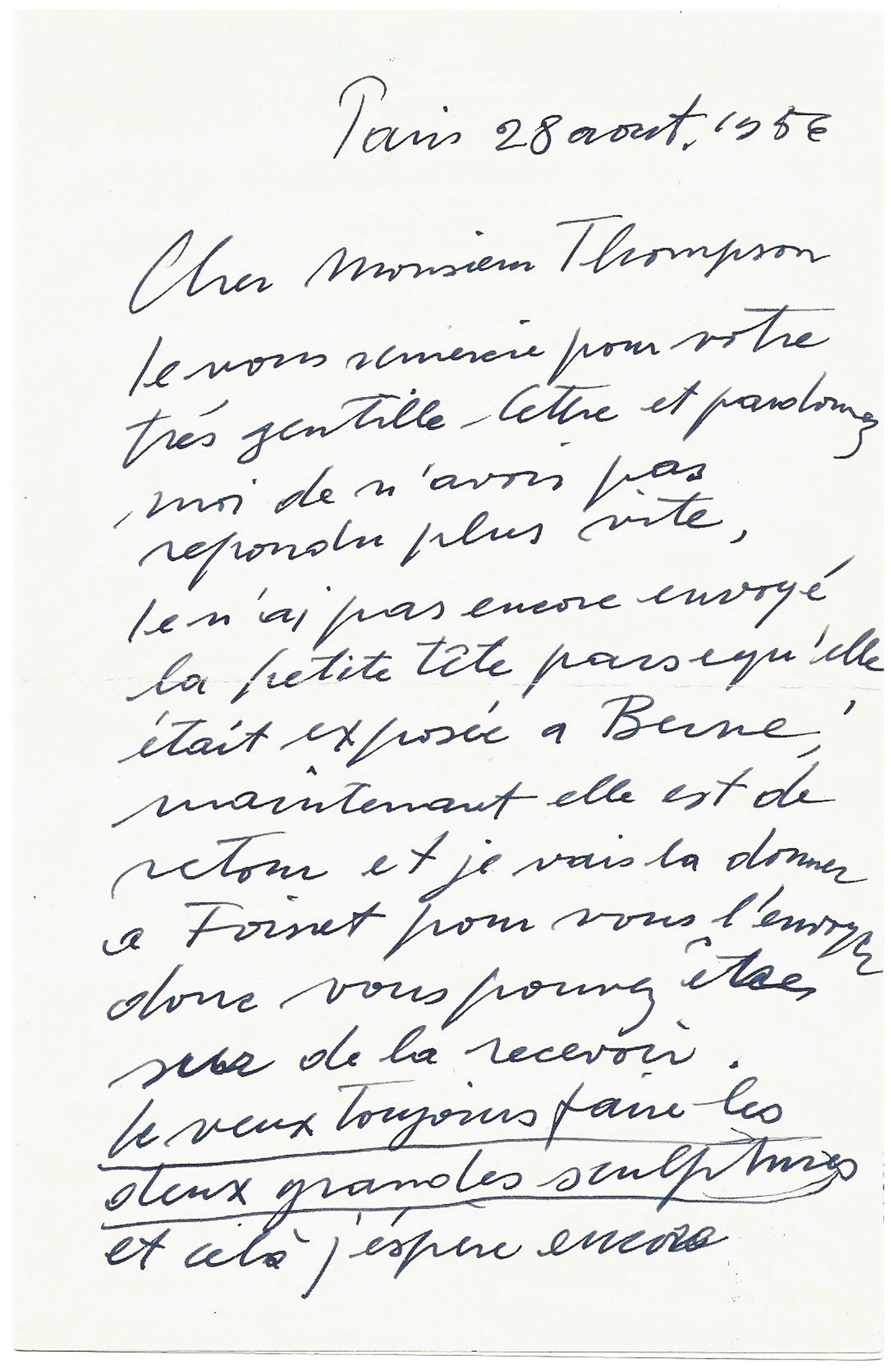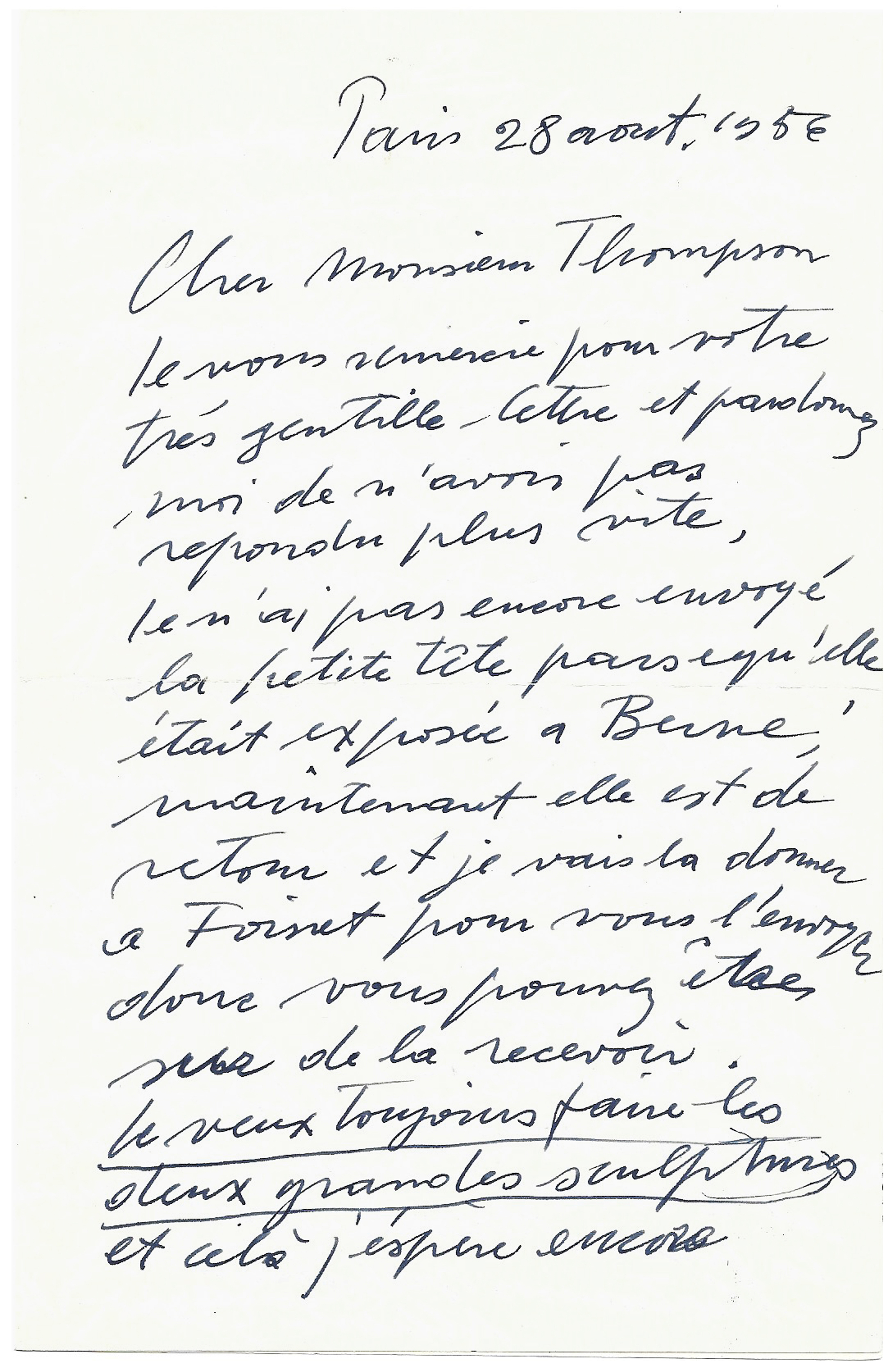 Si l’année 1956 fut harassante de travail pour Giacometti, cette lettre permet d’en prendre toute la mesure. De nombreux projets jalonnèrent la saison, à l’image de la biennale de Venise (dont Giacometti était le représentant pour la France), ou encore la Kunsthalle de Berne durant laquelle il exposa, entre autres, Grande figure [socle haut]. En marge de celle-ci et toujours en 1956, l’artiste est également sollicité par la Chase Manhattan Bank pour un projet de monument. Il fait aussi la rencontre d’Isaku Yanaihara, qui lui servira de modèle tant pour la peinture que la sculpture, jusqu’à l’obsession.