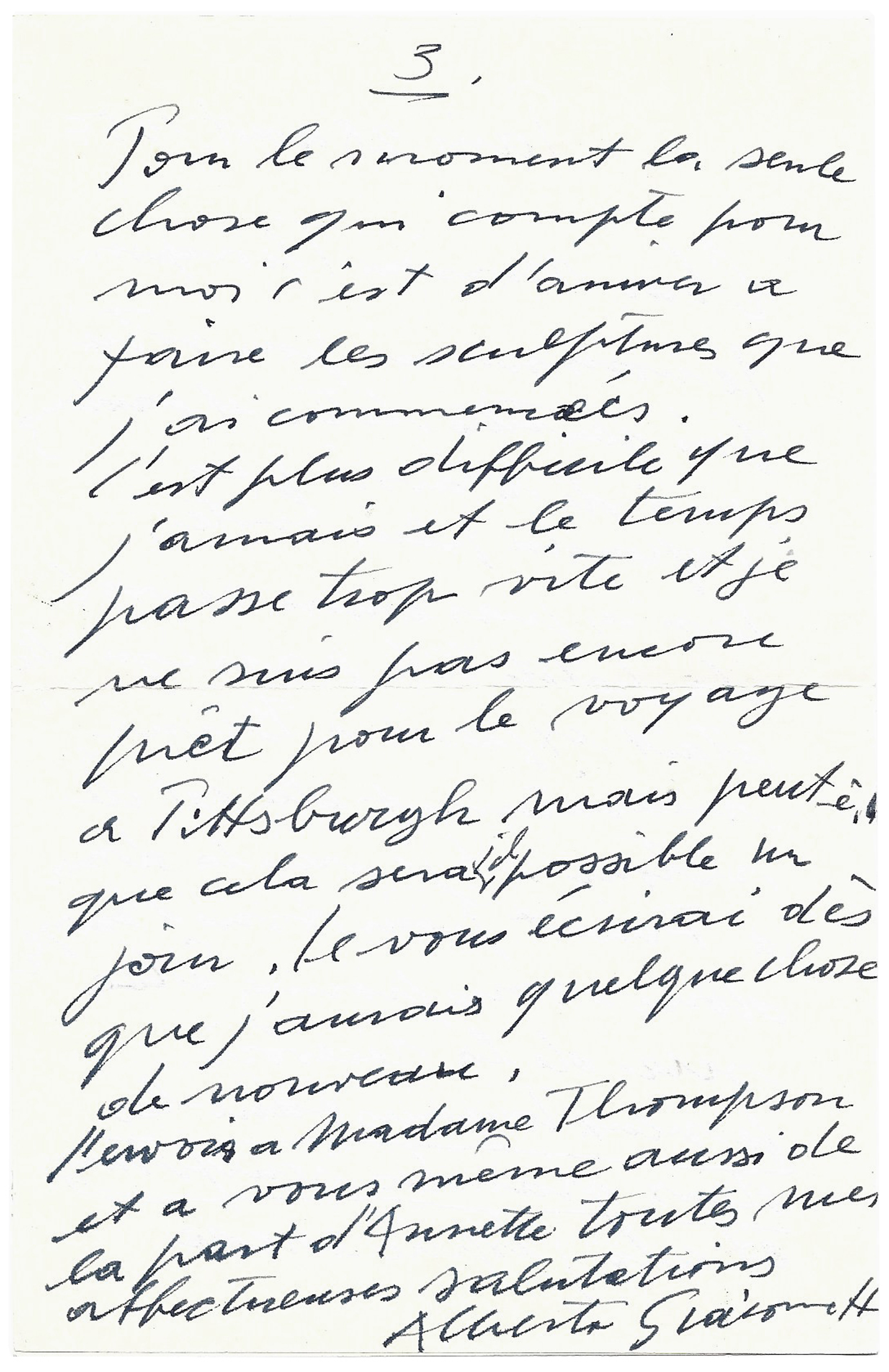Lettre autographe signée « Alberto Giacometti » à David Thompson