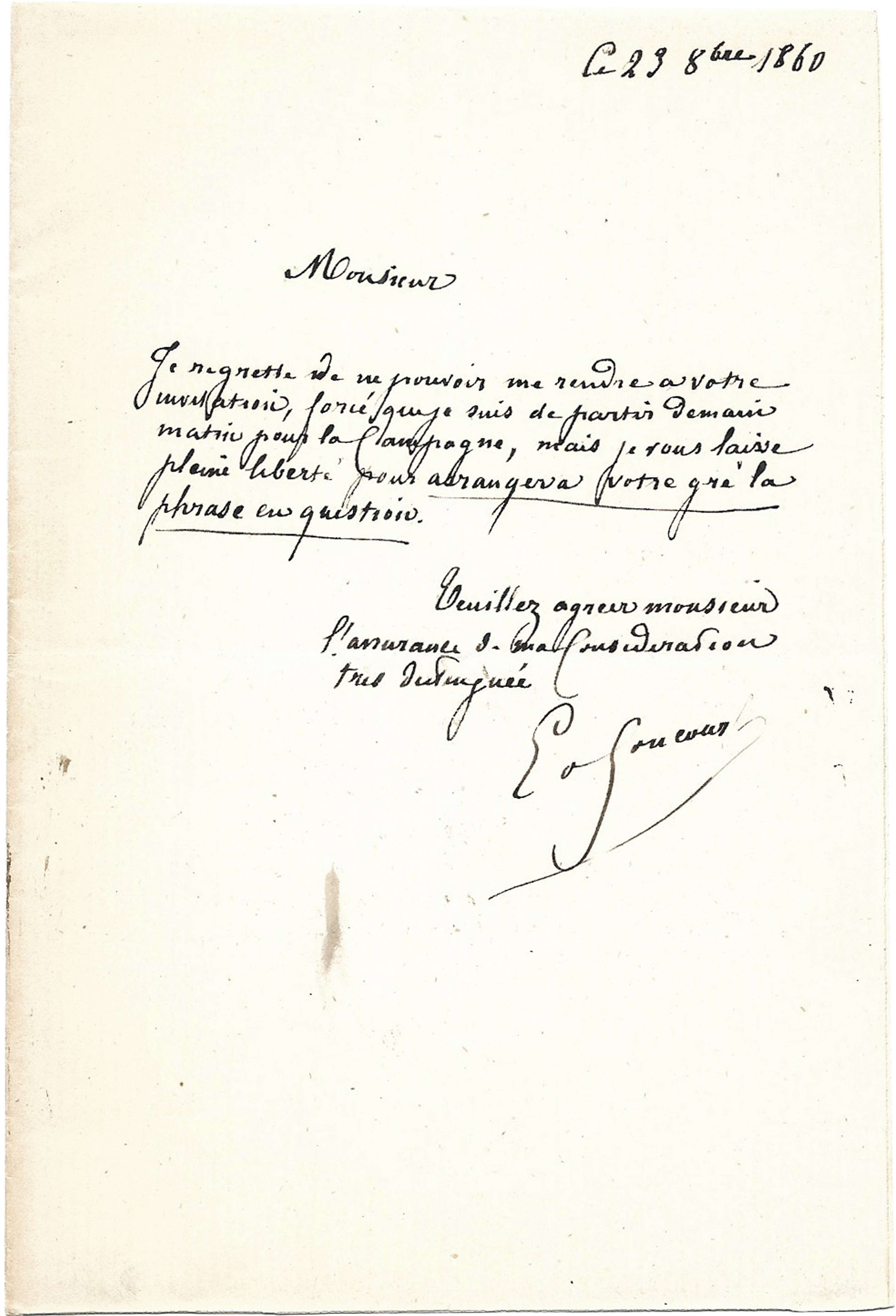 S.l., 23 oct. 1860, 1/2 p. in-8° sur papier vergé