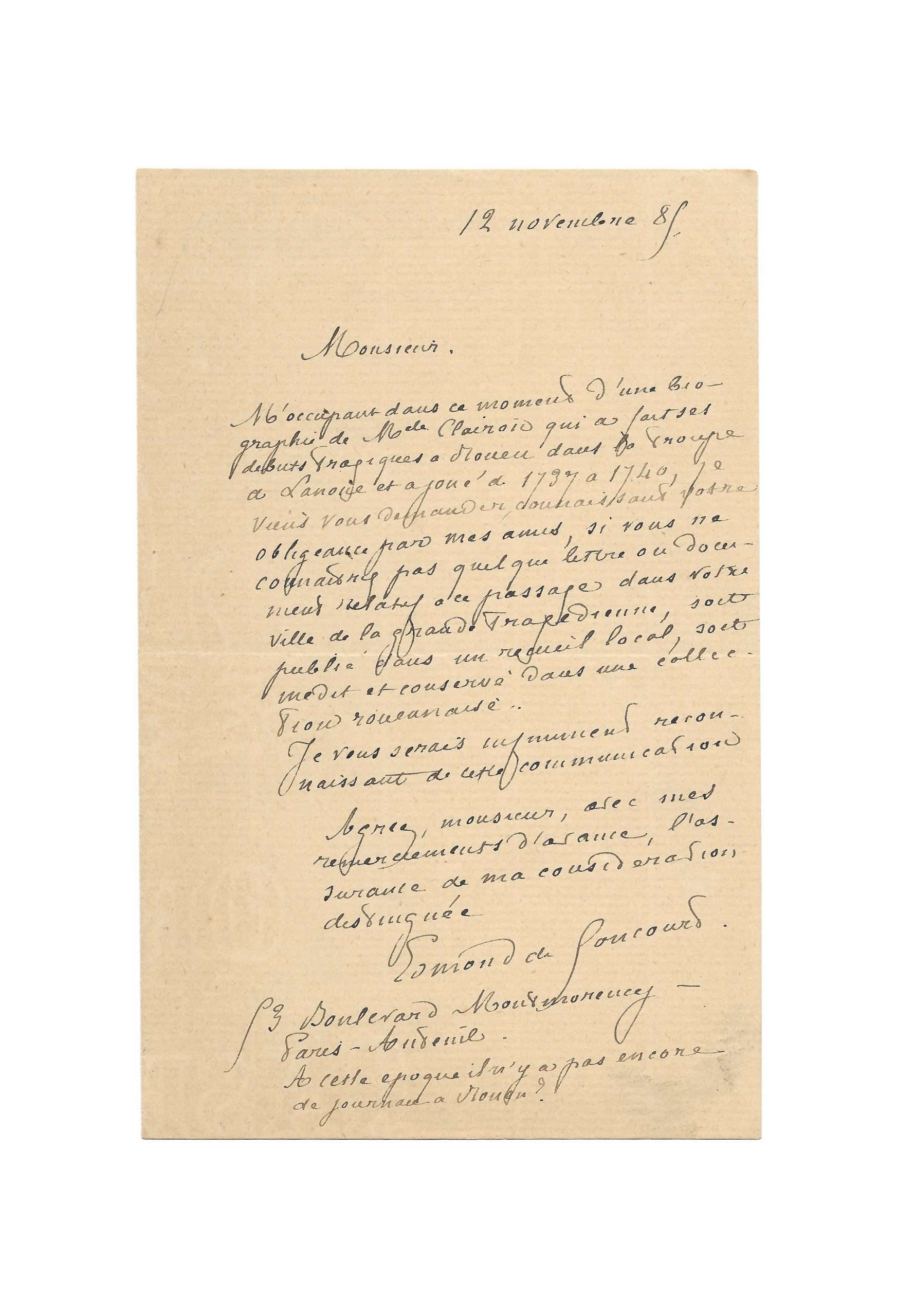 M’occupant en ce moment d’une biographie de Mlle Clairon qui a fait ses débuts tragiques à Rouen dans la troupe à Lanoue et a joué de 1737 à 1740, je viens vous demander, connaissant votre obligeance par mes amis, si vous ne connaissez pas quelque lettre ou document relatif à ce passage dans votre ville de la grande tragédienne, soit publié dans un recueil local soit mis et conservé dans une collection rouennaise.