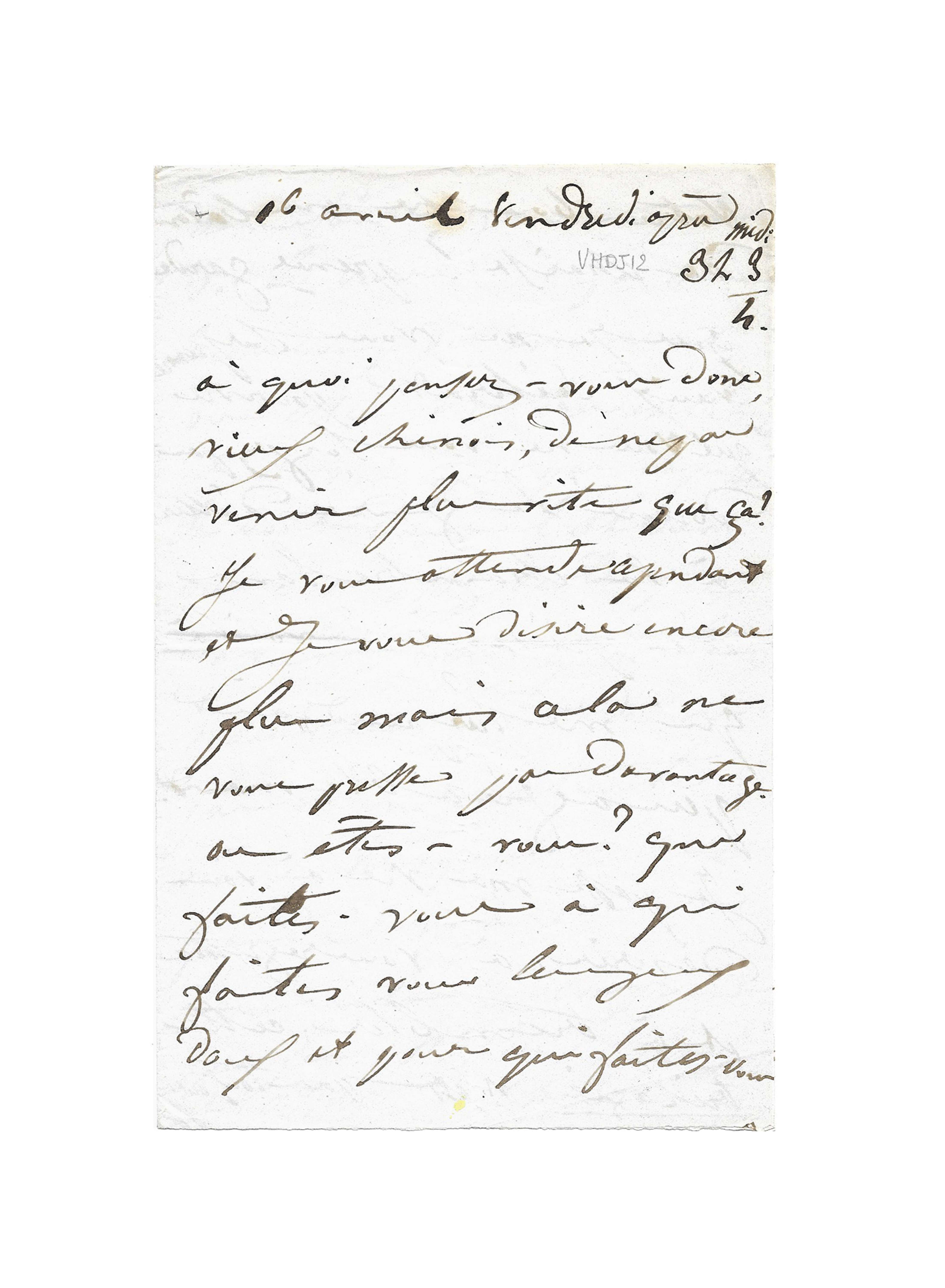 Deux lettres du 16 avril 1847 nous sont aujourd’hui parvenues. Celle-ci est écrite de l’après midi. D’un style parfois décousu, Juliette y joue avec les sonorités, caractéristique de son esprit et dont seul Victor Hugo pouvait en saisir toutes les subtilités.