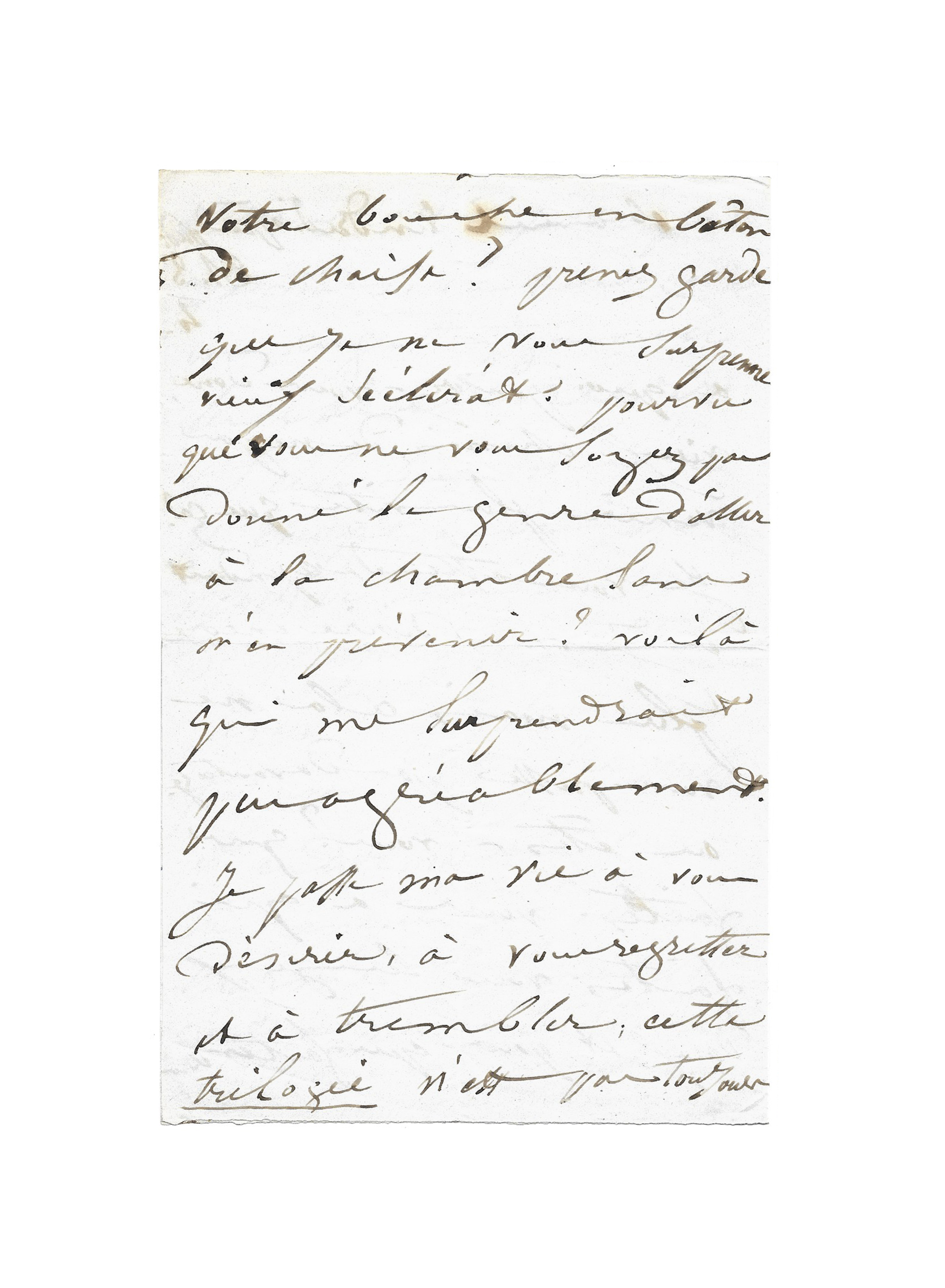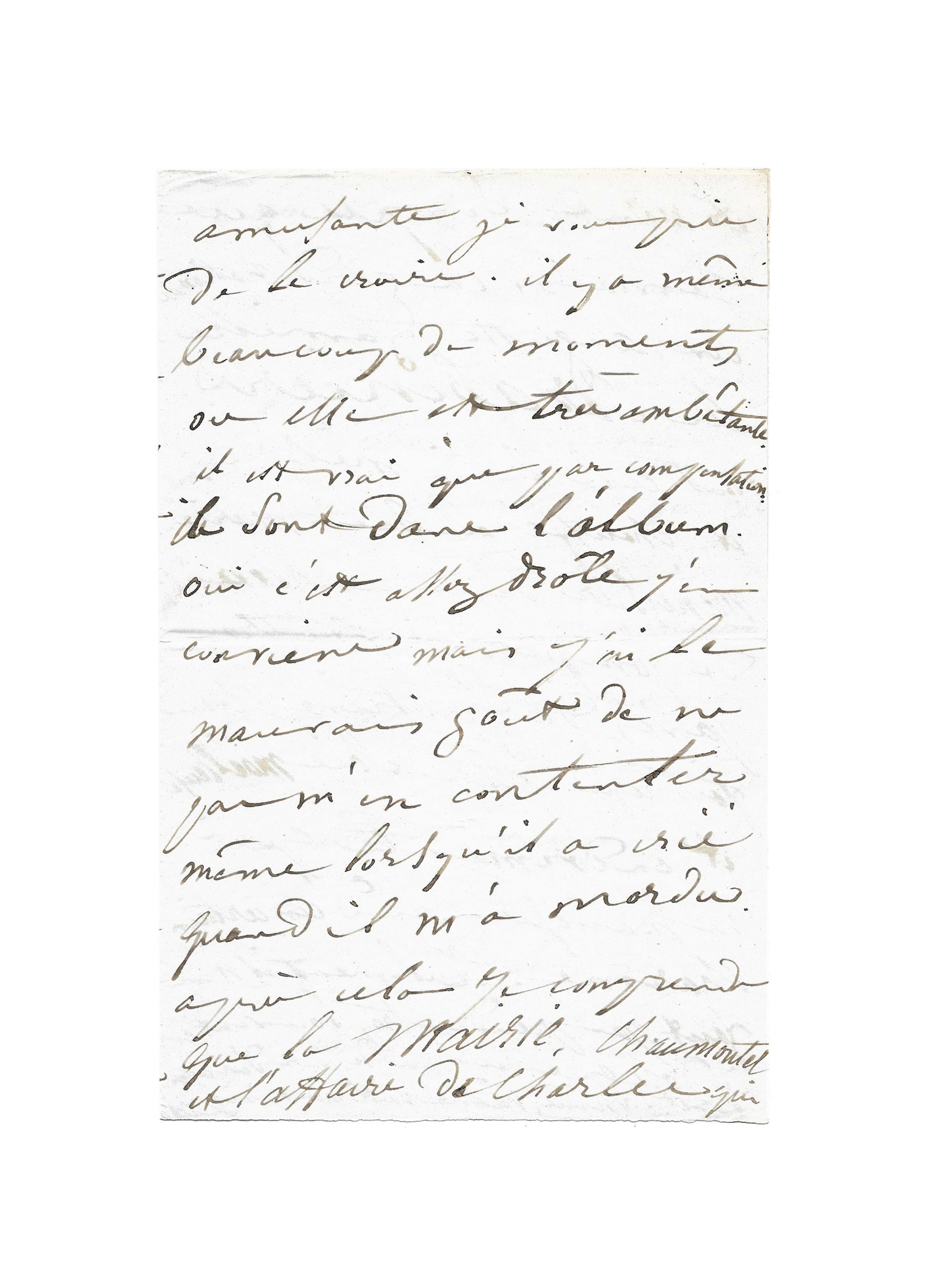 À quoi pensez-vous donc, vieux chinois, de ne pas venir plus vite que ça ? Je vous attends cependant et je vous désire encore plus mais cela ne vous presse pas davantage. Où êtes-vous ? Que faites-vous, à qui faites-vous les yeux doux et pour qui faites-vous votre bouche en bâton de chaise ? Prenez garde que je ne vous surprenne, vieux scélérat ! Pourvu que vous ne vous soyez pas donné le genre d’aller à la Chambre sans me prévenir ? Voilà qui me surprendrait peu agréablement. Je passe ma vie à vous désirer, à vous regretter et à trembler, cette trilogie n’est pas du toujours amusante, je vous prie de le croire. Il y a même beaucoup de moments où elle est très embêtante1. Il est vrai que par compensation ils sont dans l’album. Oui c’est assez drôle j’en conviens mais j’ai le mauvais goût de ne pas m’en contenter même lorsqu’il a crié quand il m’a mordu. Après cela je comprends que la MAIRIE, Chaumontel et l’affaire de Charles qui est moins simple que jamais, la garde nationale, son auguste famille les CARABINIERS2. Tout cela, bien mêlé ensemble et chauffé au bain marie-Ménessier3 dans un seau4 d’eau de pompe et deux ou trois pavés de Fontainebleau, fait une petite scie moelleuse et endormante qui ne manque pas d’un certain charme. Seulement il n’en faut pas prendre trop souvent et à dose que veux-tu de peur d’en user l’effet. Voime, voime5, voilà mon opinion.