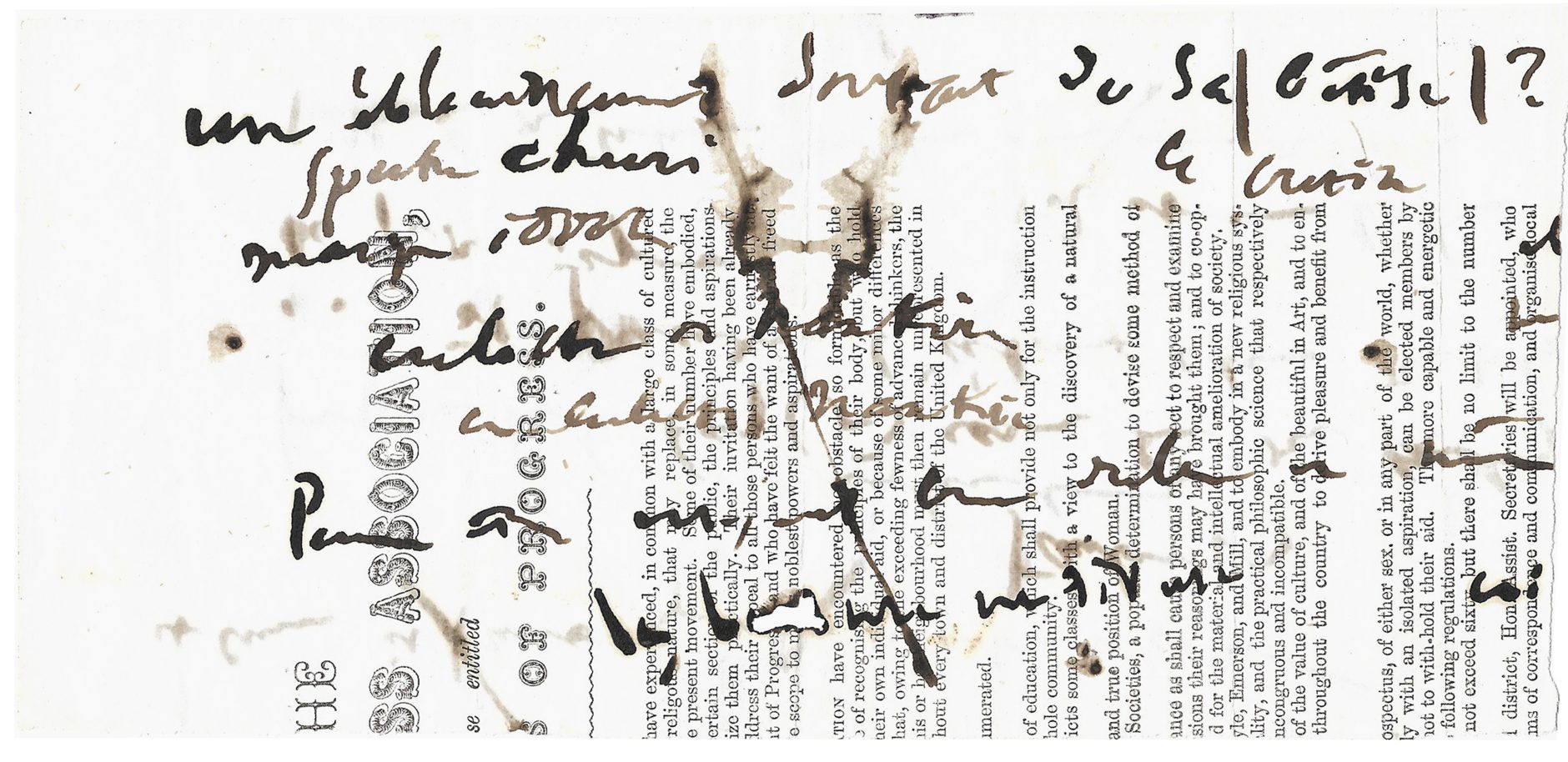 Copeaux autographes au dos d’un bulletin d’adhésion à une société progressiste anglaise « The Social progress association » (Association pour le progrès social)