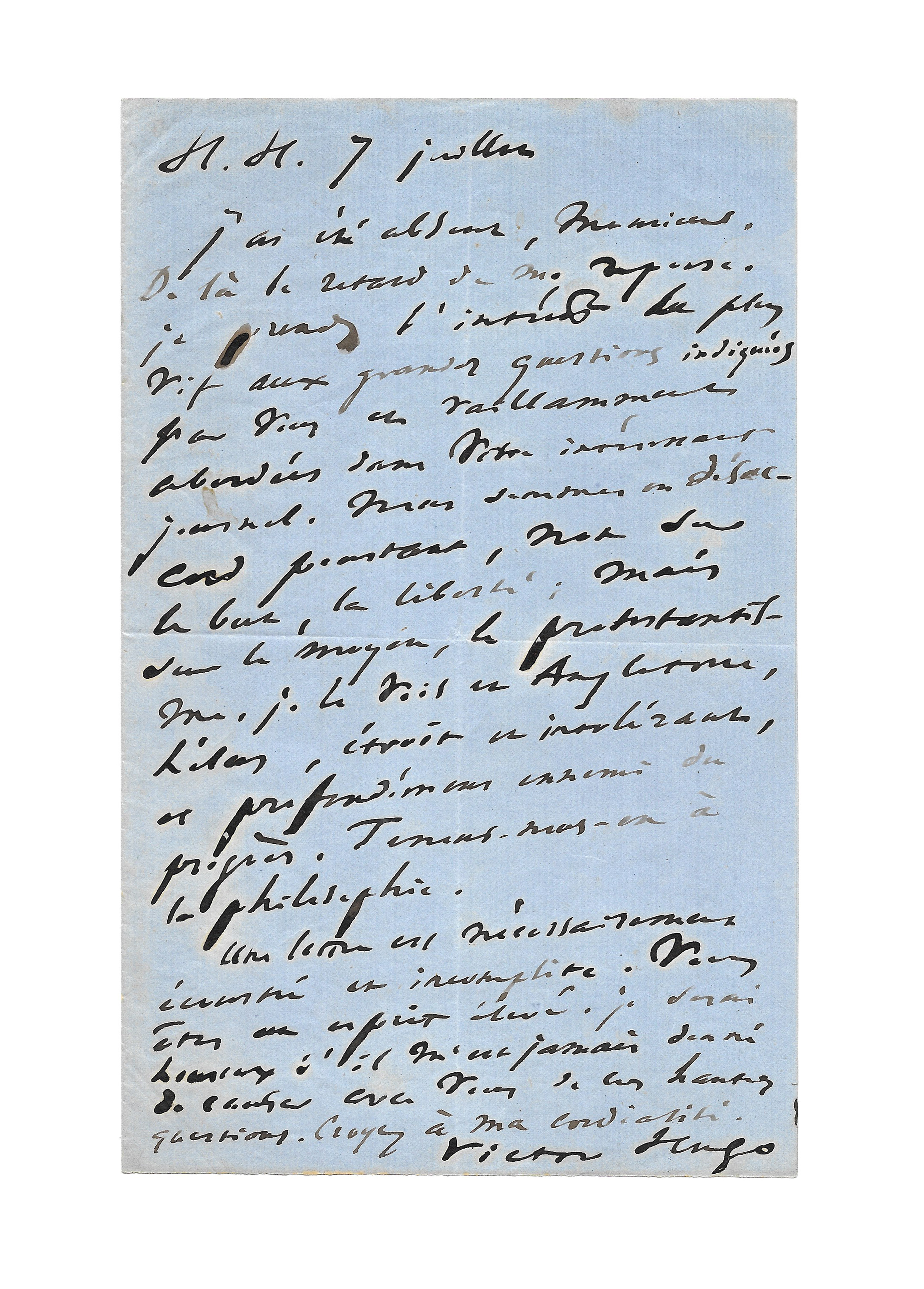 H.H. [Hauteville-House, Guernesey], 7 juillet [1858 ?], 1 p. in-8° sur bifeuillet vergé bleu