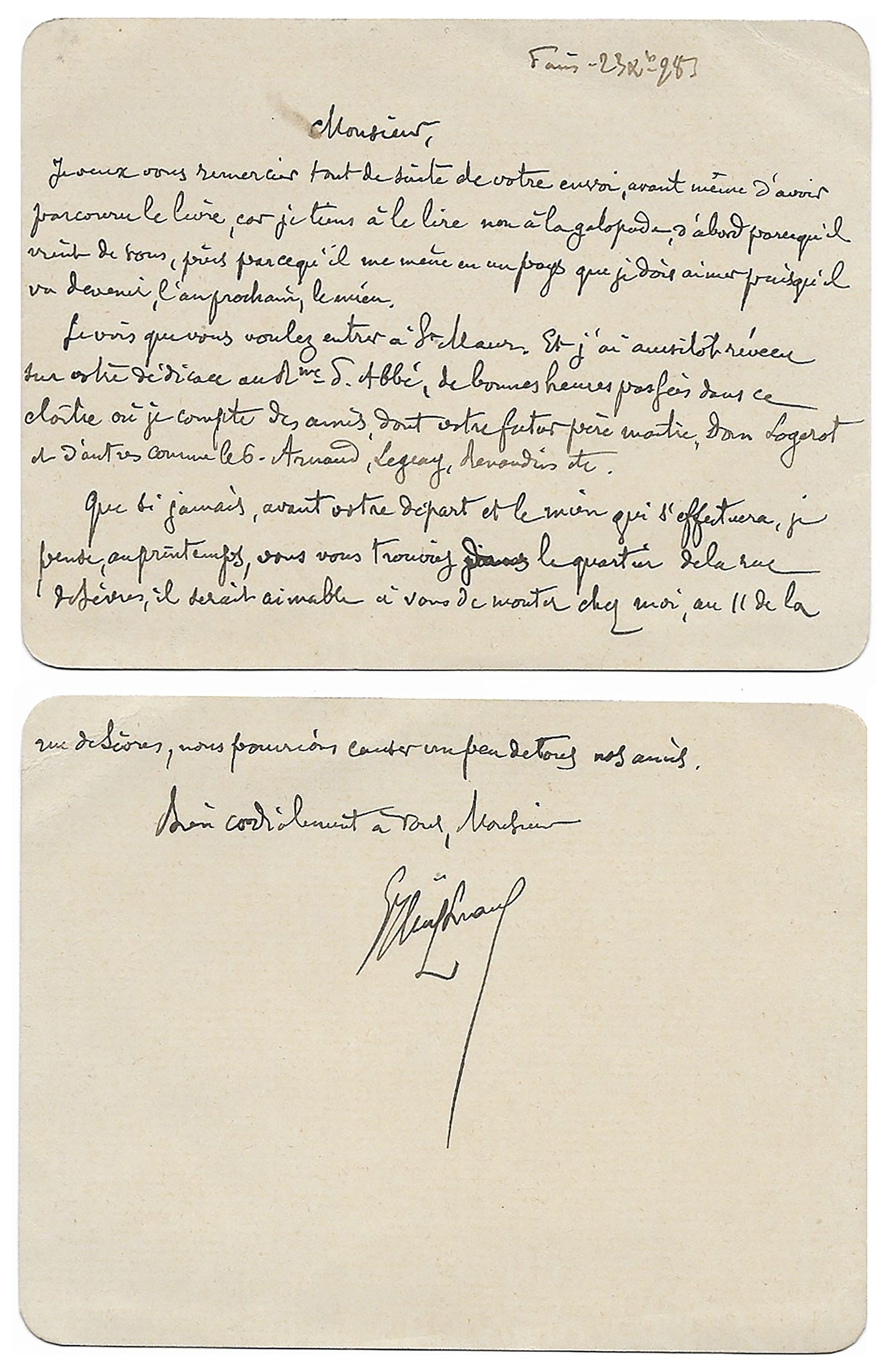 Je vois que vous voulez entrer à St Maur. Et j’ai aussitôt revécu sur votre dédicace au M[onast]ère S. Abbé, de bonnes heures parfois dans ce cloître où je compte des amis, dont votre futur père maître, Don Logerot et d’autres comme le G. Armand, Legray, Devaudin etc.