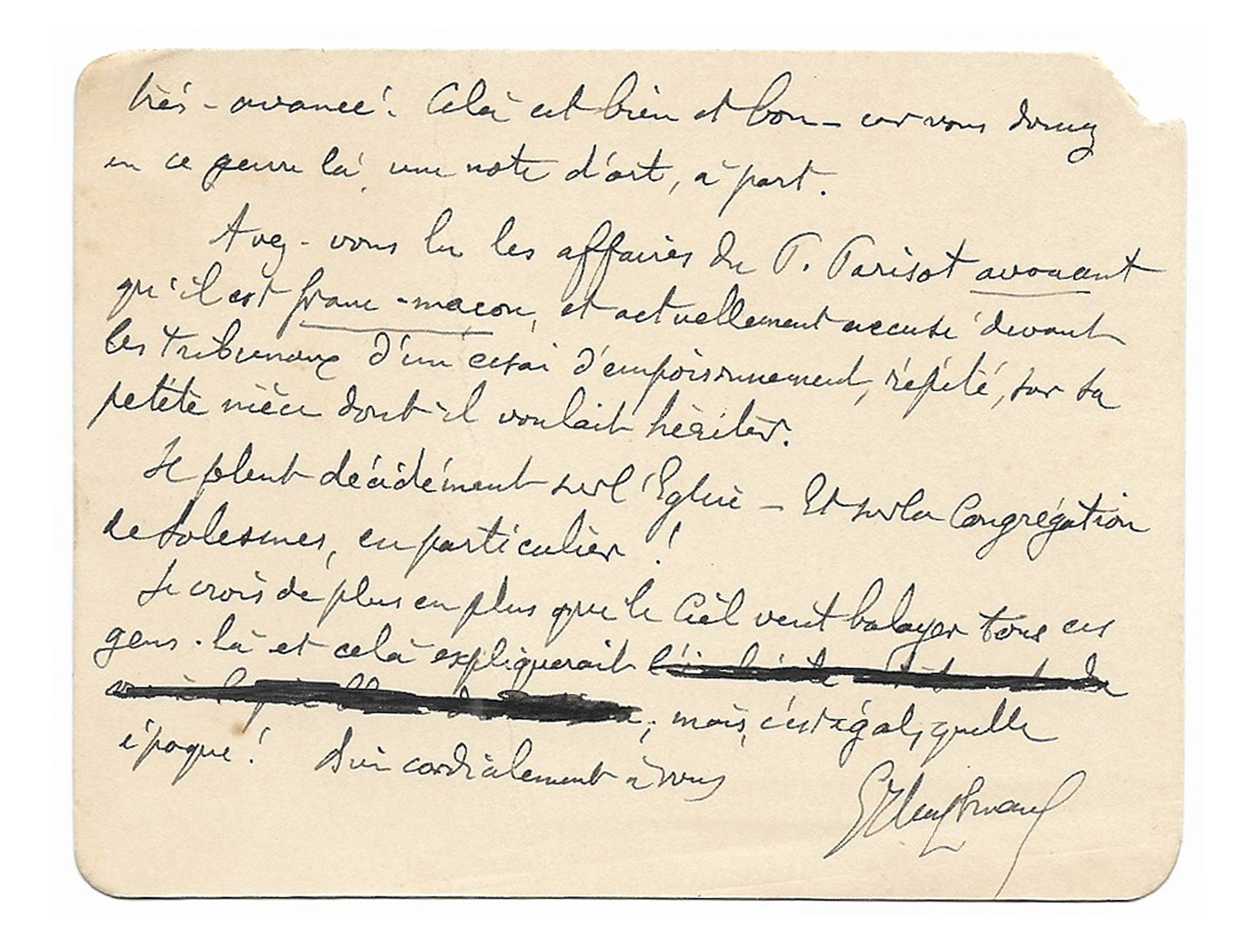 Je crois de plus en plus que le Ciel veut balayer tous ces gens-là et cela expliquerait [plusieurs mots caviardés], mais c’est égal, quelle époque ! Bien cordialement à vous