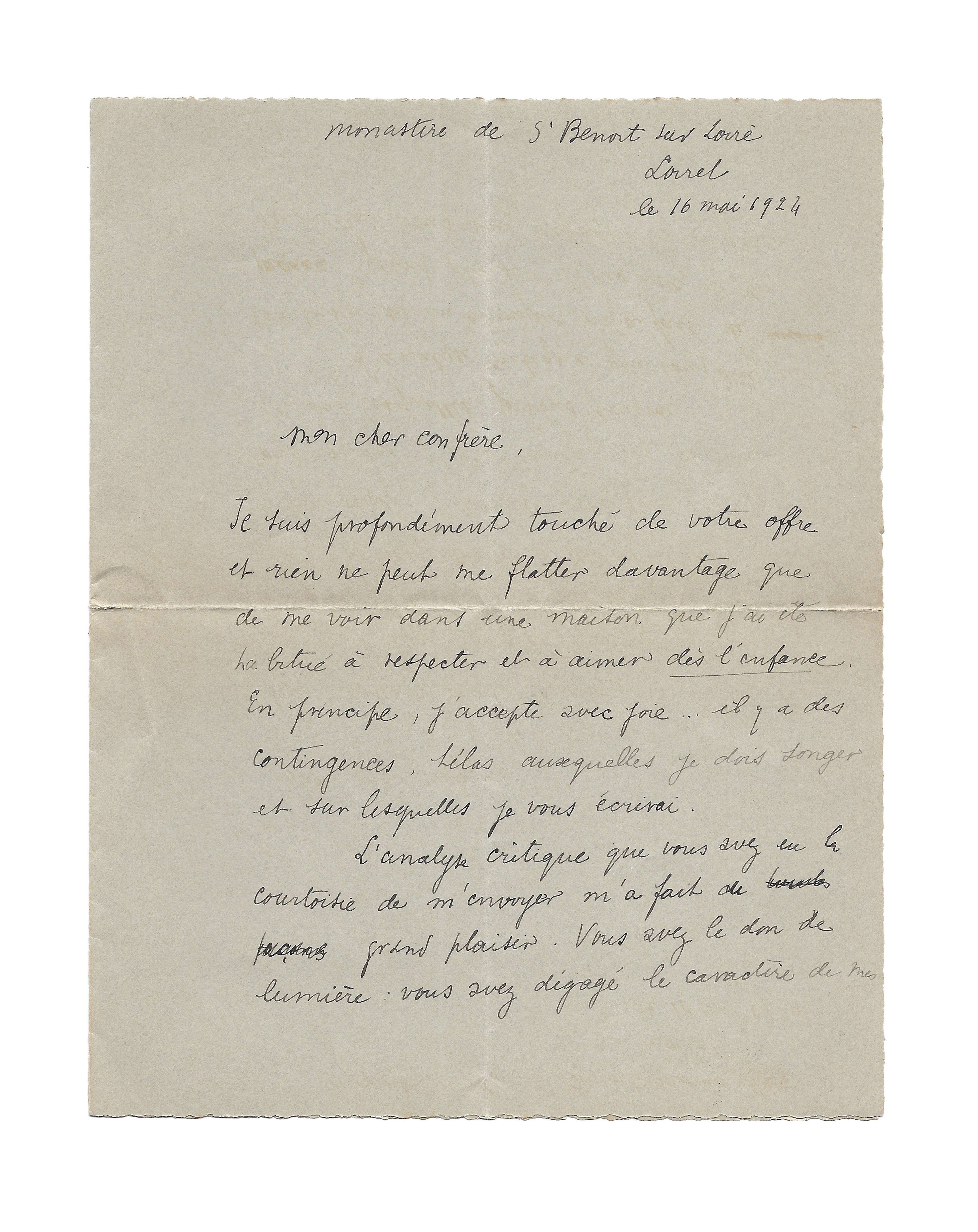 Monastère de St Benoît-sur-Loire, 16 mai 1924, 2 p. in-8° sur bifeuillet