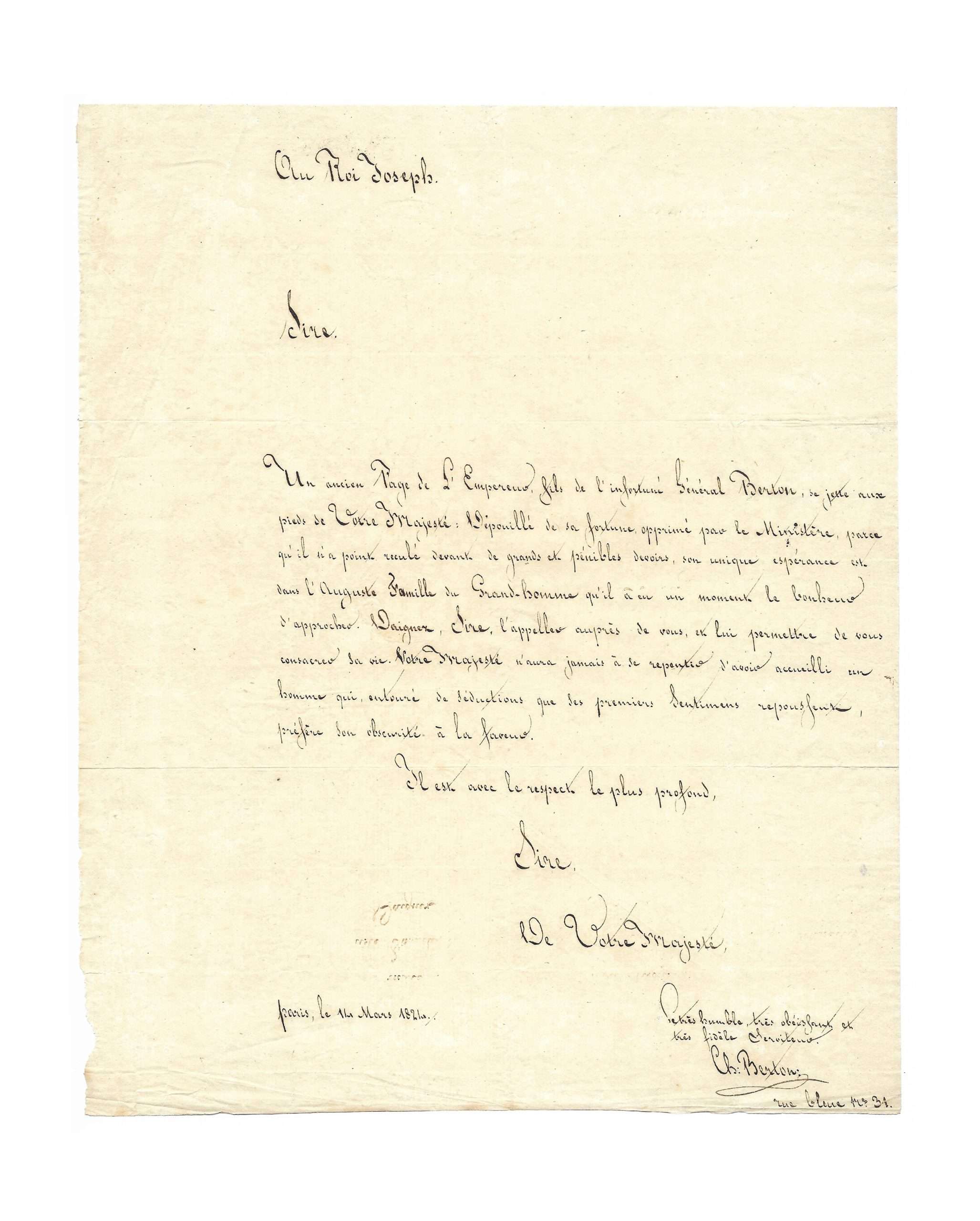 Un ancien page de l’Empereur fils de l’infortuné Général Berton, se jette au pied de votre majesté. Dépouillé de sa fortune, opprimé par le Ministre parce qu’il n’a point reculé devant de grands et pénibles devoirs, son unique espérance est dans l’auguste famille du Grand Homme qu’il a eu un moment le bonheur d’approcher.