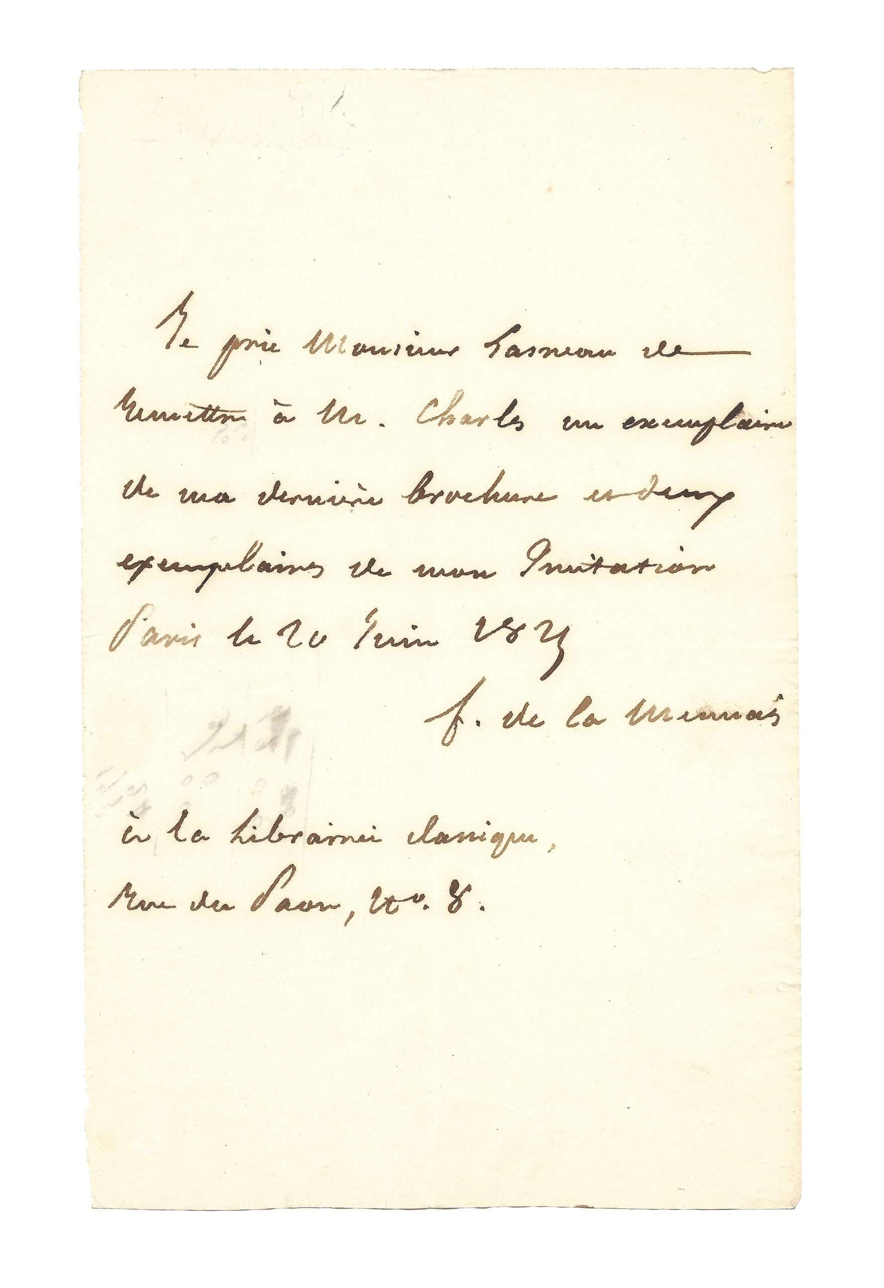 « Je prie Monsieur Lasneau de remettre à Mr Charles un exemplaire de ma dernière brochure et deux exemplaires de mon Imitation.