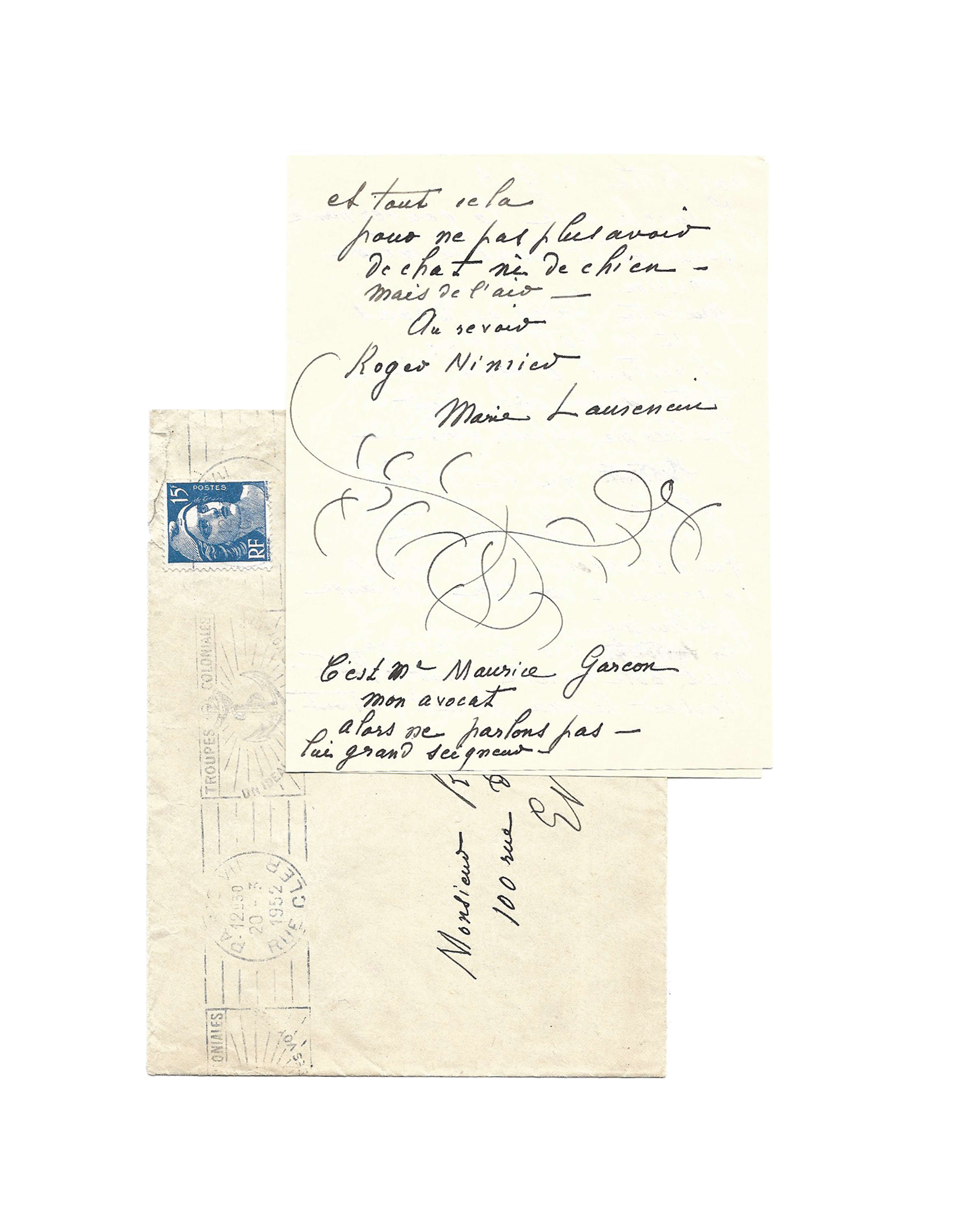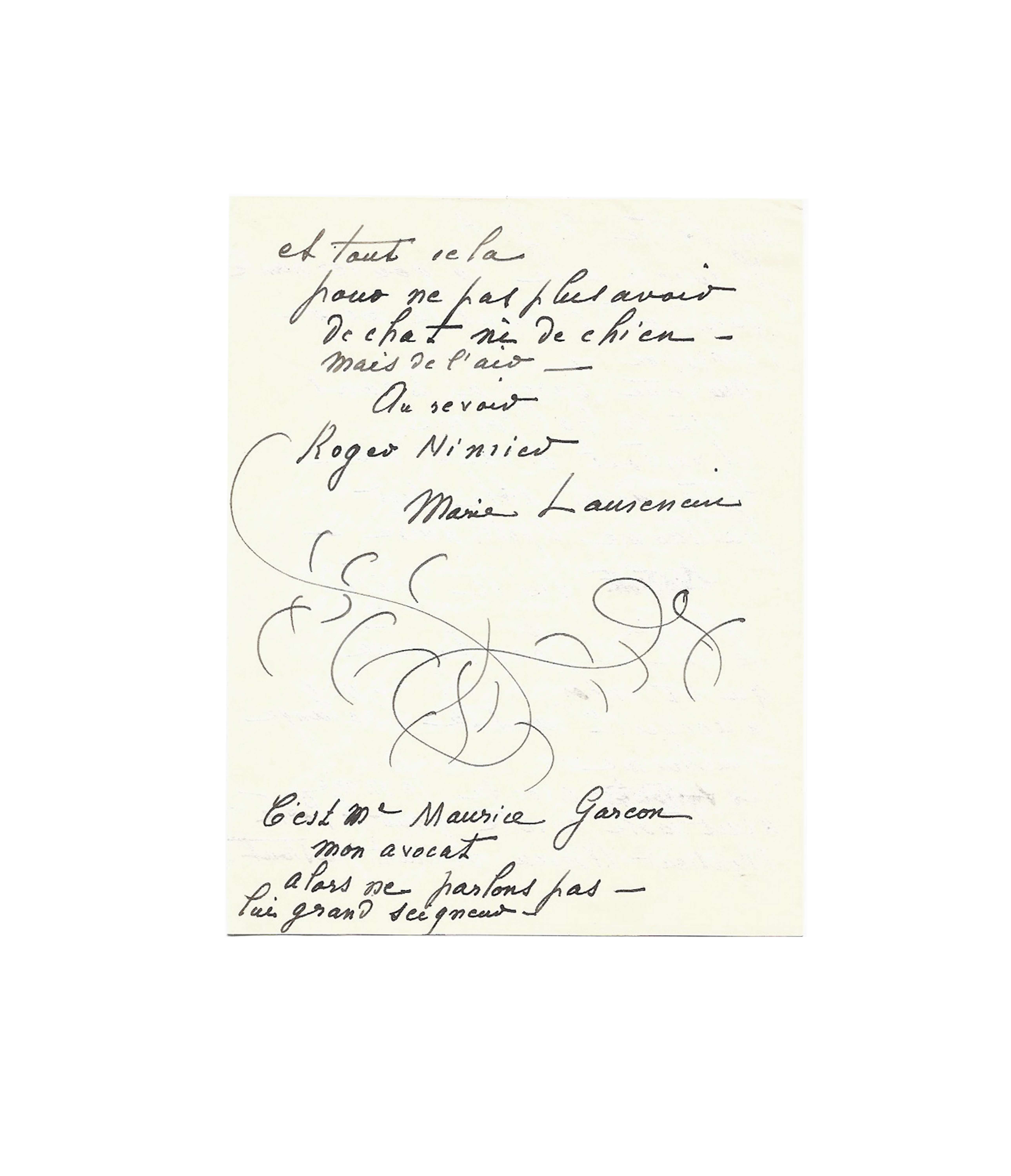Lettre autographe signée « Marie Laurencin » à Roger Nimier