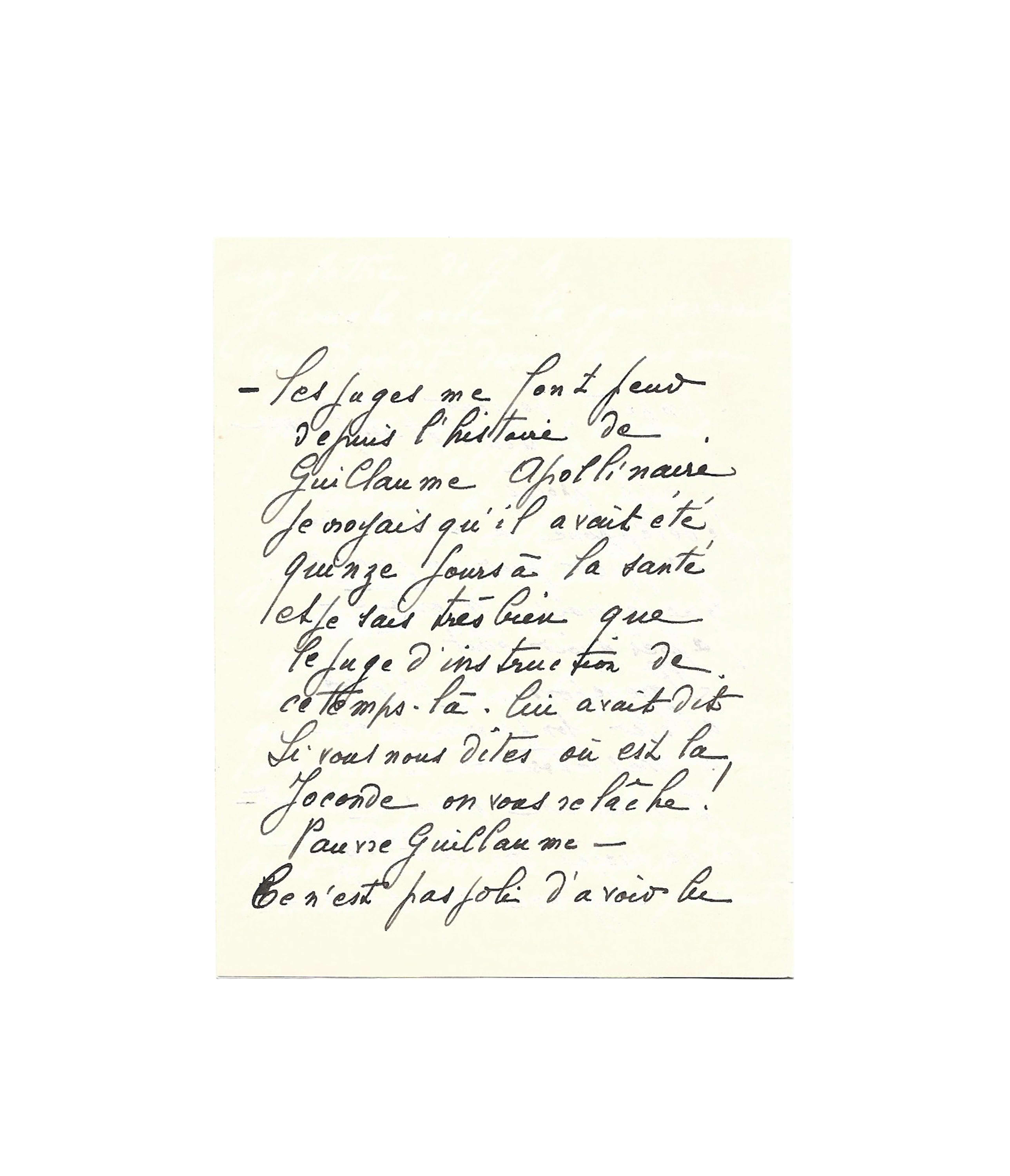 Je croyais qu’il avait été quinze jours à la [Prison de la] santé et je sais très bien que le juge d’instruction de ce temps-là lui avait dit [:] Si vous me dites où est la Joconde on vous relâche ! Pauvre Guillaume –