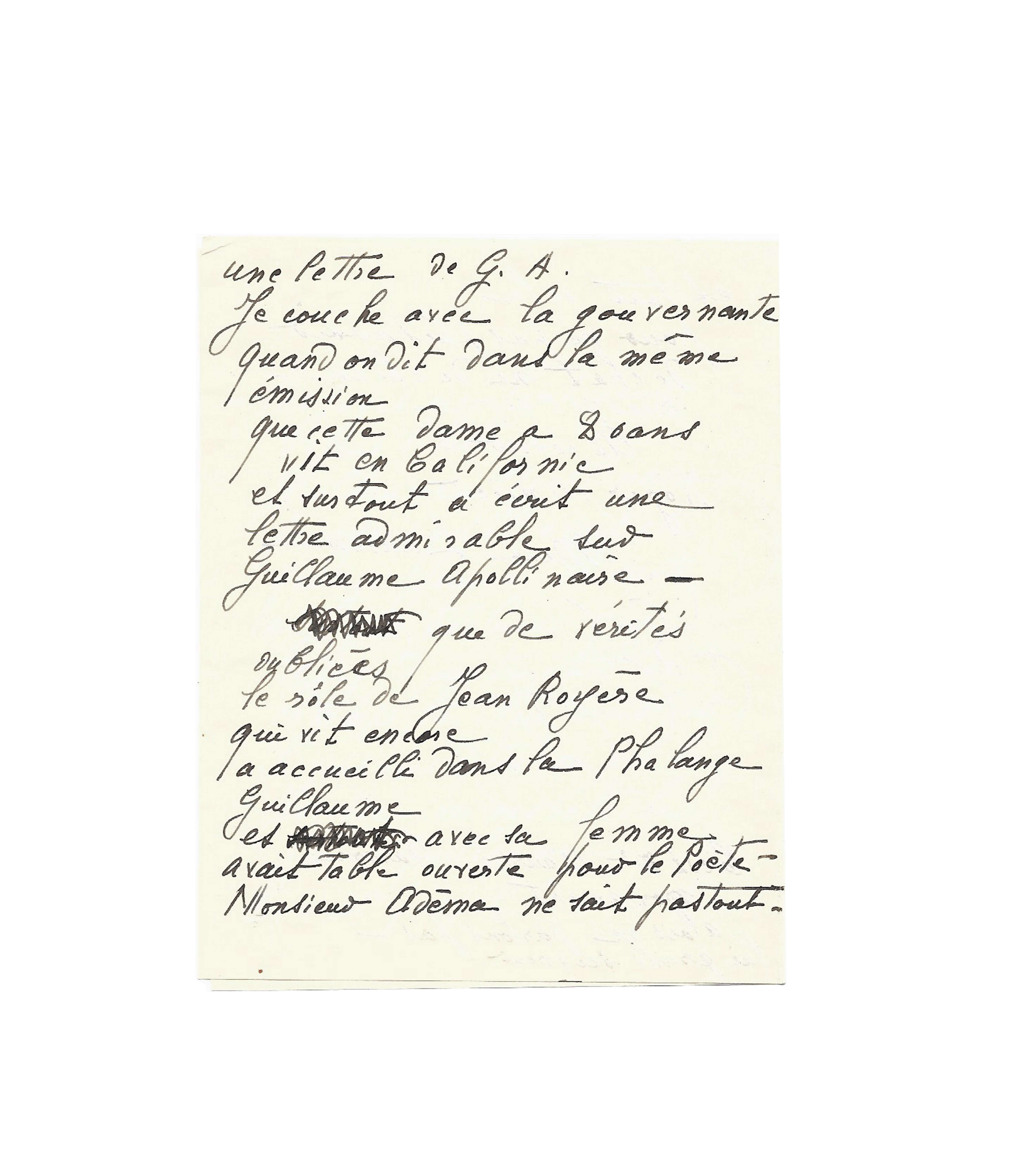 Surtout que de vérités oubliées. Le rôle de Jean Royère [décorateur français] qui vit encore à accueilli dans la Phalange [revue littéraire ayant paru entre 1906 et 1939] Guillaume et surtout avec sa femme avait table ouverte pour le poète – Monsieur Adéma ne sait pas tout [Marcel Adéma venait de faire paraître Guillaume Apollinaire, le mal aimé]