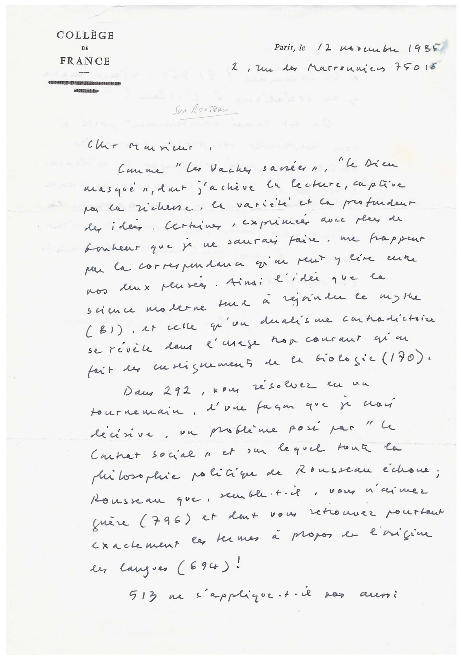 Lettre autographe signée « Claude Lévi-Strauss » [à Thierry Maulnier]