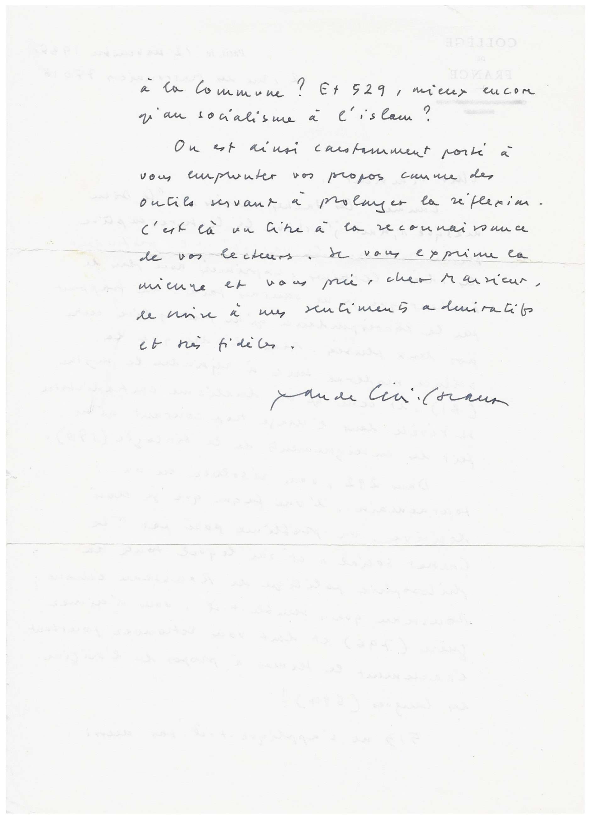 On est ainsi constamment porté à vous emprunter vos propos comme des outils servant à prolonger la réflexion. C’est là un titre à la reconnaissance de vos lecteurs. Je vous exprime la mienne et vous prie, cher Monsieur, ce croire à mes sentiments admiratifs et très fidèles.
