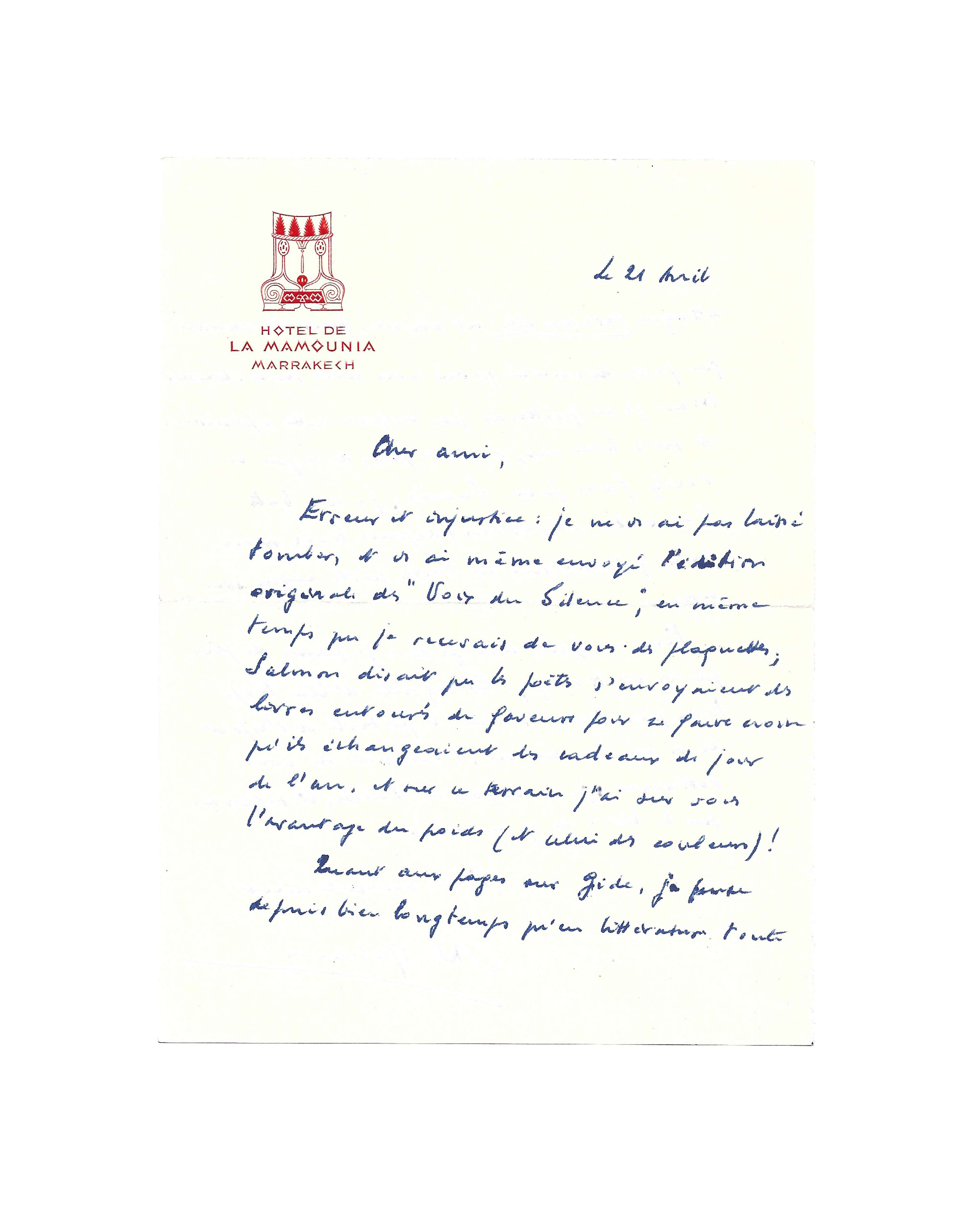 Marrakech, le 21 avril [1952], 2 pages in-8 en-tête imprimé de l’Hôtel de la Mamounia à Marrakech
