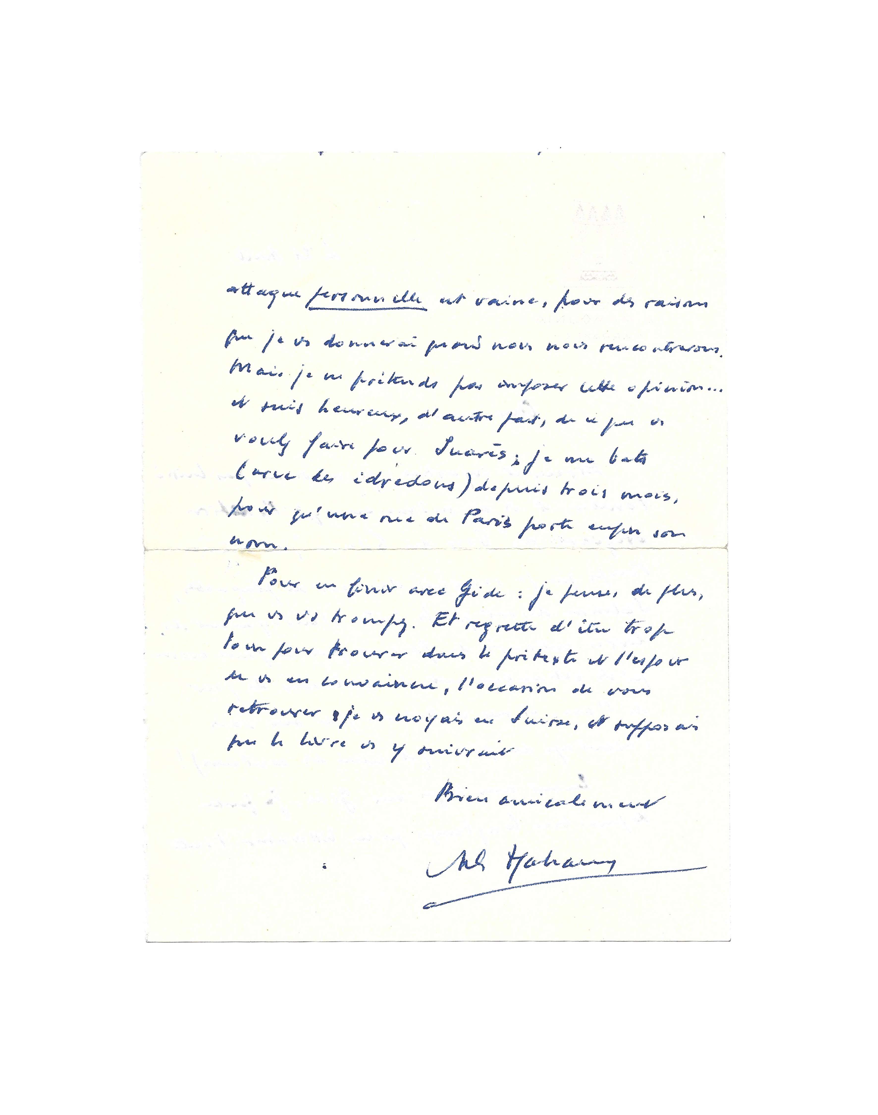 Quant aux pages sur [André] Gide, je pense depuis bien longtemps qu’en littérature toute attaque personnelle est vaine, pour des raisons que je vous donnerai quand nous nous rencontrerons. Mais je ne prétends pas imposer cette opinion… et suis très heureux, d’autre part, de ce que vous voulez faire pour Suarès ; je me bats (avec des édredons) depuis trois mois, pour qu’une rue de Paris porte enfin son nom.