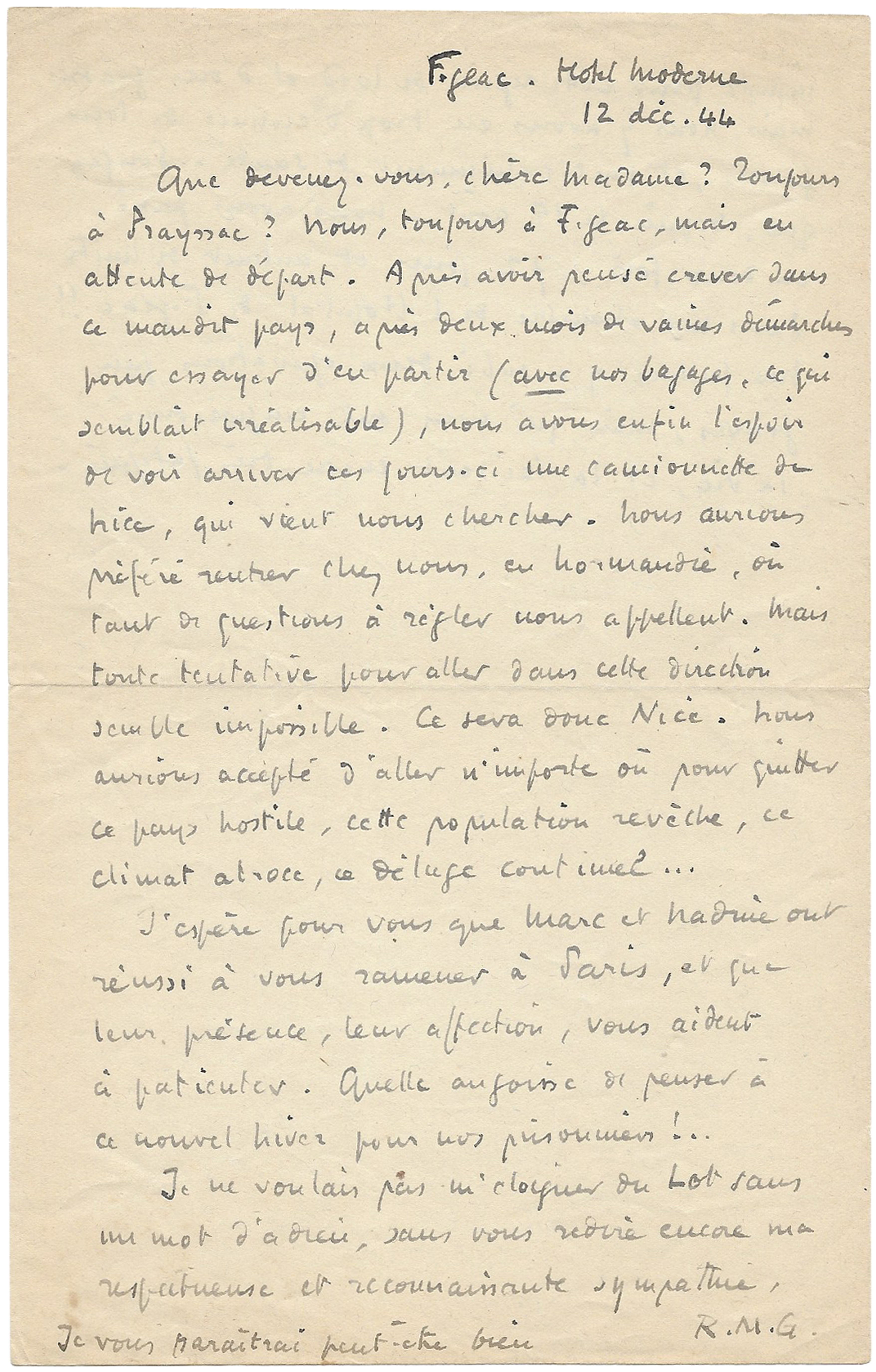 « Que devenez-vous, chère Madame ? Toujours à Prayssac ? Nous, toujours à Figeac, mais en attente de départ. Après avoir pensé crever dans ce maudit pays, après deux mois de vaines démarches pour essayer d’en partir (avec nos bagages, ce qui semblait irréalisable), nous avons enfin l’espoir de voir arriver ces jours-ci une camionnette de Nice, qui vient nous chercher. Nous aurions préféré rentrer chez nous, en Normandie, où tant de questions à régler nous attendent. Mais toute tentative pour aller dans cette direction semble impossible. Ce sera donc Nice. Nous aurions accepté d’aller n’importe où pour quitter ce pays hostile, cette population revêche, ce climat atroce, ce déluge continuel…