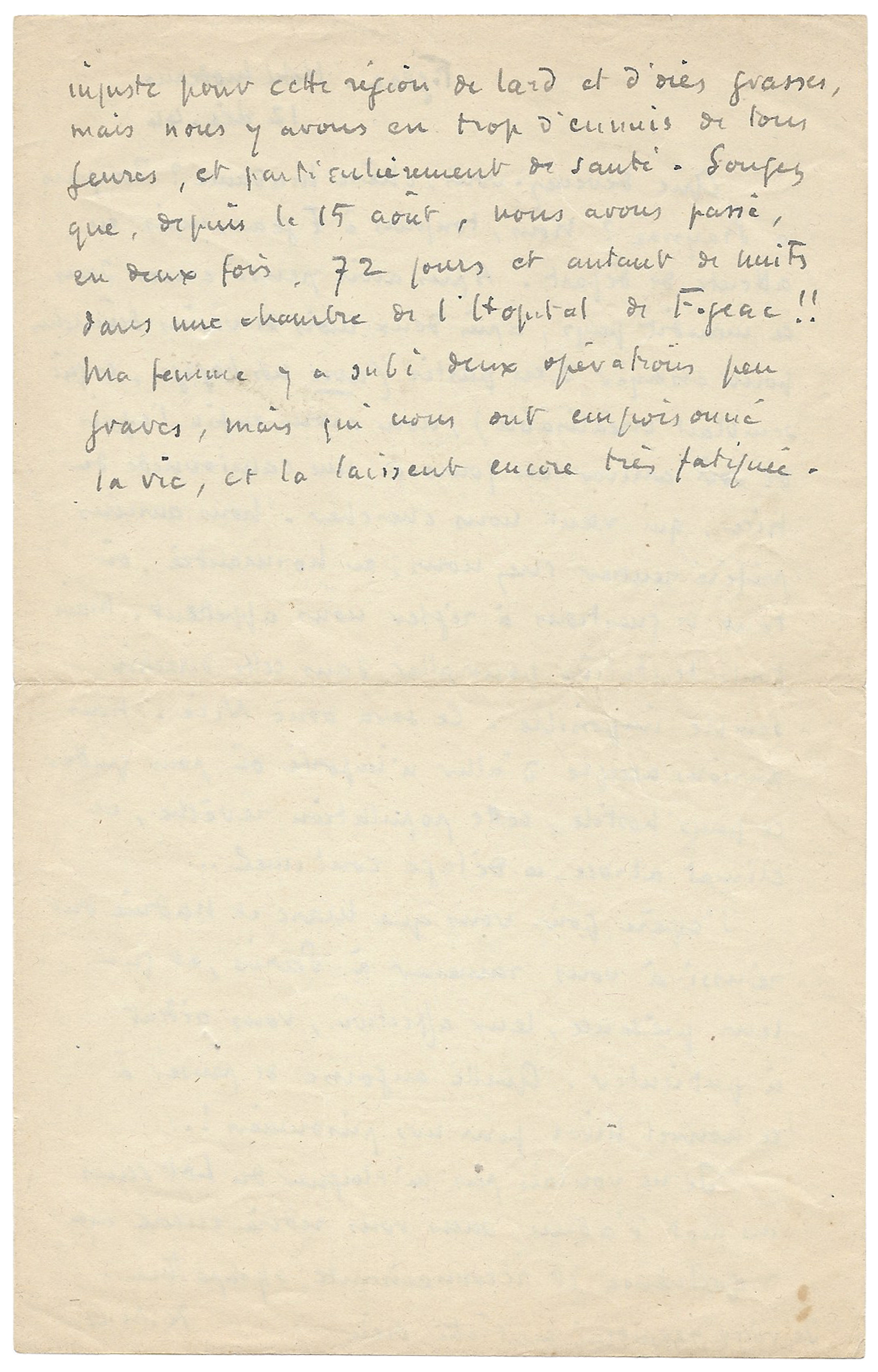 Je vous paraîtrai peut-être bien injuste pour cette région de lard et d’oies grasses, mais nous y avons eu trop d’ennuis de tous genres, et particulièrement de santé. Songez que, depuis le 15 août, nous avons passé, en deux fois, 72 jours et autant de nuits dans une chambre de l’Hôpital de Figeac !!! Ma femme y a subi deux opérations peu graves, mais qui nous ont empoisonné la vie, et la laissent encore très fatiguée. »