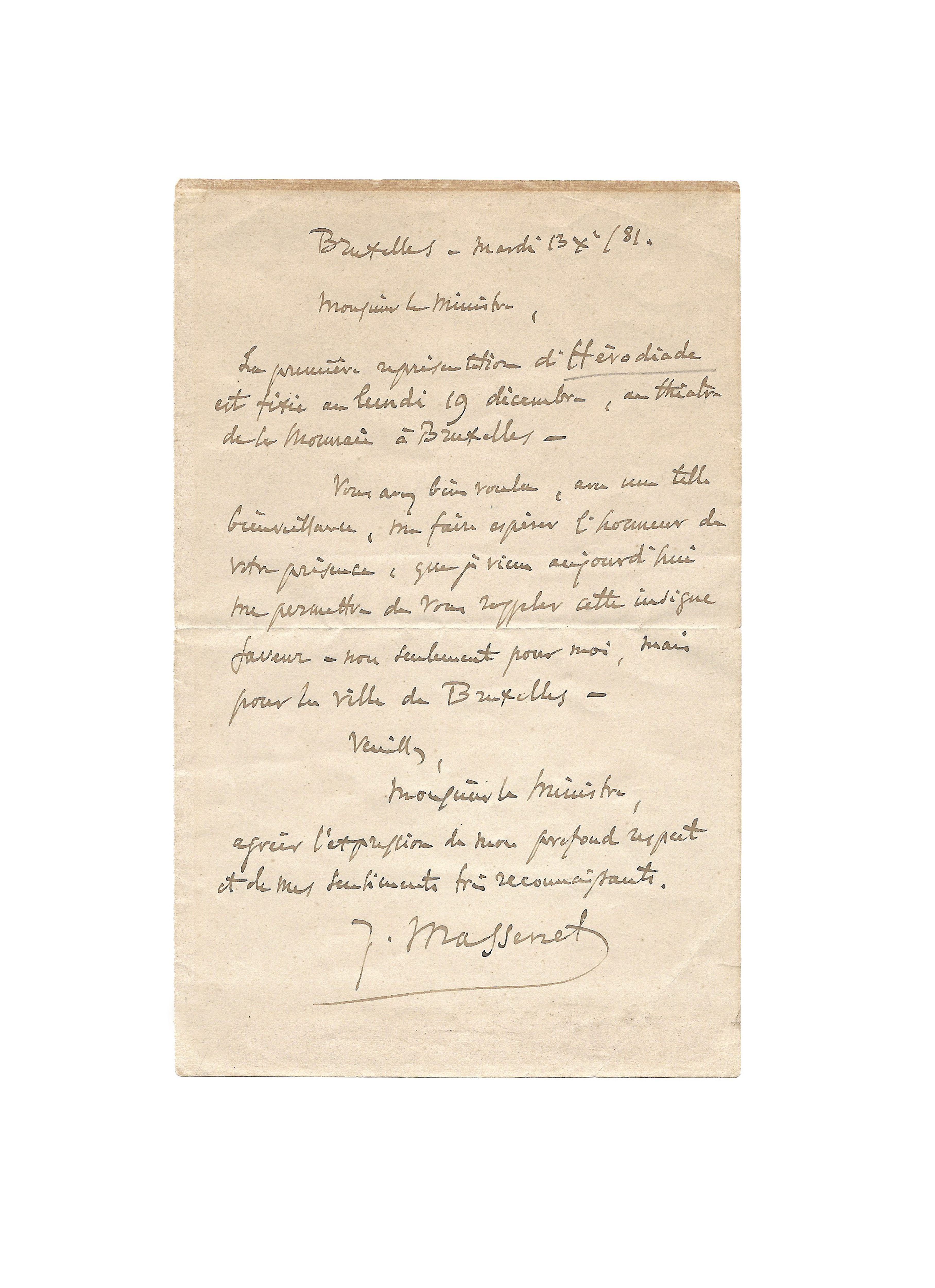 Solennelle demande du compositeur au ministre des Beaux-Arts pour assister à la toute première d’Hérodiade au théâtre de la Monnaie à Bruxelles