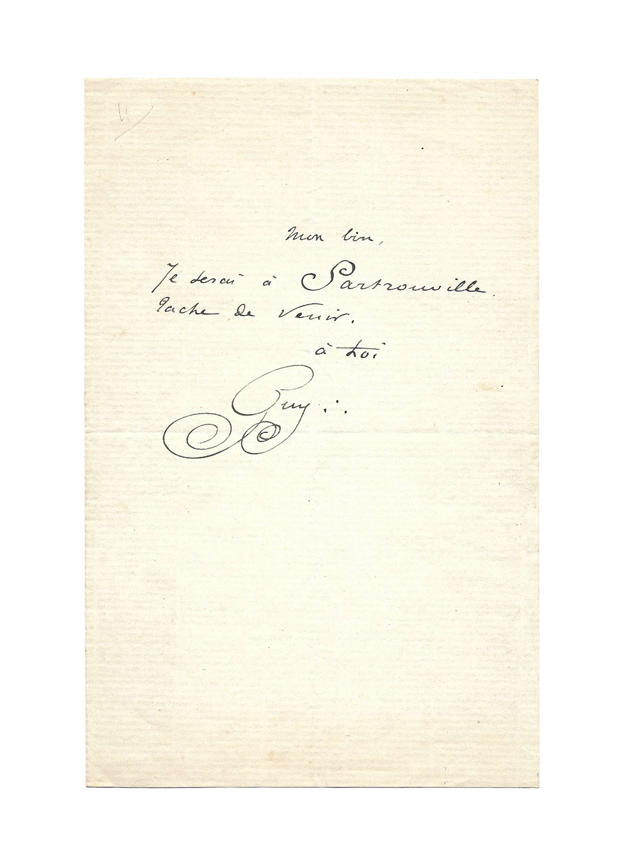 Lettre autographe signée « Guy » à « Mon Bien »