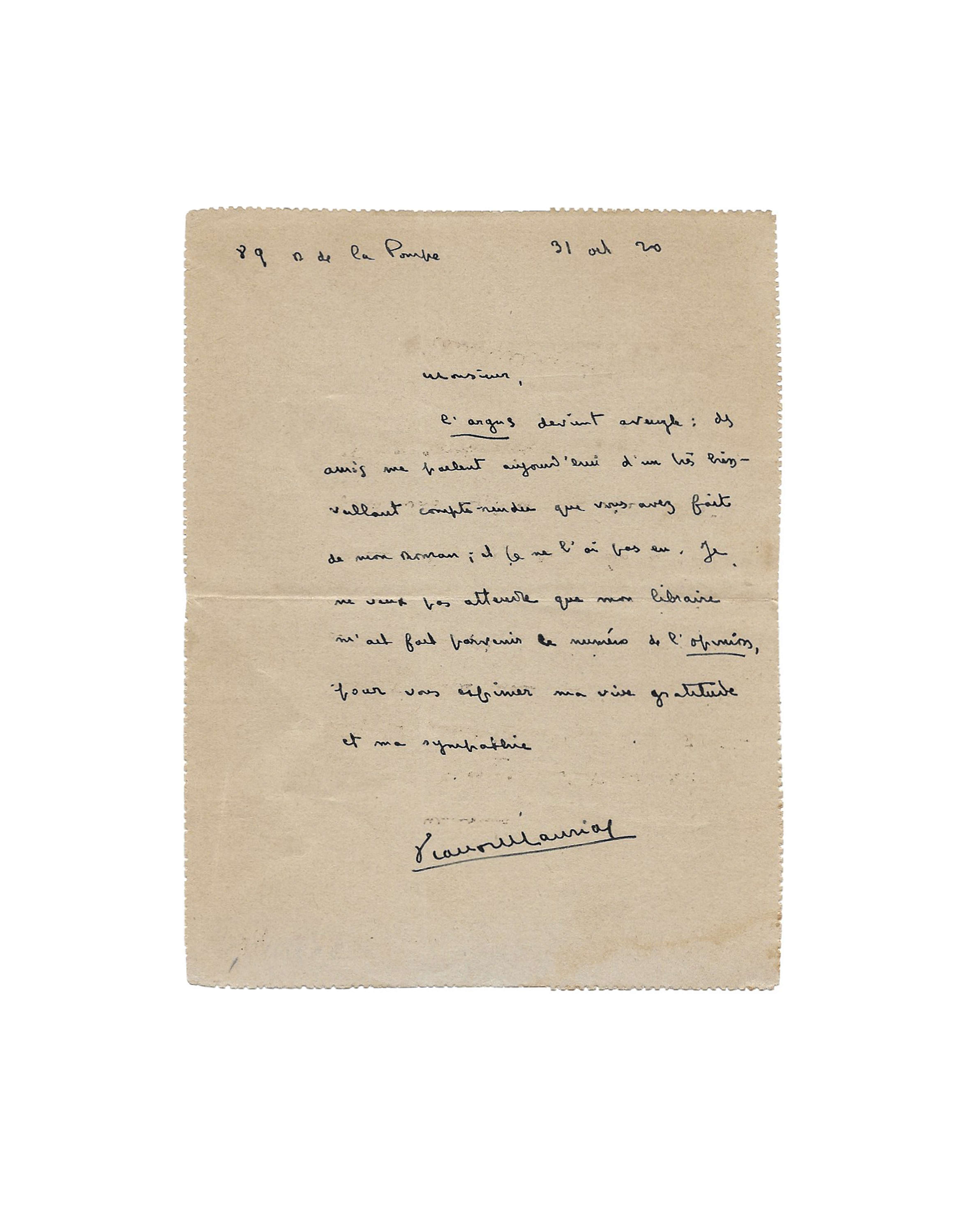 Mauriac remercie son correspondant de la critique élogieuse publiée dans L’Opinion pour son roman tout récemment paru : La Chair et le Sang
