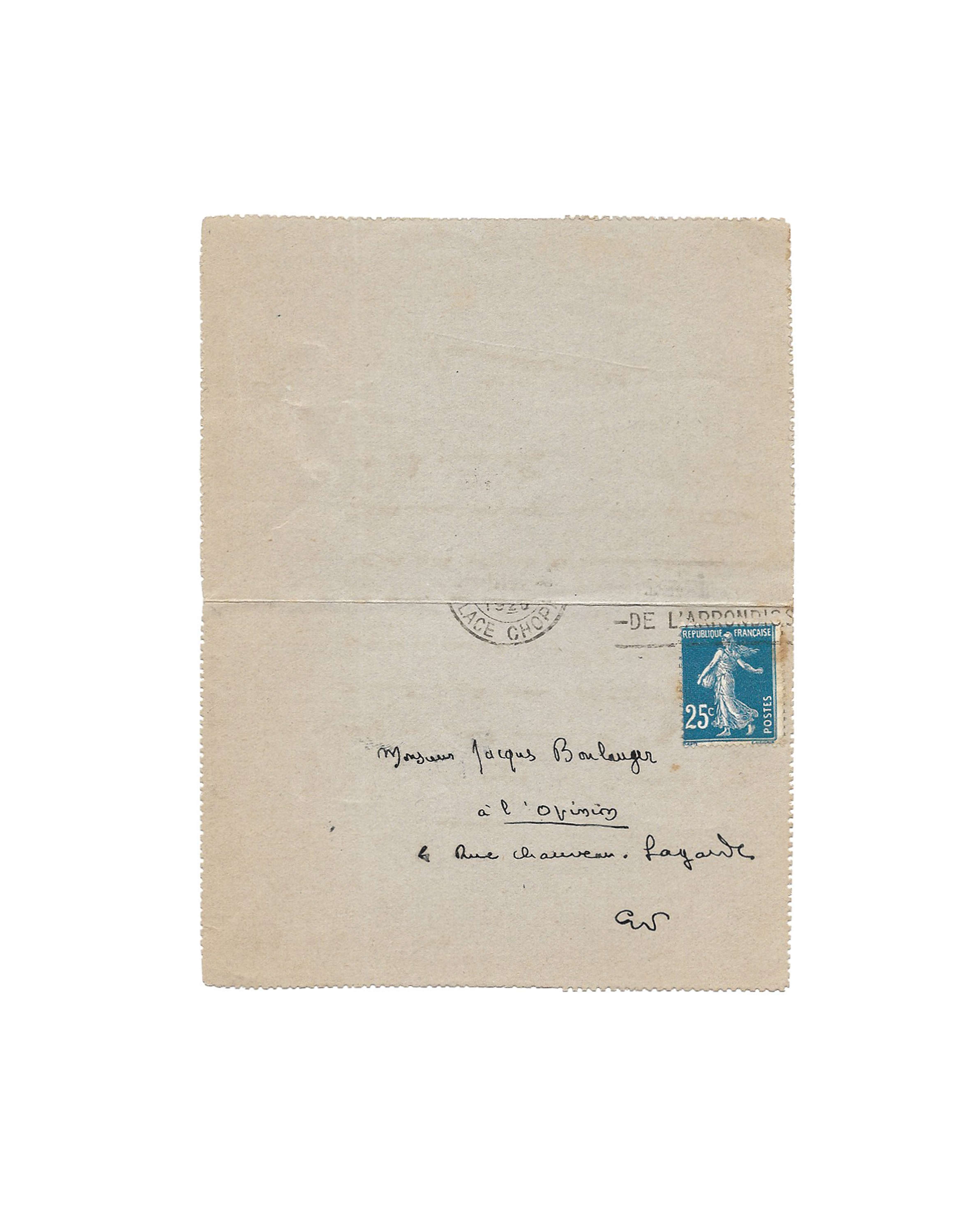 [Paris] 89 rue de la Pompe, 31 oct[obre] 1920, 1 p. in-12°