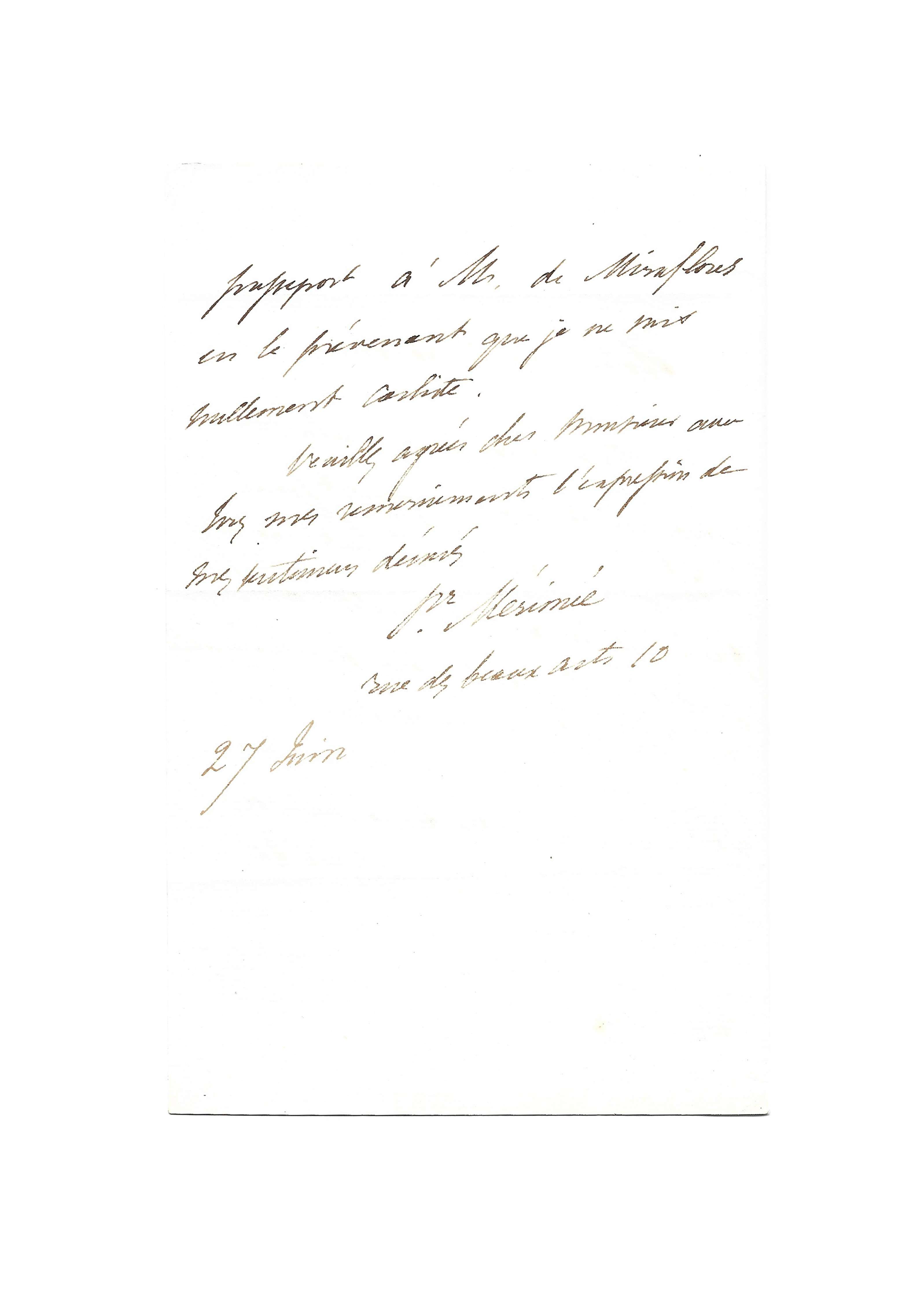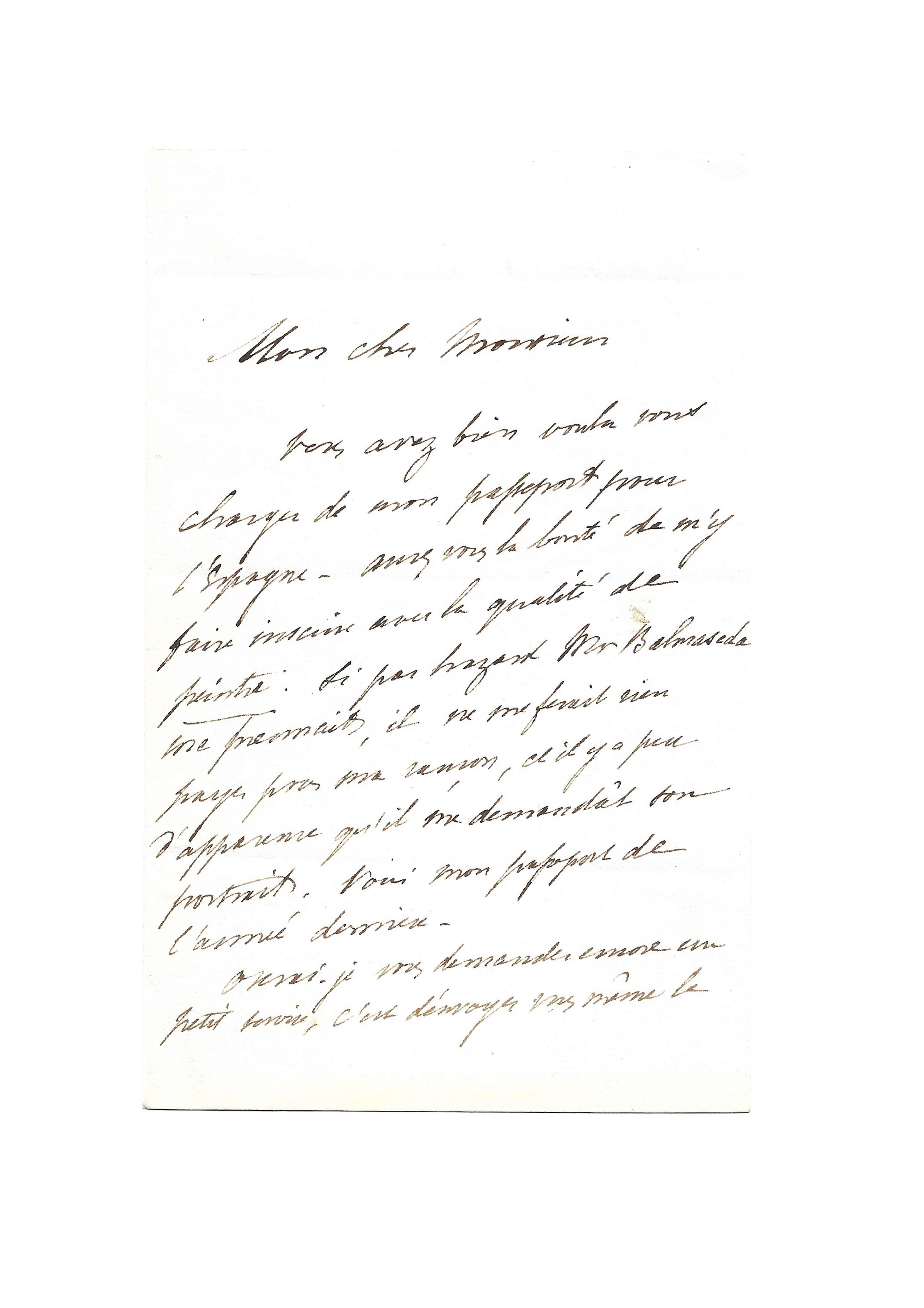 Prosper Mérimée s’adresse au chef de cabinet d’Adolphe Thiers, alors président du conseil et ministre des affaires étrangères du roi Louis-Philippe, pour l’obtention d’un passeport afin de se rendre en Espagne