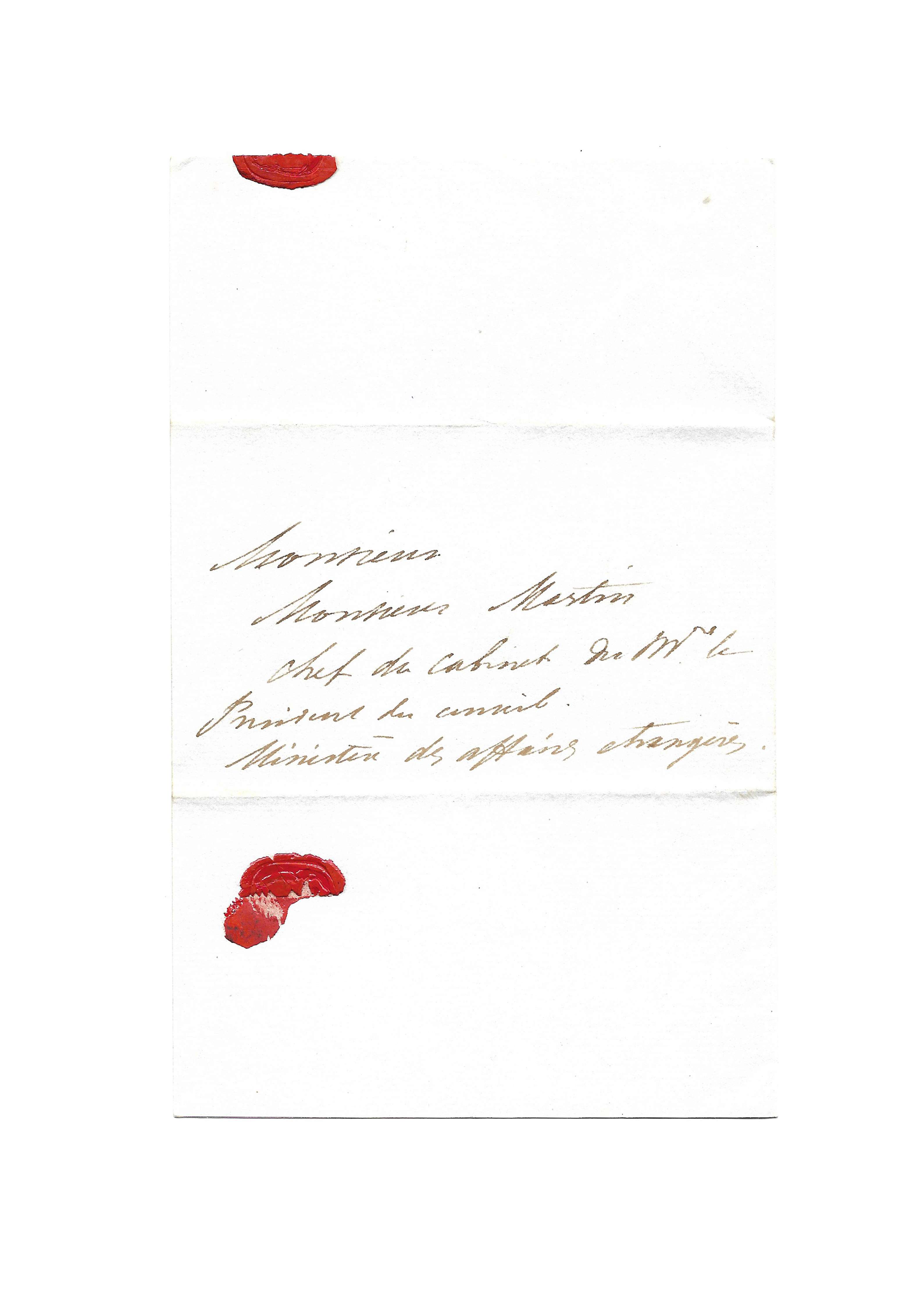 « Mille remerciements pour votre passeport qui est excellent, bien que Mr. Thiers ne veuille pas m’accorder un titre que je mérite mieux qu’il ne pense. »
