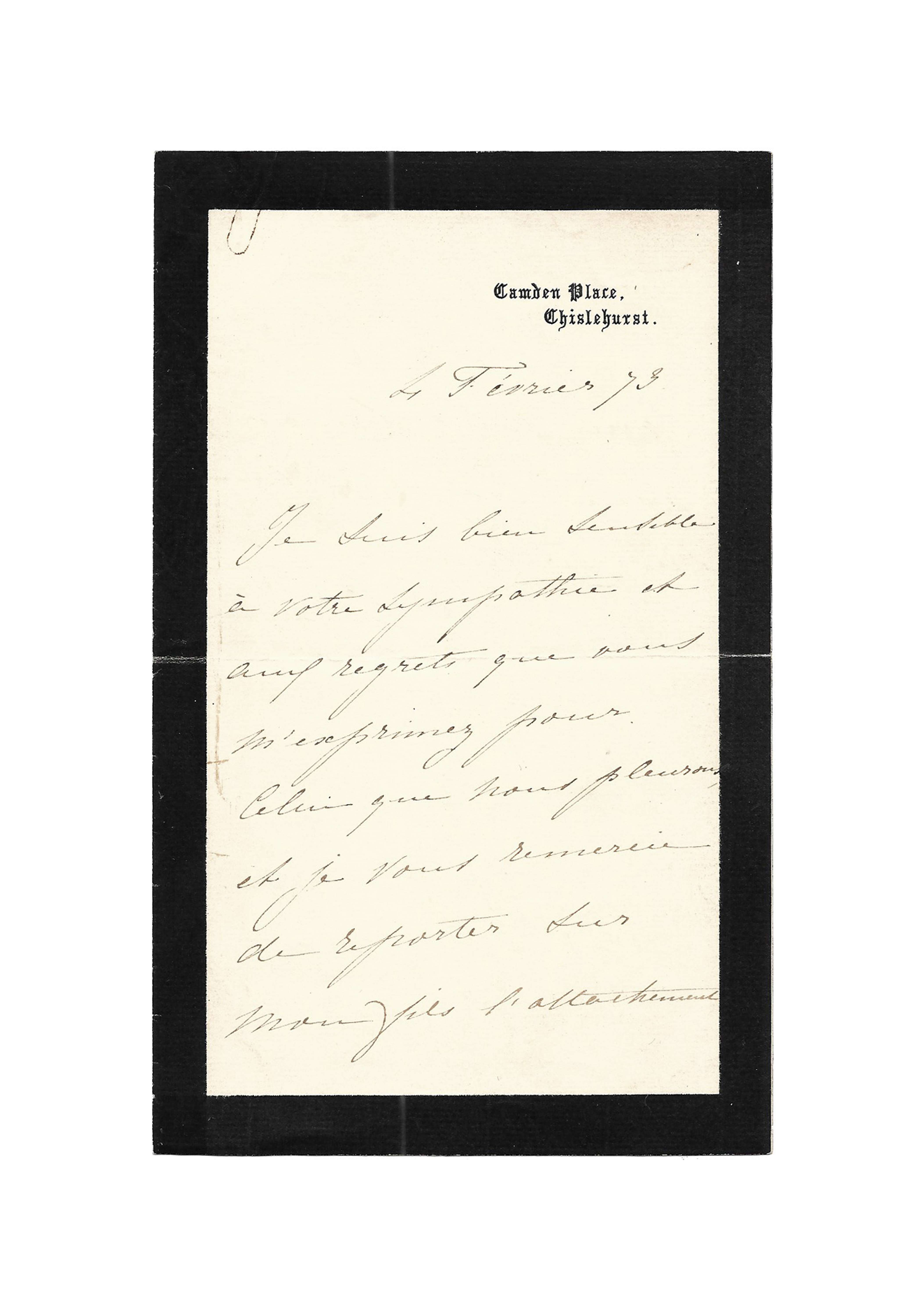 [Camden Place, Chislehurst], 4 février [18]73, 1 p. 1/2 in-8° sur bifeuillet de deuil à en-tête de la résidence d’exil de la famille impériale