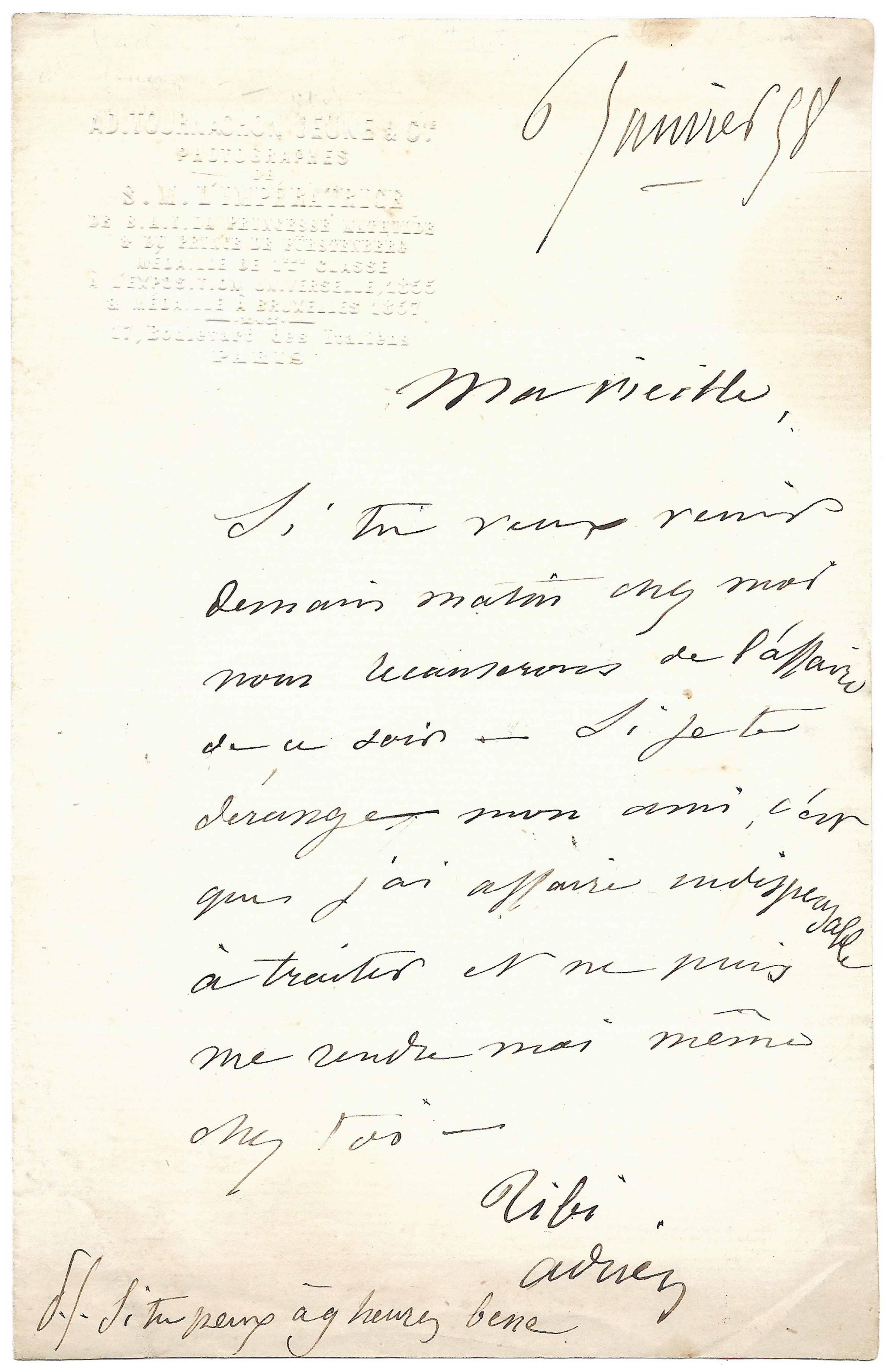 [Paris], 6 janvier 1858, 1 p. in-8 à en-tête gaufrée